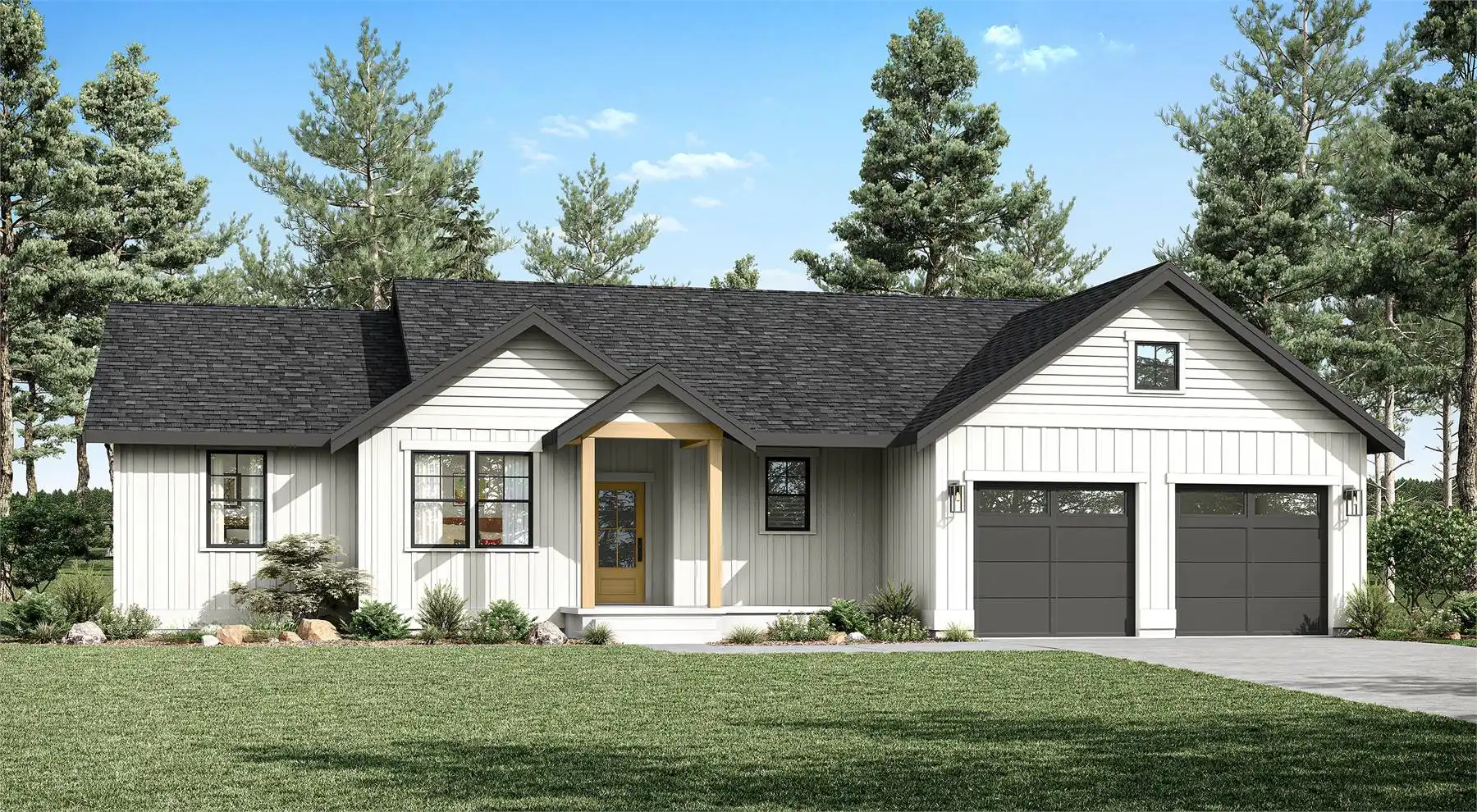With 1,674 square feet and four split bedrooms, House Plan 8002 makes a wonderful starter home for a growing family! It spreads all its spaces across one convenient level and comes wrapped up in a classic gabled ranch exterior that will fit into suburban and rural locales with ease. Inside, you'll enjoy a stunning vaulted great room that visually combines all the common spaces. The primary bedroom suite has a four-piece bath and a walk-in closet while the other three bedrooms on the opposite side of the house share a three-piece hall bath. The laundry/mudroom also connects the two-car garage to the foyer to consolidate the main entries. House Plan 8002 is a nifty smaller home that lives large within a simple, budget-friendly shape, so look no further if that's what you need!