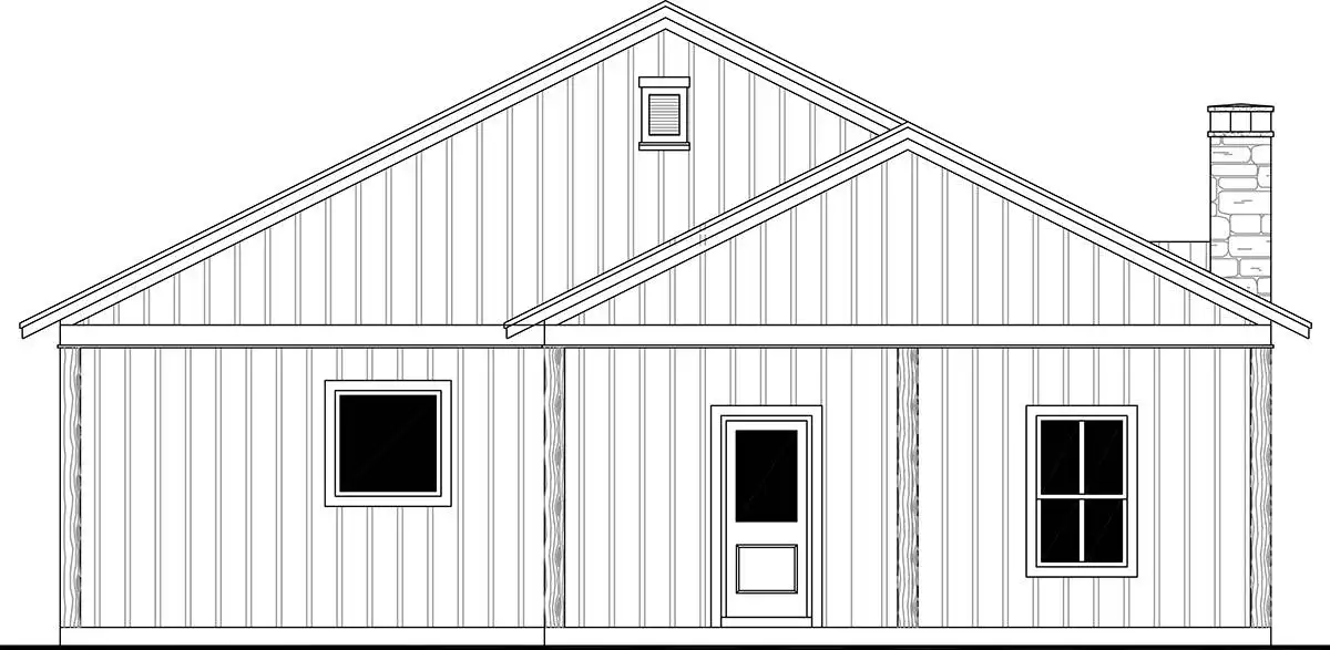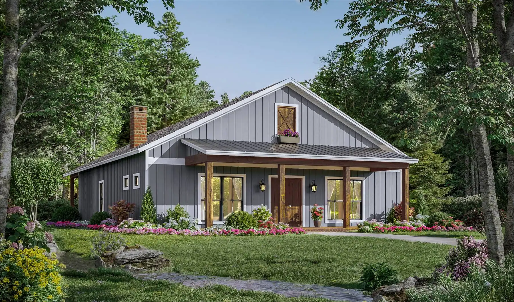 House Plan 8037 is a one-story barndominium with three bedrooms and two-and-a-half bathrooms in a rectangular footprint that's affordable to build. A single gable roof and covered porches in front and back complete the country look. Inside, you'll find 1,800 square feet with living spaces in front and the bedrooms in back. A cathedral vaulted ceiling spans the whole great room, from the fireplace in the living space to the back wall of the island kitchen. There's also a walk-in pantry with additional freezer space and a laundry room to the side of the kitchen. Head down the hallway and you'll find a powder room and the five-piece master suite on one side and a pair of Jack-and-Jill bedrooms on the other. Just imagine how you could live in this functional floor plan!