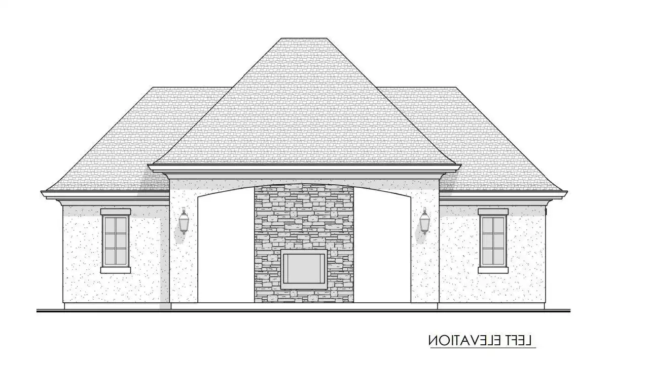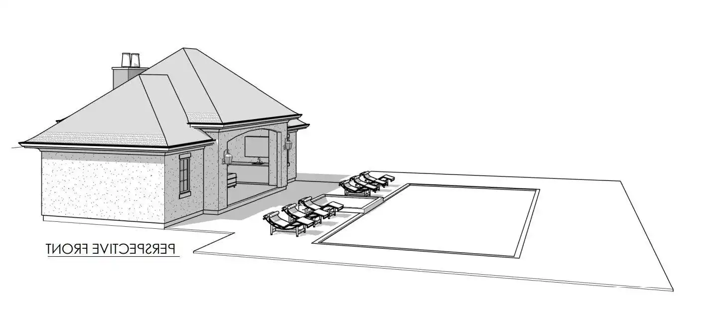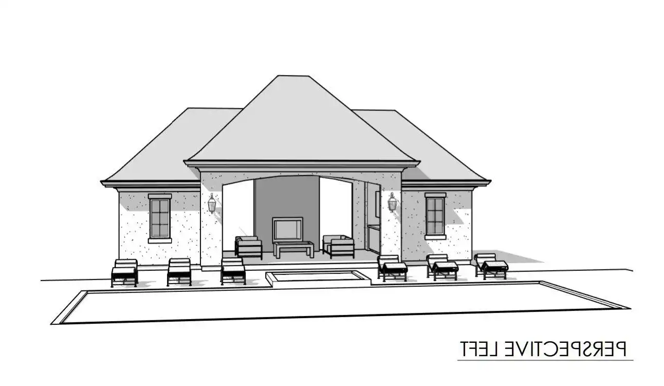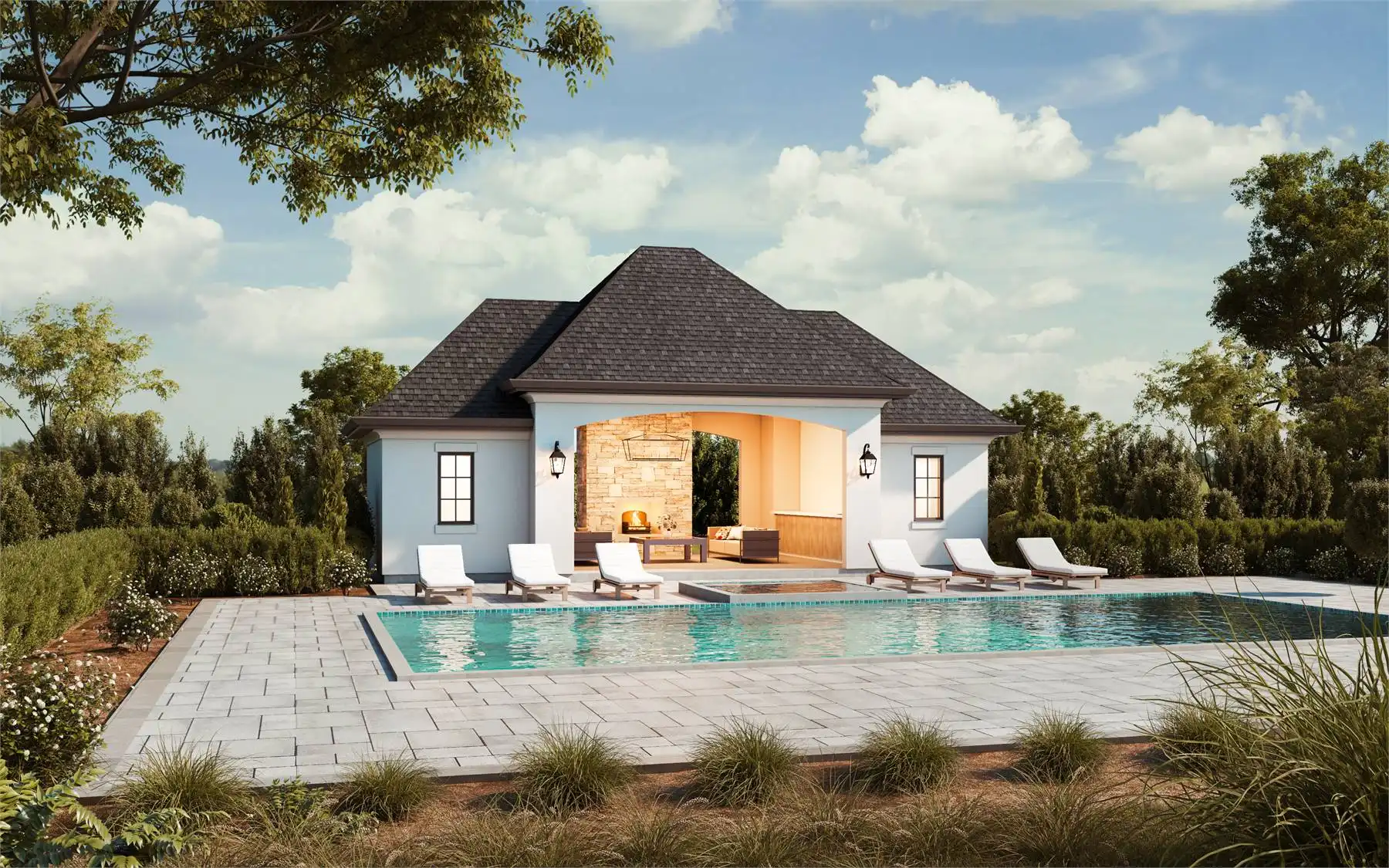 You can add a stylish pool house or covered outdoor living space to your property with House Plan 8047! This Euro-inspired design with hipped rooflines offers breezy lounge space with a fireplace. There's also a changing room and a half bath, in addition to a room for your pool mechanicals.