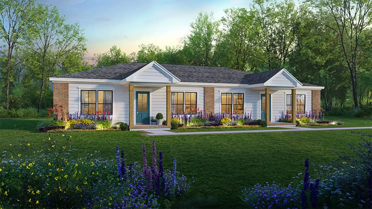 House Plan 8059 is a super affordable duplex with a simple, easy-to-build shape, so look no further if you need a budget-friendly investment property! The mirror image units offer 1,216 square feet, two bedrooms, and two bathrooms. The bedrooms flank the long foyer, with a full suite on one side and a bedroom beside a hall bath on the other. The open living areas sit privately in back--check out the corner kitchen with the laundry closet adjacent for convenience! The great room also connects to the back patio. Just imagine how you could finish this design to appeal to any market!