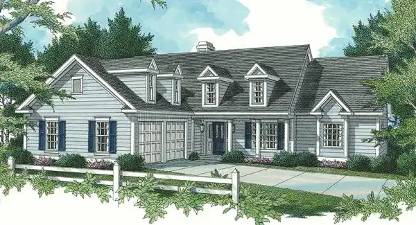 Four dormers enhance this lovely country home design with three bedrooms. A fireplace warms the living room. The vaulted breakfast room is bright and cheery.