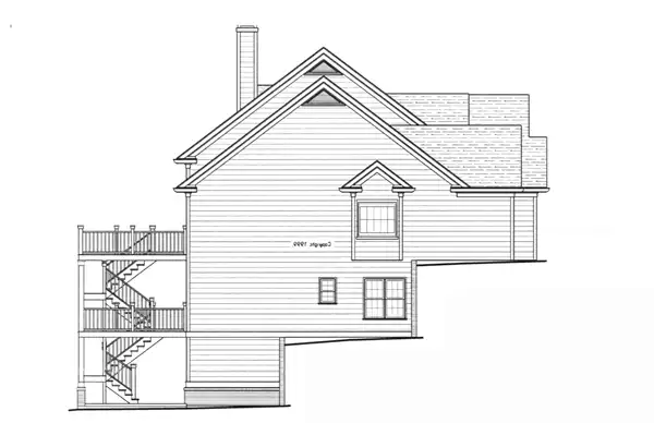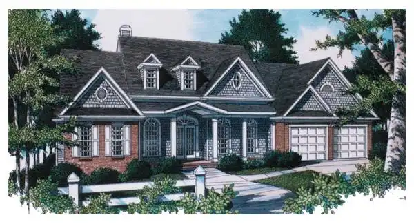 This elegant country cottage features shake siding with brick accents, charming gables and a gracious front porch. The plan is designed for a steep down-slope lot surprising guests by its unconventional upside down design. Foyer stairs lead down to the secondary areas of the house. Even more surprising is your entry into a lower loft that overlooks a two-story recreation room, taking full advantage of the severe hillside condition it was designed for. On the main level a spacious amenity packed master suite dominates one whole side of the house featuring oversized his and hers closets, a walk-in shower and long vanity with angled side mirrors. The kitchen opens to the cozy breakfast/keeping room that doubles as a sunroom. The lower level features one bedroom with private bath and two with a Jack & Jill bath arrangement. The ground level offers the option of a fifth bedroom and bath, recreation room and some basement storage. Another unique feature is the suspended garage slab allowing for additional basement storage on the middle level.