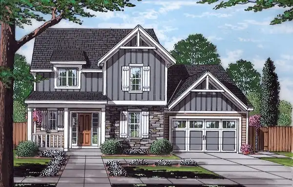 This three-bedroom two-story home offers an open concept great room, kitchen with island, and dining area with access to a rear covered porch. A covered front porch decorates the exterior and offers a warm and inviting welcome. 8' ceiling heights and an 8:12 pitched roof offer price saving features. U shaped stairs lead to a second-floor balcony that overlooks the foyer and leads to a master suite that enjoys a double bowl vanity, walk-in shower and large walk-in closet. This home is drawn with a full basement for added storage or can be finished to provide additional square footage if desired.