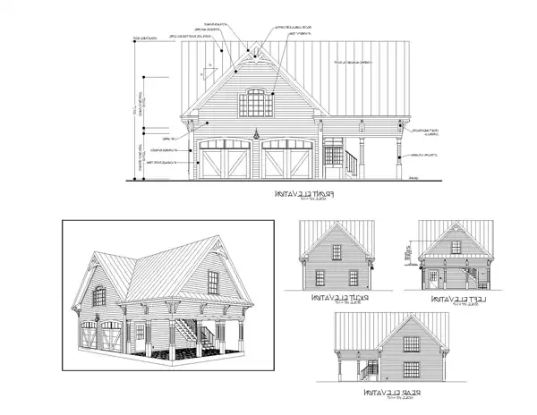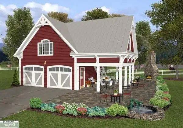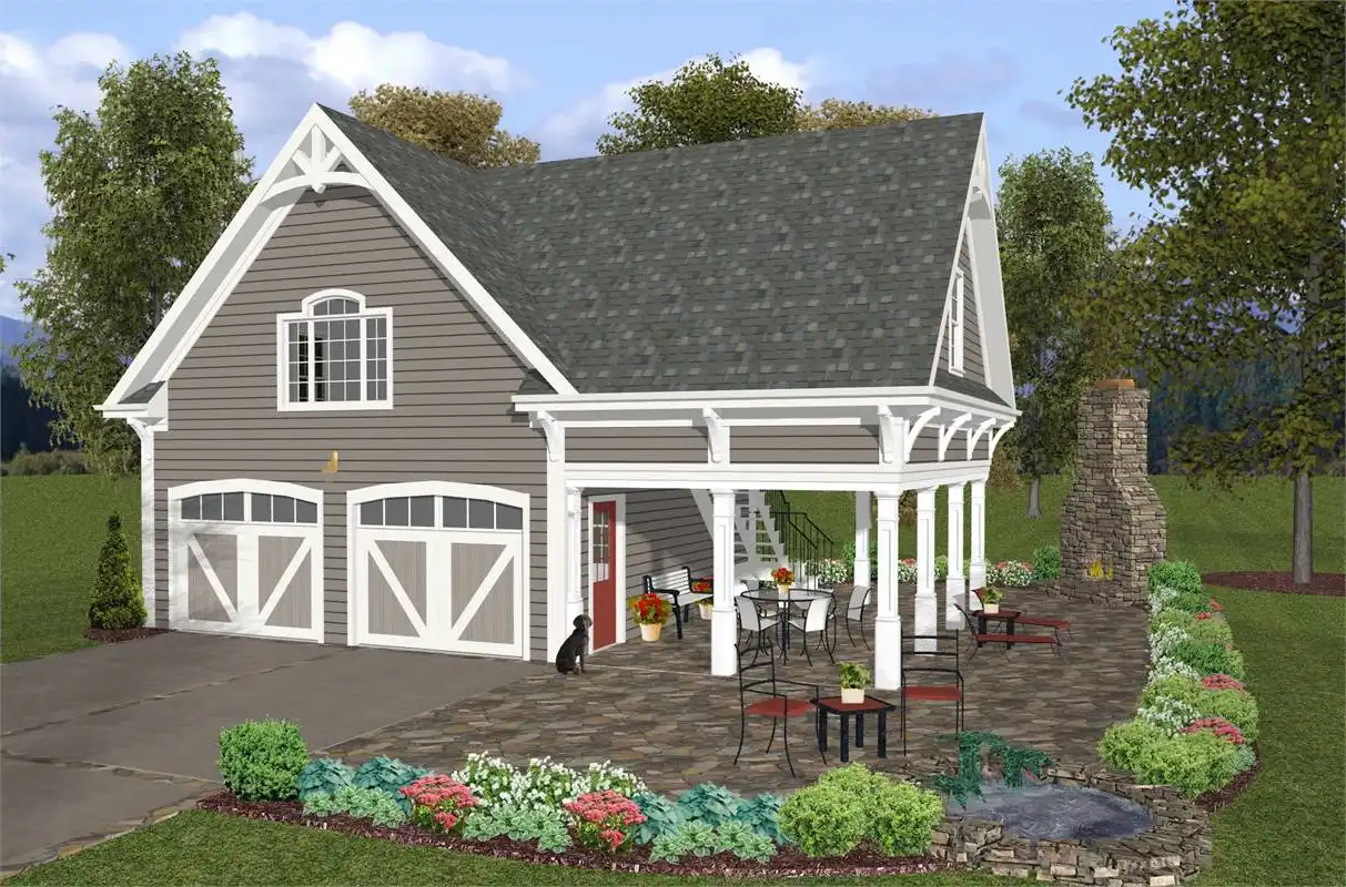 The Charleston Carriage House is a 2 car garage with 792 sq. ft. of living quarters above. With siding exterior and decorative details, this plan is reminiscent of a country barn. It would be perfect temporary quarters during construction of your permanent home. Or it could serve as an in-law apartment, nanny quarters, college student apartment, etc. This design features an eat-in kitchen area, a spacious family room, a bathroom and a bedroom with both a clothes closet and storage closet. Two more closets, as well as an oversized pantry, provide maximum storage in minimum space. Laundry appliances could be positioned in the garage adjacent to the mechanical area. A shady covered porch is perfect for relaxing with friends. We have shown an outdoor fireplace in our rendering to help you plan your recreational space.