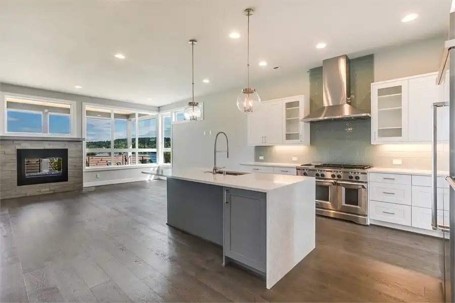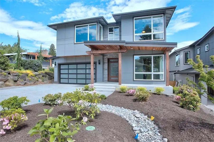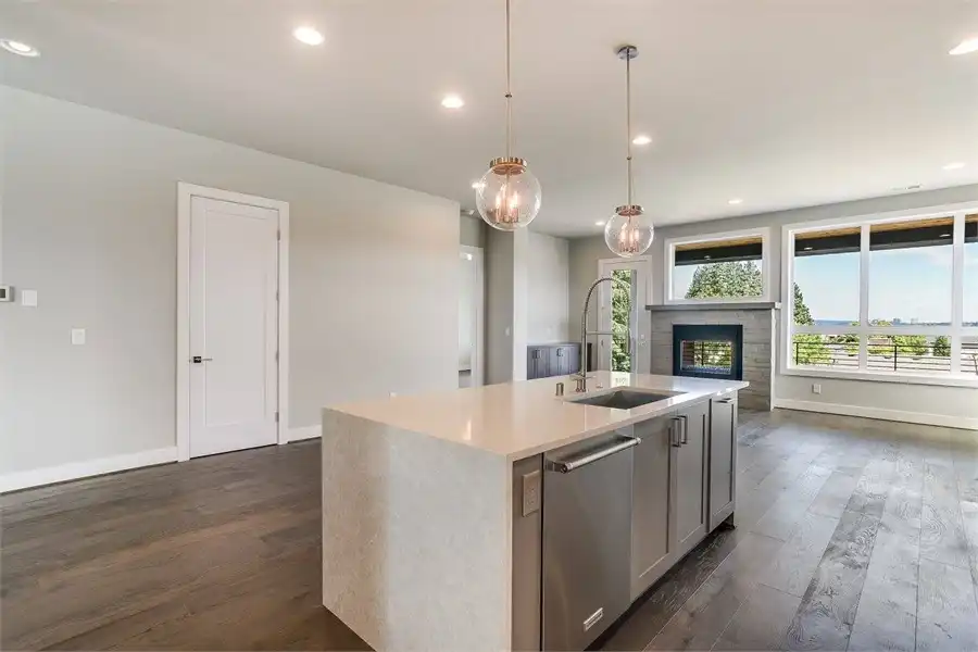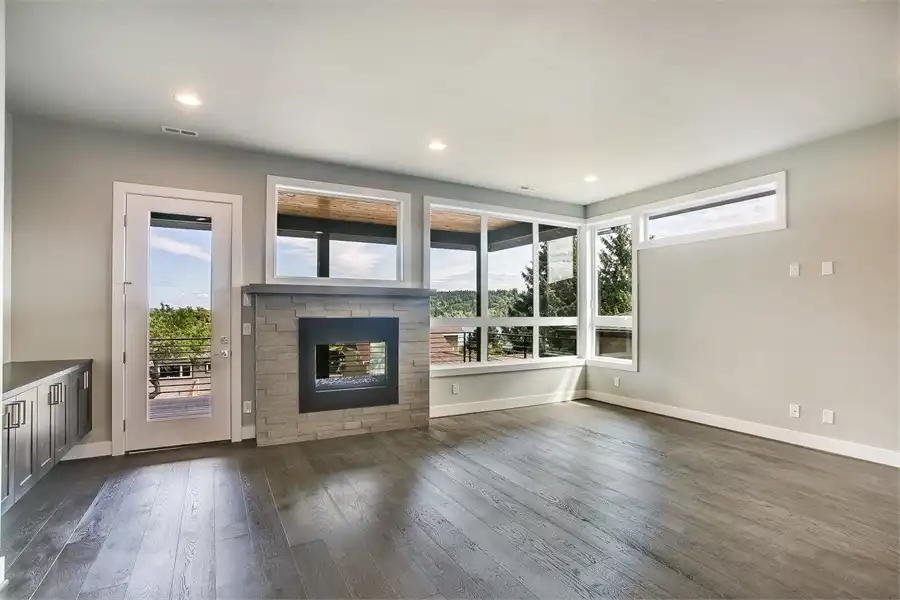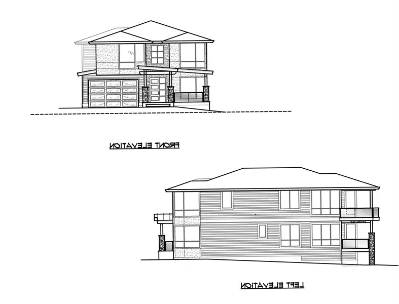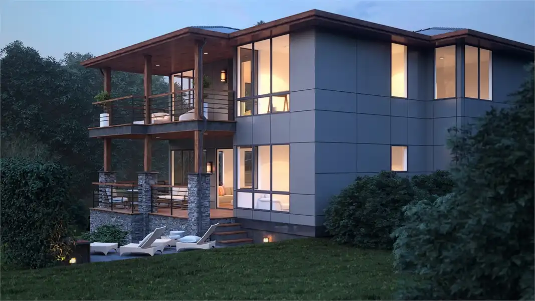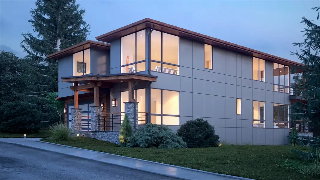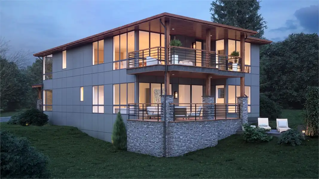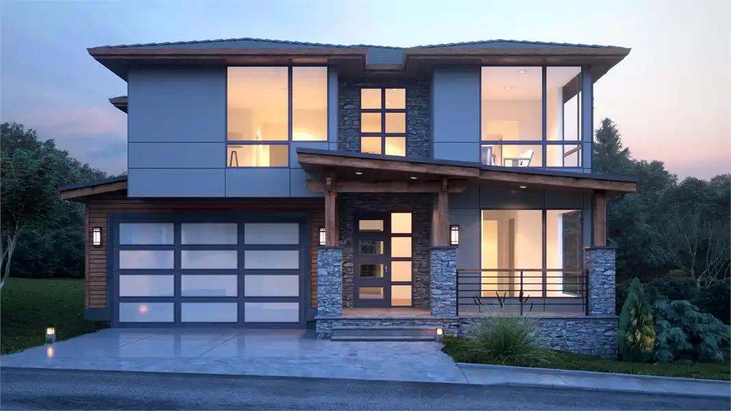 The perfect home for those who love breathtaking views every day, this 2-story, 3,315 square foot contemporary plan has a lot to offer. The most striking thing besides the exterior, is the fact that this plan has a reversed layout, meaning that your living spaces are on the second floor, along with large windows on practically every wall! You'll enjoy the spacious 3 beds and 3.5 baths, beginning with the first level which has 2 of the bedrooms, each with their own full bath, and a large rec room along with a 3-car garage. Upstairs has your gourmet kitchen and open family room, along with the master suite, a formal dining room, and even a private den/office! Take note of the little features that complete this home, including the double-sided fireplace that warms both the family room and the covered deck out back.