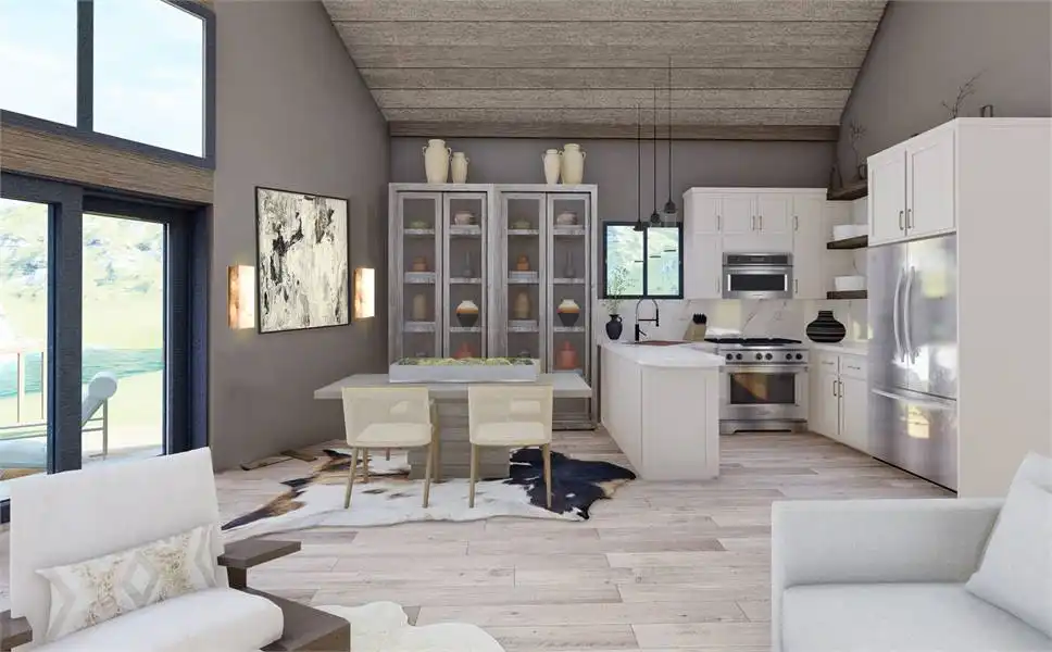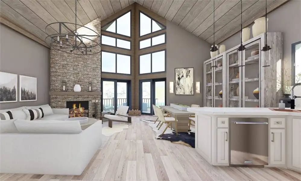 A wraparound deck and soaring windows are some eye-catching elements. The living and dining areas open to the front deck, including a stone fireplace and high ceilings 21 ft. high. The master suite includes large closet luxurious bath and 14 ft. high ceilings.
