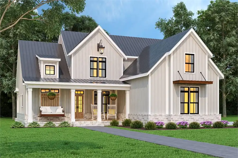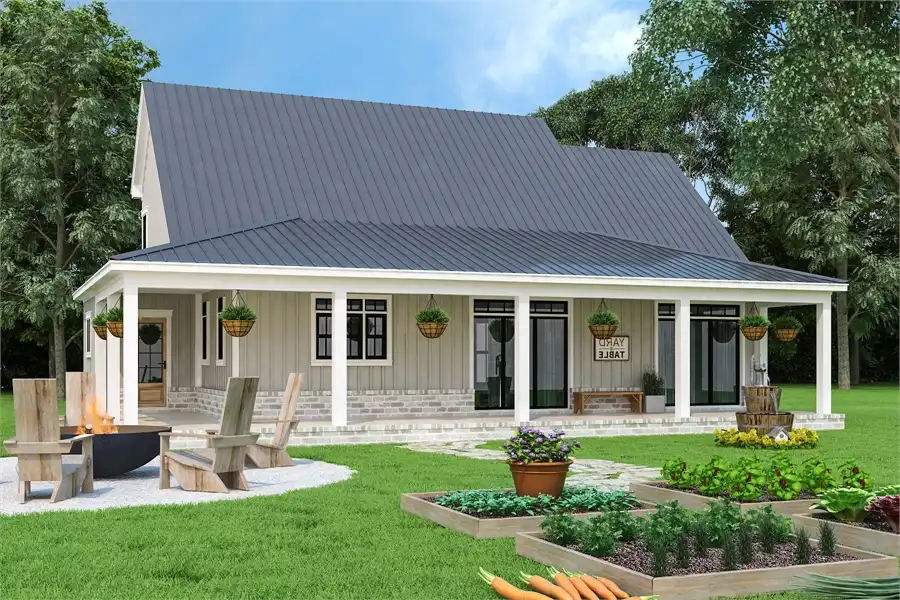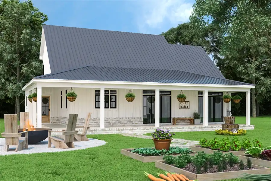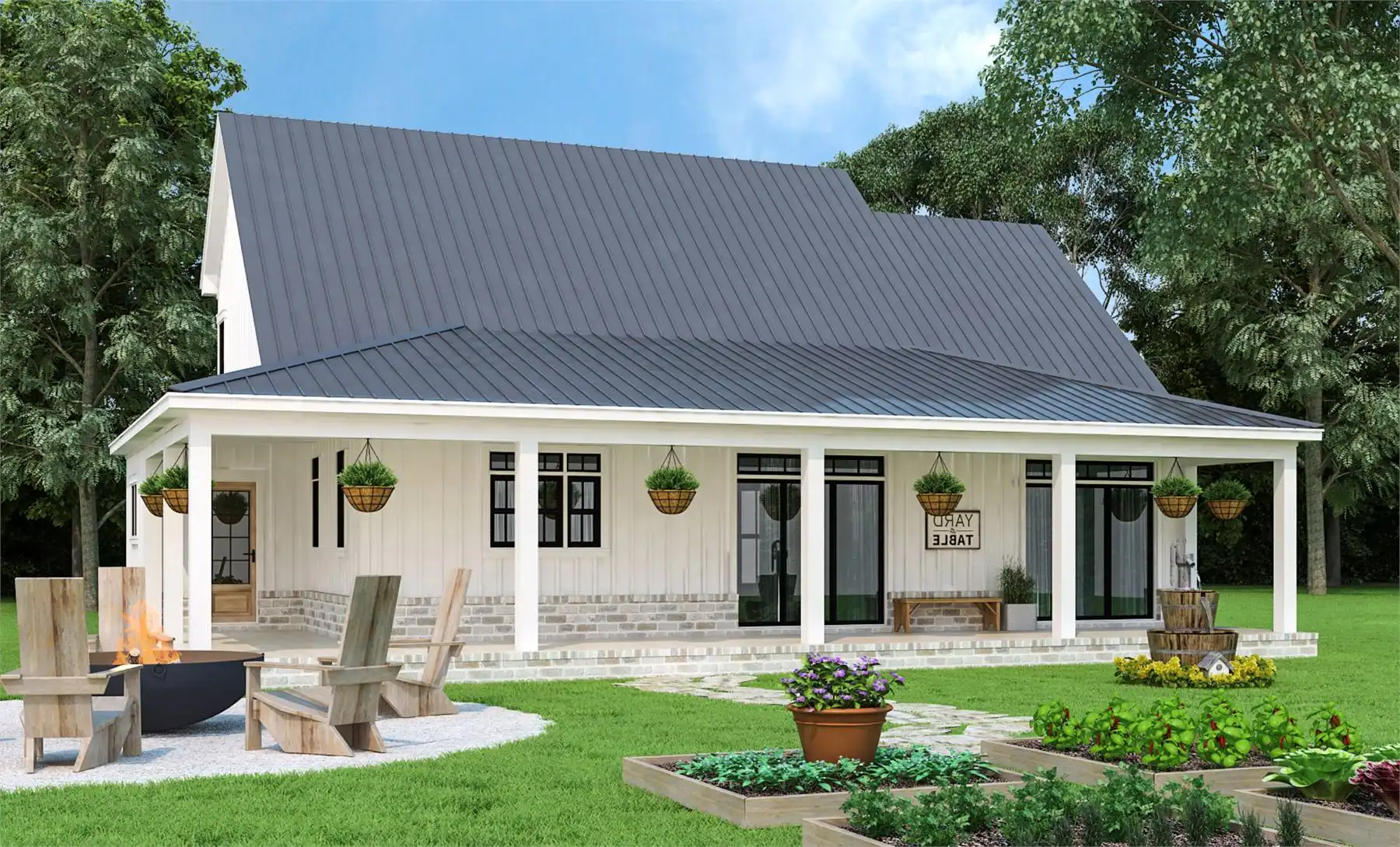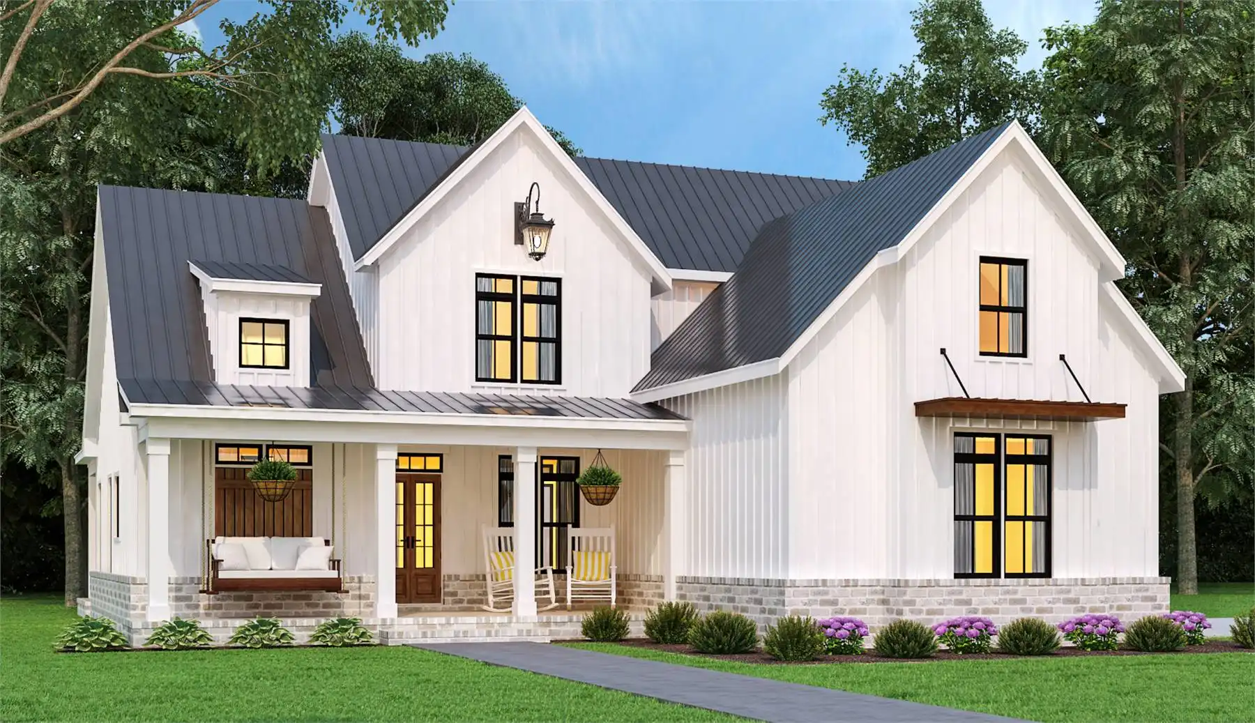 Sensibly designed with tons of style, this farmhouse plan features 3 bedrooms, 3.5 bathrooms, a sprawling wraparound rear porch, and functional multipurpose laundry/mudroom. The covered front porch is a friendly welcome to this 1,999 square foot home. Inside, you’ll witness the open floor plan, which flows from the dining room, into the great room and state-of-the-art kitchen. The master suite, also located on the main floor, features a separate tub and shower and large walk-in closet. The first floor is complete with a half bath off the mudroom and a 2-car garage. The upper level of this design offers two secondary bedrooms, each with a walk-in closet and private bath. An unfinished bonus room above the garage can easily be utilized as a 4th bedroom.