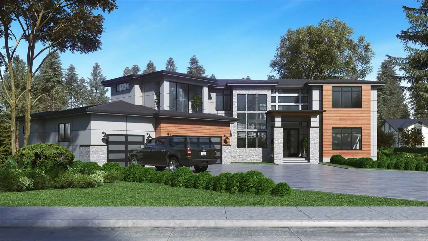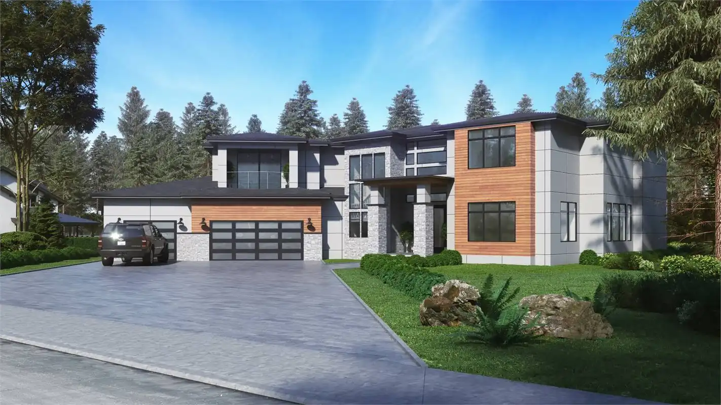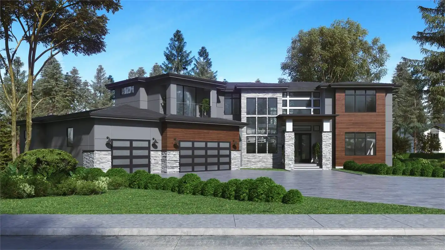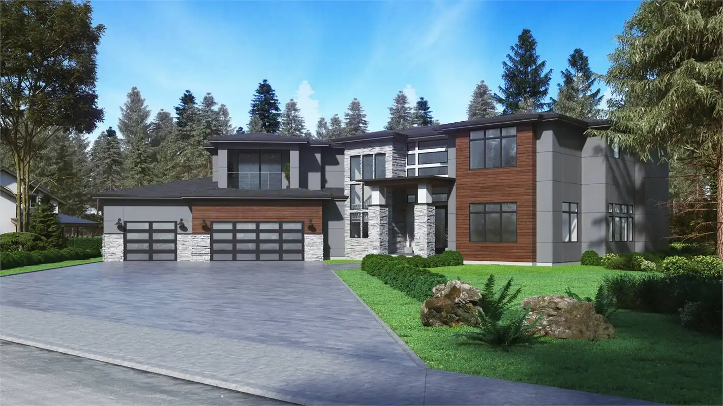 Wow! This incredible contemporary modern open floor plan is sure to amaze you and your guests. When you enter the home, you'll be greeted with a vaulted foyer, which opens up to the formal living and dining rooms. Work from home in the spacious office room. The main level also features the first master suite. In the master suite, you'll find a large bedroom with a sitting area, a walk-in closet, and a luxurious master bathroom with double vanity, a soaking tub, and a glass-enclosed shower. Upstairs, you'll find the second master suite and two additional bedrooms. Play games in the recreation room or relax in the bonus space next to the master suite. The three-car garage provides plenty of storage for your vehicles and toys. Also, there's a shop in the garage for all of your projects. This incredible house plan has everything you need and more!