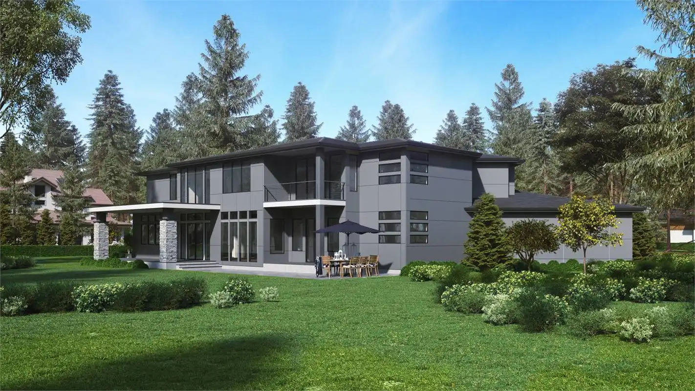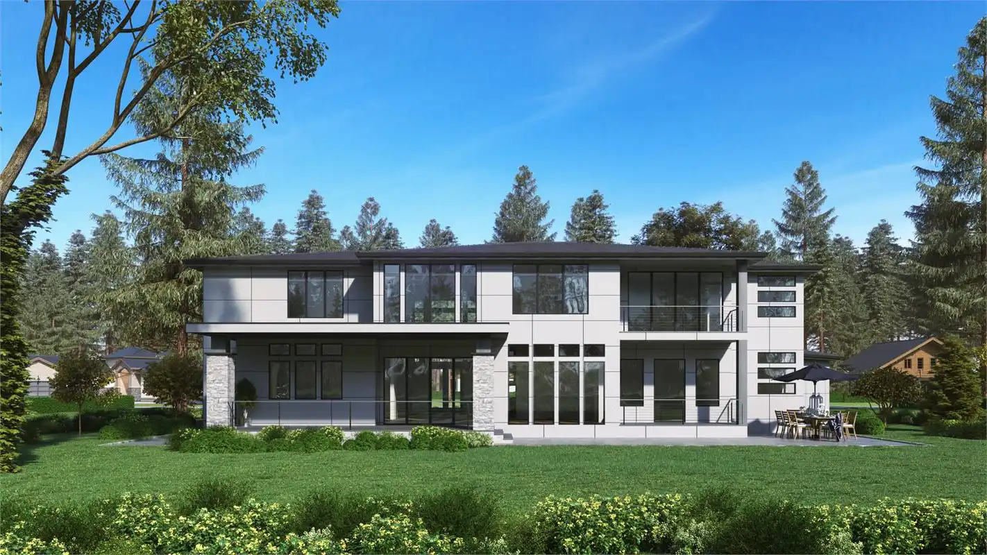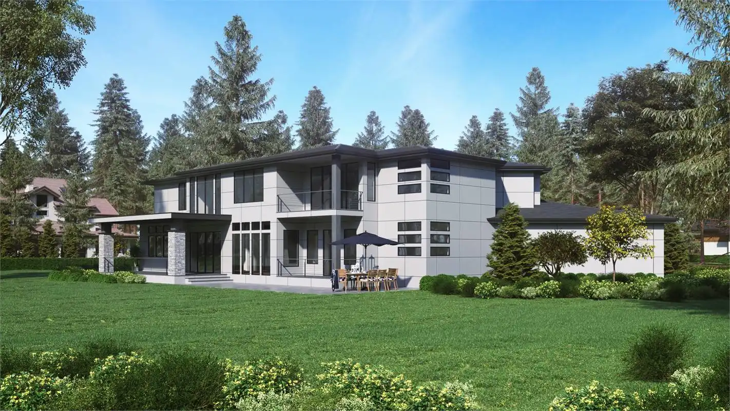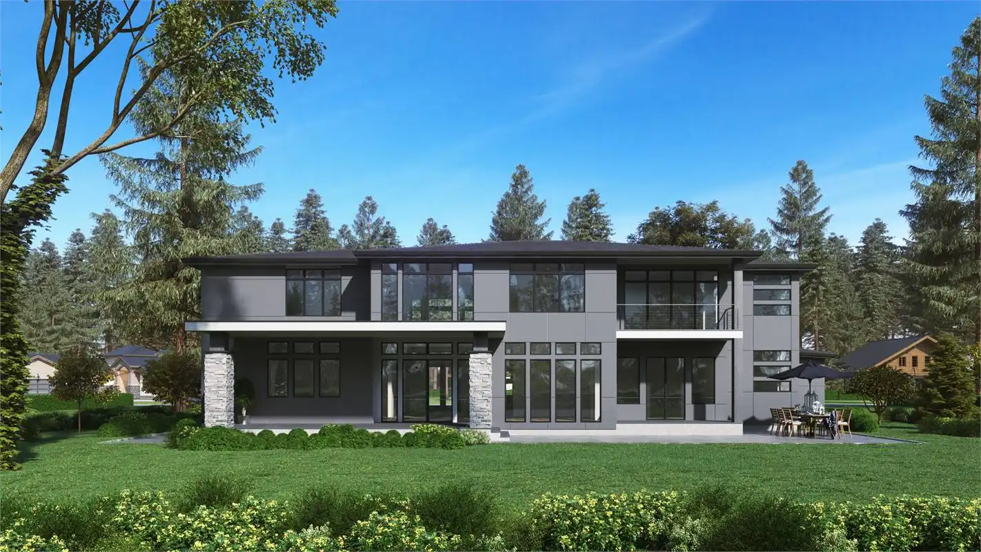 Wow! This incredible contemporary modern open floor plan is sure to amaze you and your guests. When you enter the home, you'll be greeted with a vaulted foyer, which opens up to the formal living and dining rooms. Work from home in the spacious office room. The main level also features the first master suite. In the master suite, you'll find a large bedroom with a sitting area, a walk-in closet, and a luxurious master bathroom with double vanity, a soaking tub, and a glass-enclosed shower. Upstairs, you'll find the second master suite and two additional bedrooms. Play games in the recreation room or relax in the bonus space next to the master suite. The three-car garage provides plenty of storage for your vehicles and toys. Also, there's a shop in the garage for all of your projects. This incredible house plan has everything you need and more!