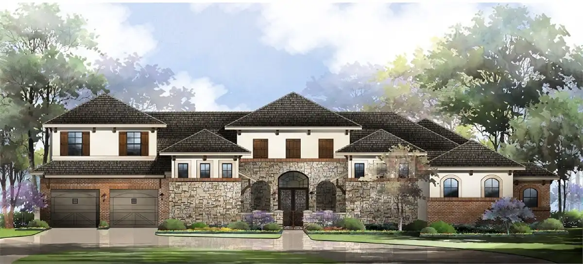 Starting with the beautiful courtyard, which has a bedroom on either side, you'll step through the main entrance of this 3,084 square foot luxury home plan and into the foyer. From there, the expansive gathering area for the family is before you: the family room, kitchen and dining spaces are all part of the open floor plan. The master suite takes up the left side of the home plan and features dual vanity sinks, separate shower and tub and his and hers closet spaces. A gorgeous fireplace, as well as access to the outdoor lounge is also part of the master suite. On the opposite side of the home you'll find a private office, which duals as a storm shelter, powder room, and utility room. The front facing two-car garage has a fully attached work shop. Upstairs, you'll find a bonus room, which opens onto a balcony for views of the backyard.