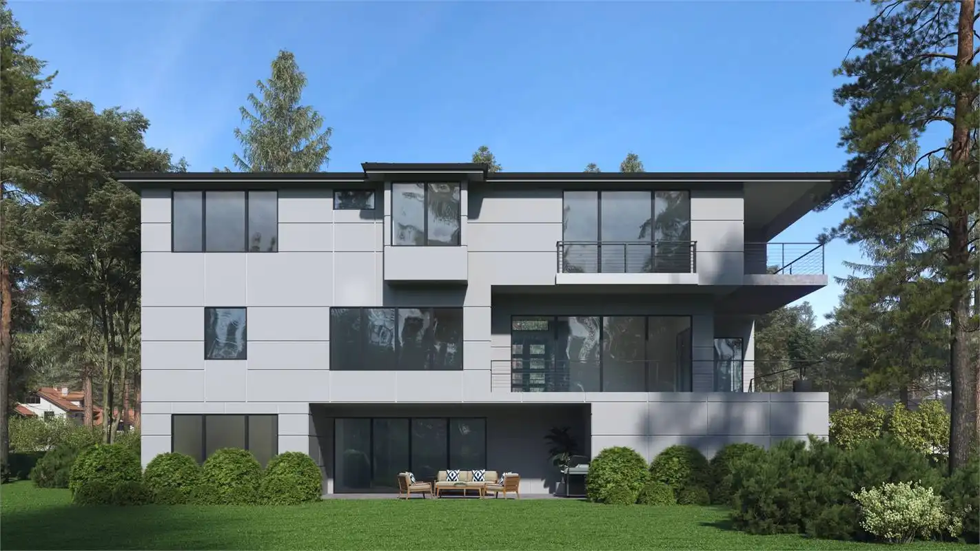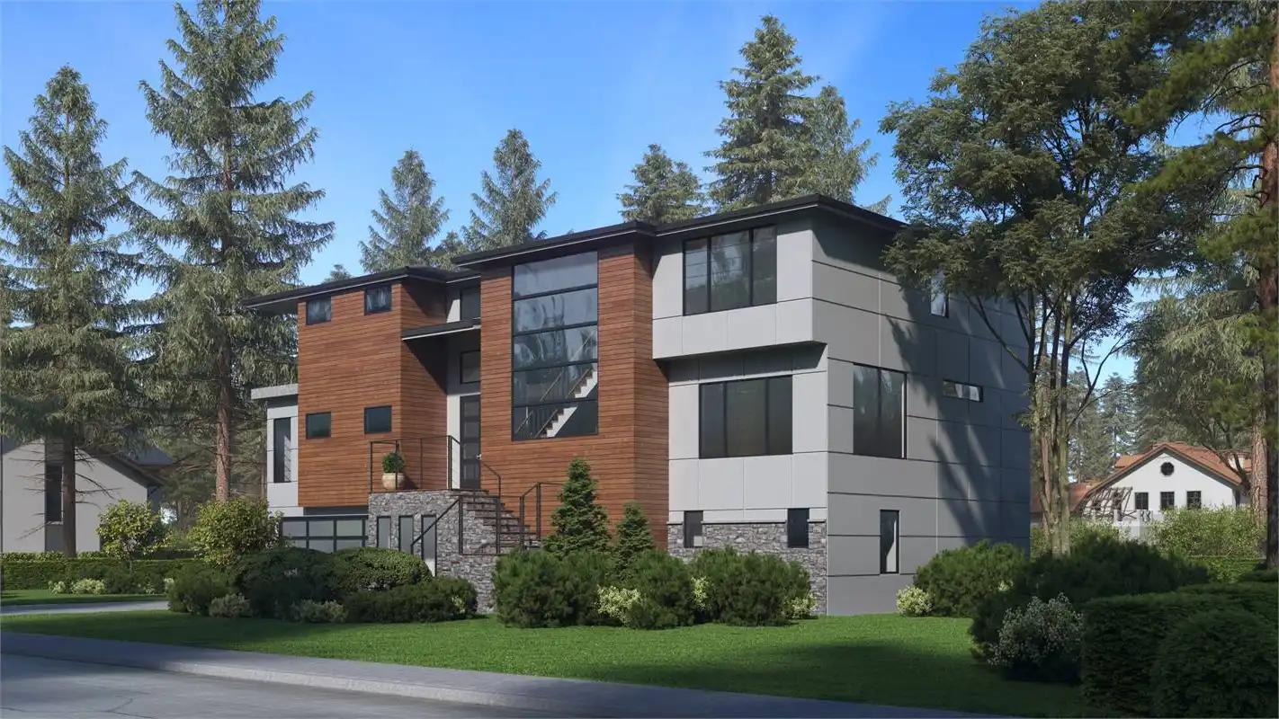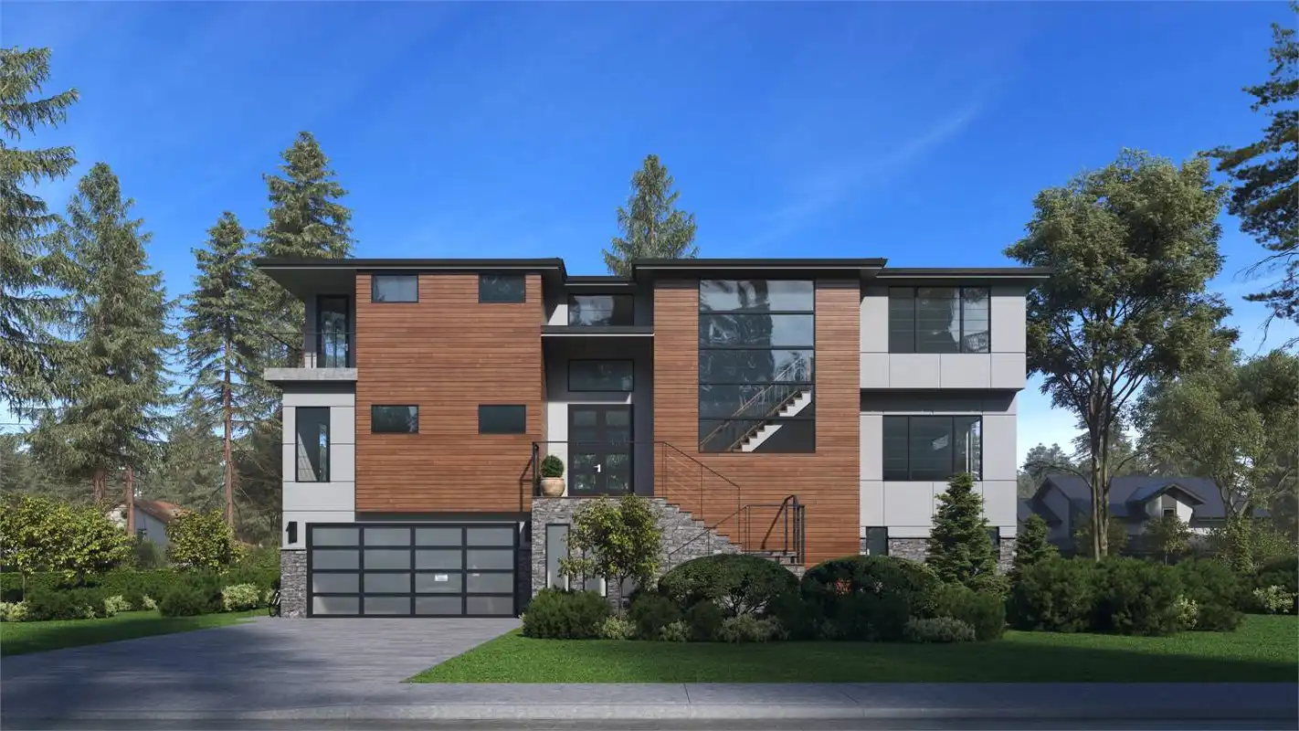 House Plan 8586 is 5,010 square feet with 4 beds and 4.5 baths. This 3-level contemporary modern open floor plan is perfect for the family that loves to entertain and make the most out of their space! The large L-shaped kitchen with an island is open to the dining room, great room, and nook, making it the perfect place for family and guests to gather. The main level also features a den that can be used as a home office or additional bedroom. Head upstairs where you will find the master suite and 3 additional bedrooms. Keep yourself organized with the laundry room conveniently located on the second floor. The lower floor features a spacious 4 car garage, the recreation room, and an additional guest room. This house plan has everything you need and more!
