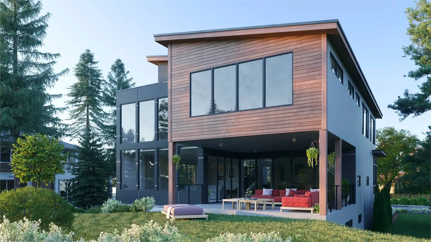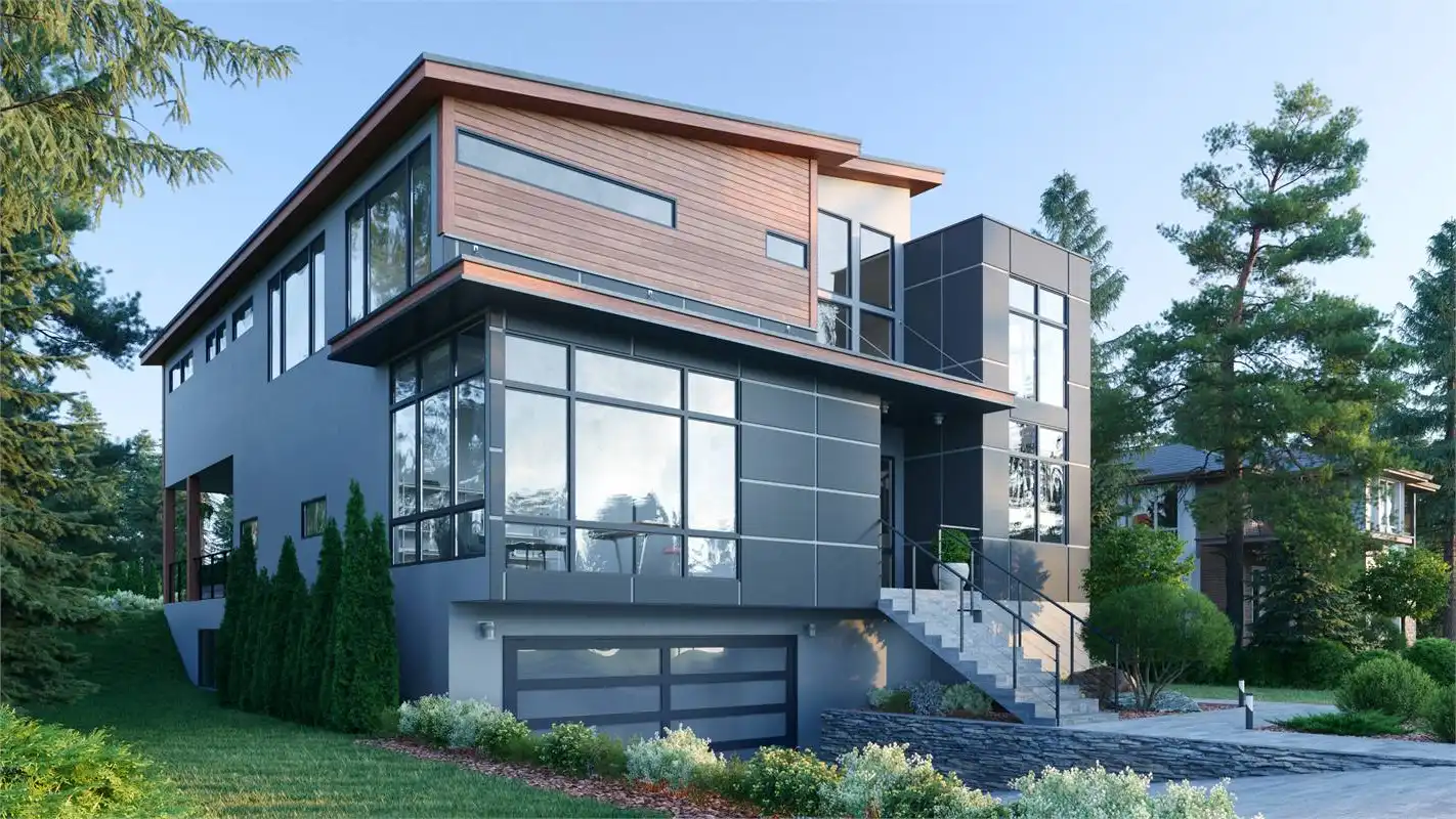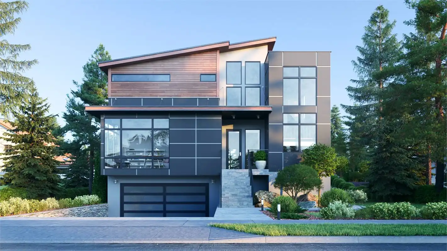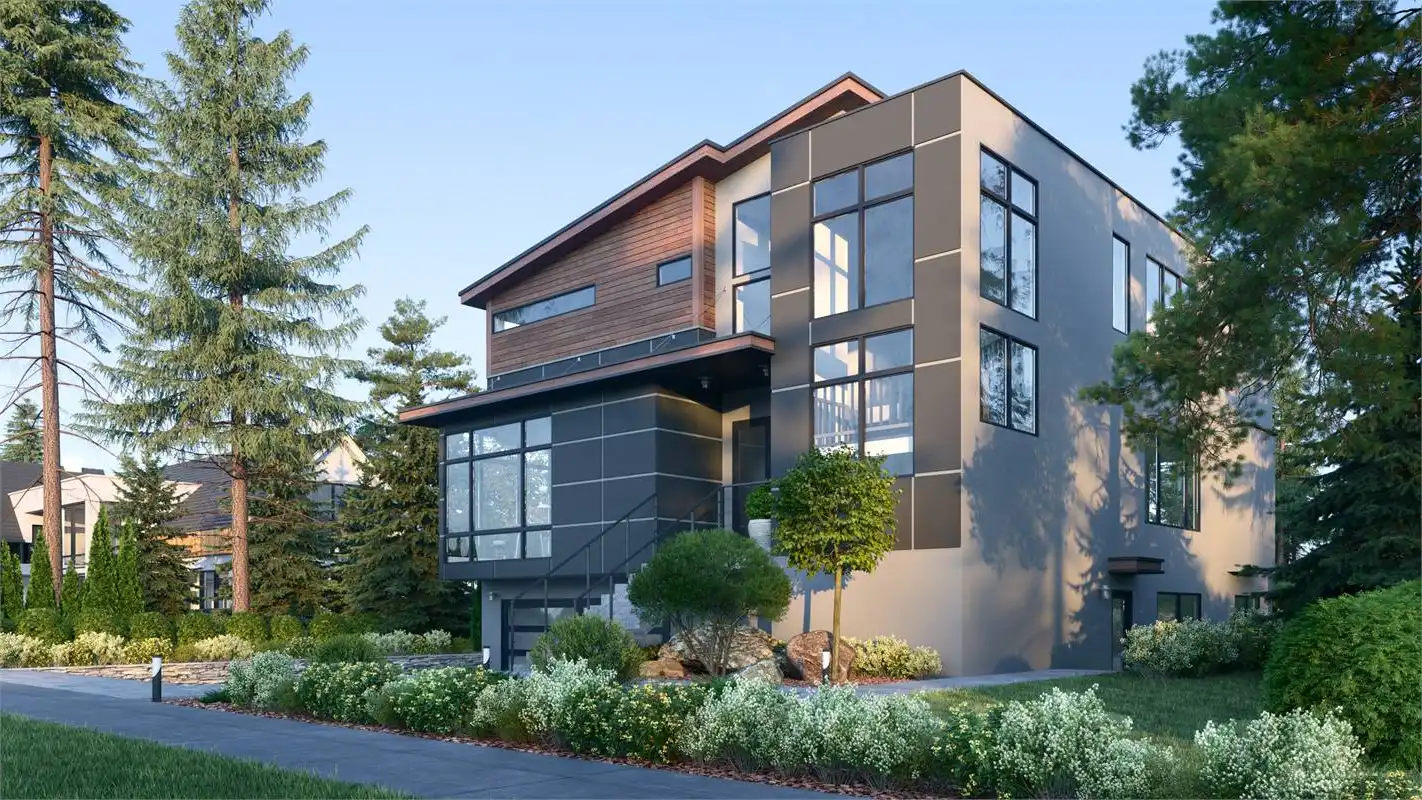 House Plan 8592 is a 4-bedroom, 2.5-bathroom contemporary modern home with an open floor plan and 999 s.f. lower level apartment. This luxurious home features a formal living and dining room, a family room with a fireplace and french doors that open to the rear porch, and a gourmet kitchen with a center island, breakfast bar, and walk-in pantry. The first-floor office looks out into the front yard and is perfect for working from home. Upstairs you'll find the luxurious master suite features a sitting area, his and hers walk-in closets, and a lavish master bathroom with a tub, separate shower, and dual vanity sinks. Additional features of this home include a vaulted entry and great room, a 2-car garage, and plenty of storage. With over 3,000 square feet of living space and in-law or rental apartment, this home is perfect for a large family.