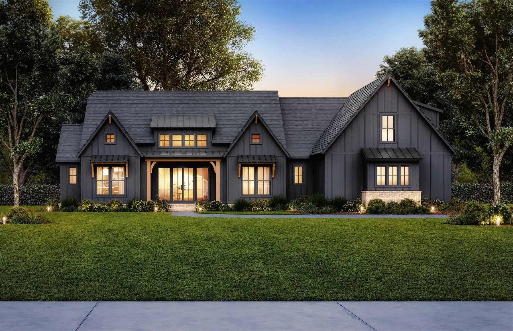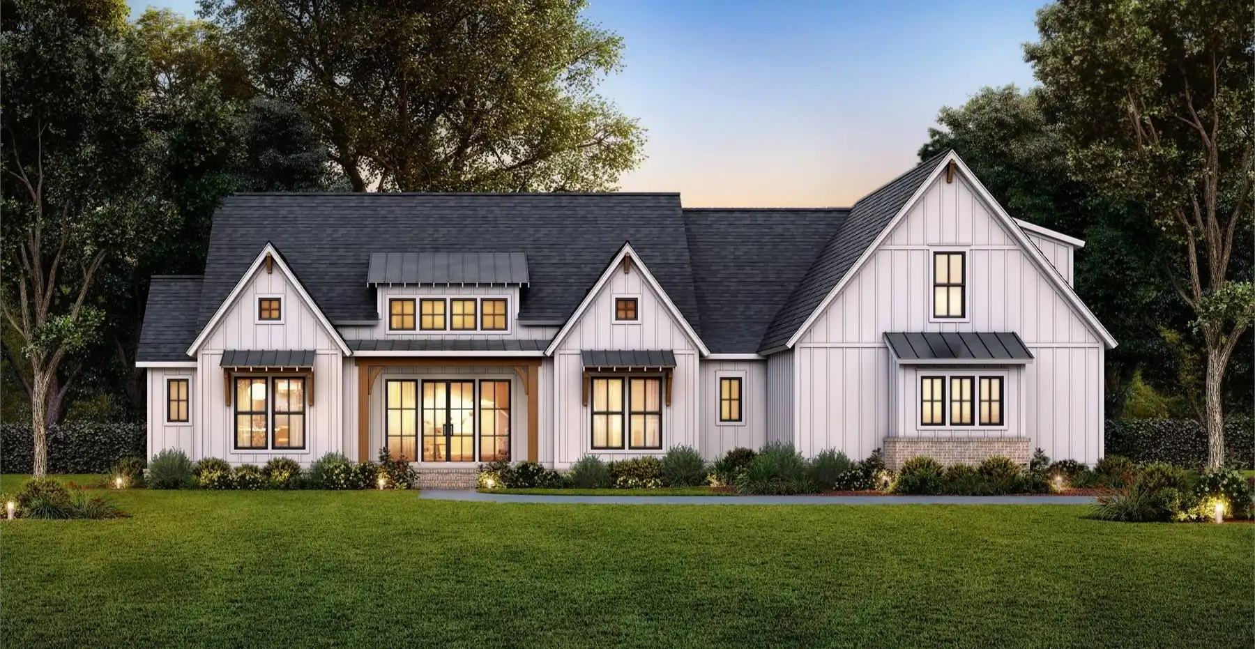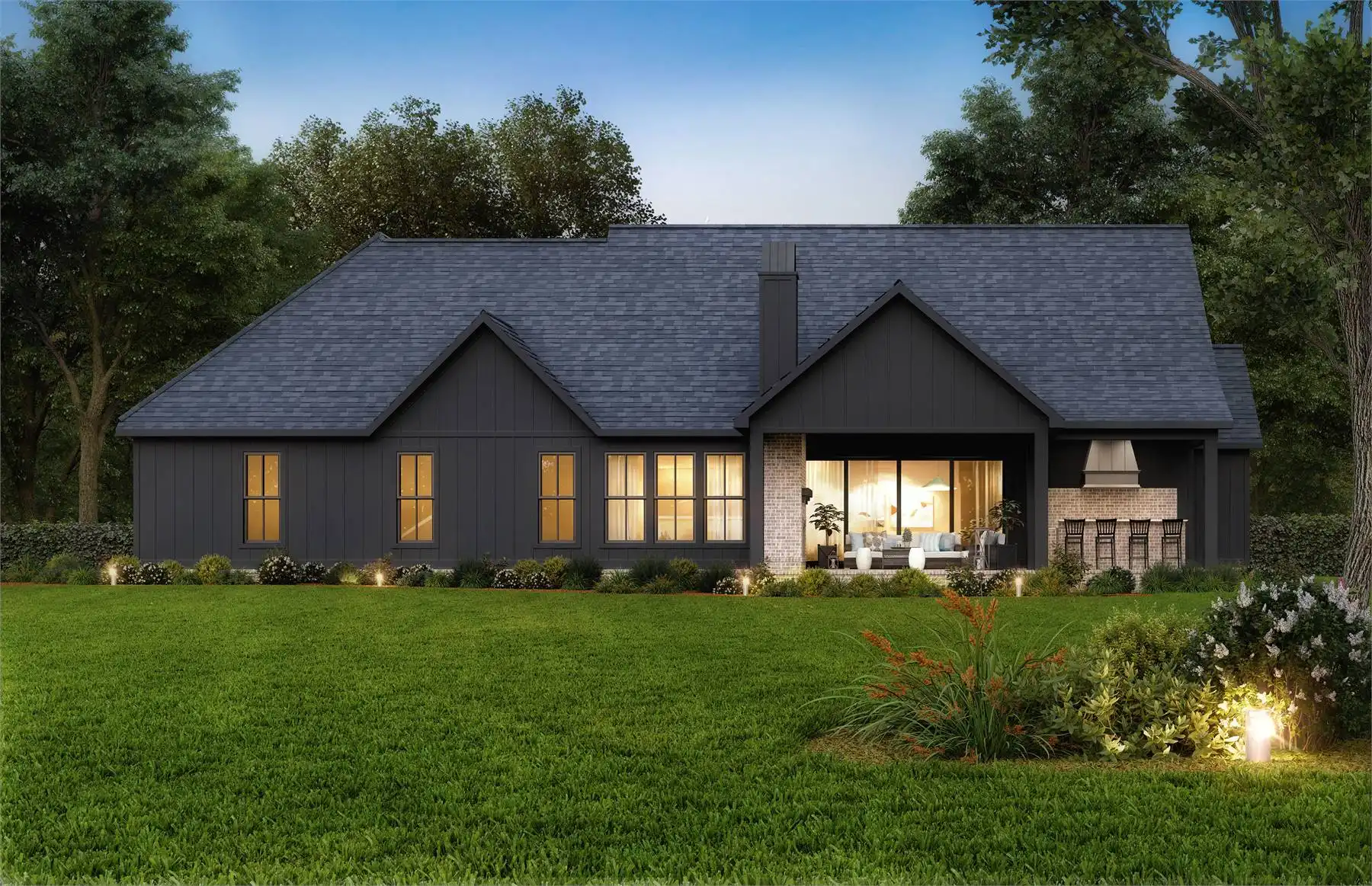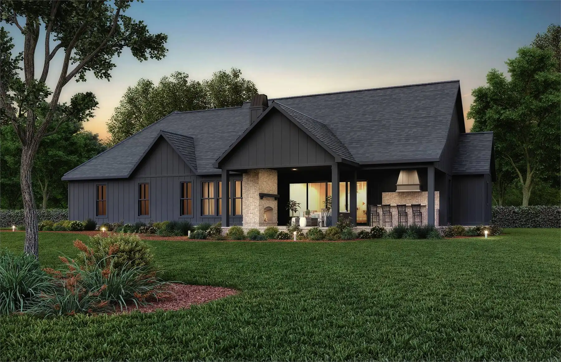Need an amazing farmhouse for a family? Give House Plan 8593 your consideration! This 2,578-square-foot country-style ranch offers open living, four split bedrooms, and outstanding outdoor potential with an outdoor kitchen and fireplace. The vaulted great room makes up the heart of the home; it's open to the island kitchen, which sits beside the dining area, and connects to the back porch through patio doors that slide from the center to really open up the feel. The vaulted master suite and its luxurious five-piece ensuite sit behind the kitchen, along with the laundry room and mudroom entrance coming in from the garage. Two secondary bedrooms share a hall bath behind the great room's fireplace, while the last bedroom is directly off the foyer and would make a great office, if you prefer. Finally, there's a bonus with a full bath over the garage that can provide whatever else you may need. House Plan 8593 would make a great choice for a neighborhood or to build out on acreage!