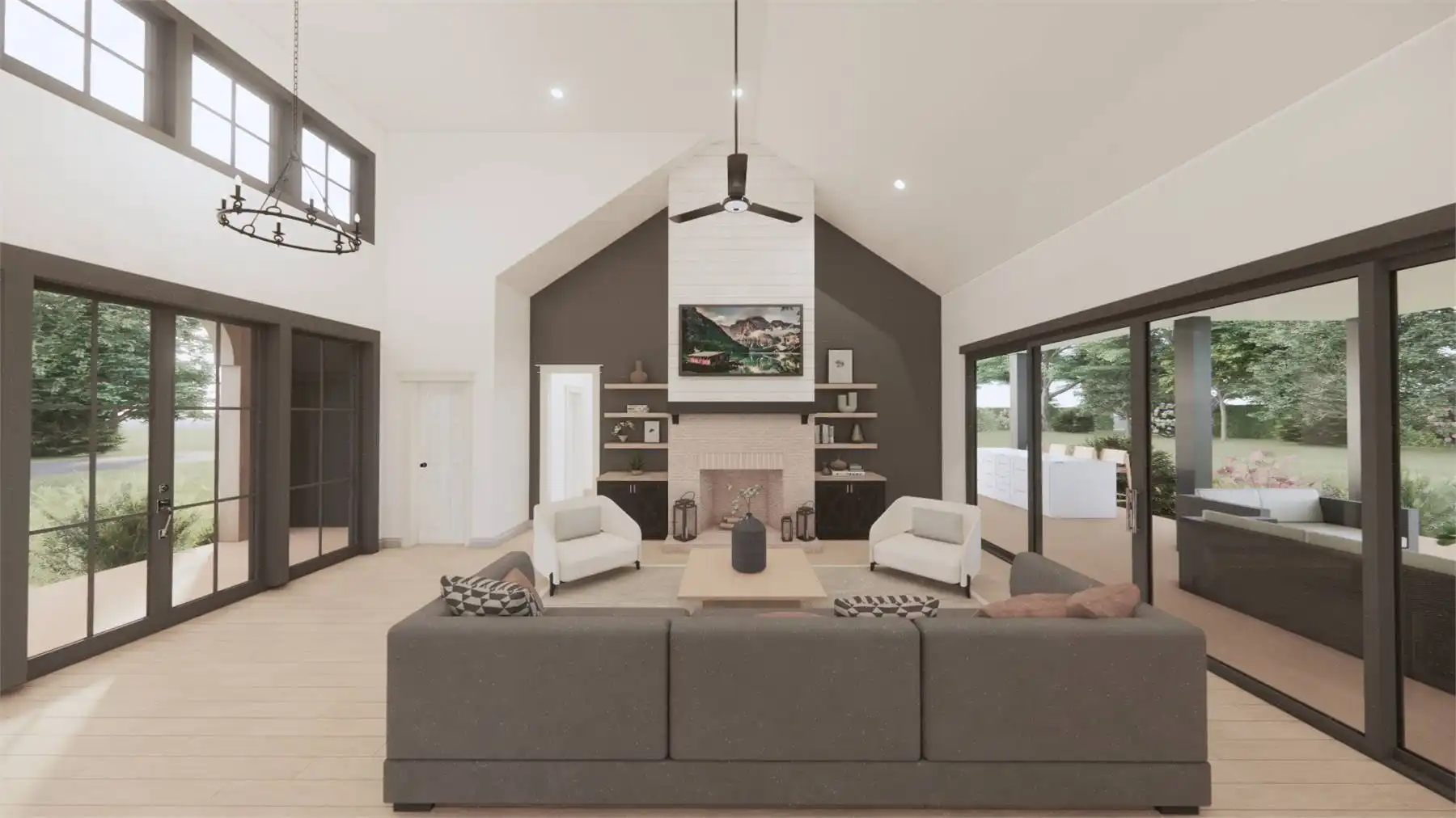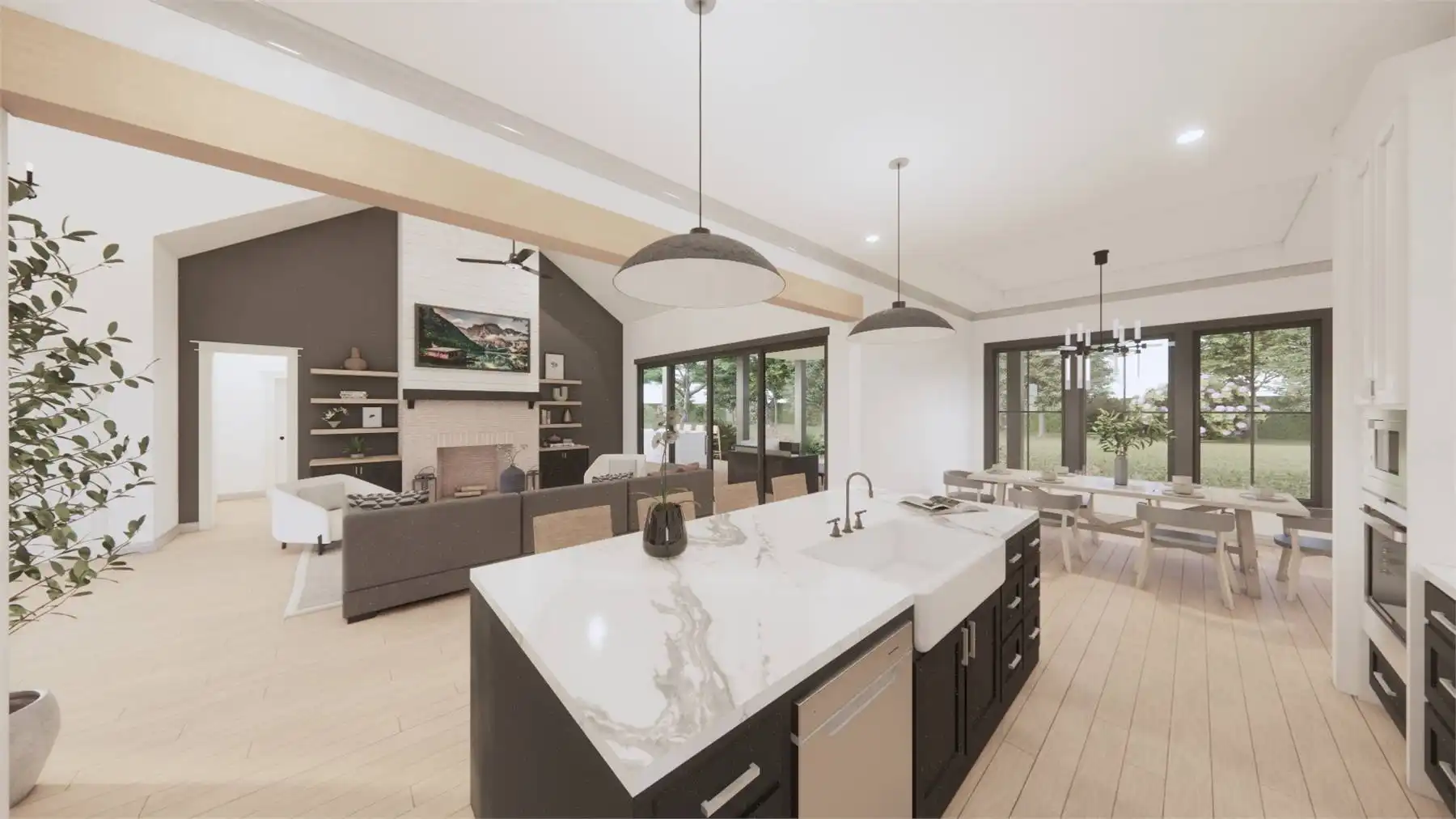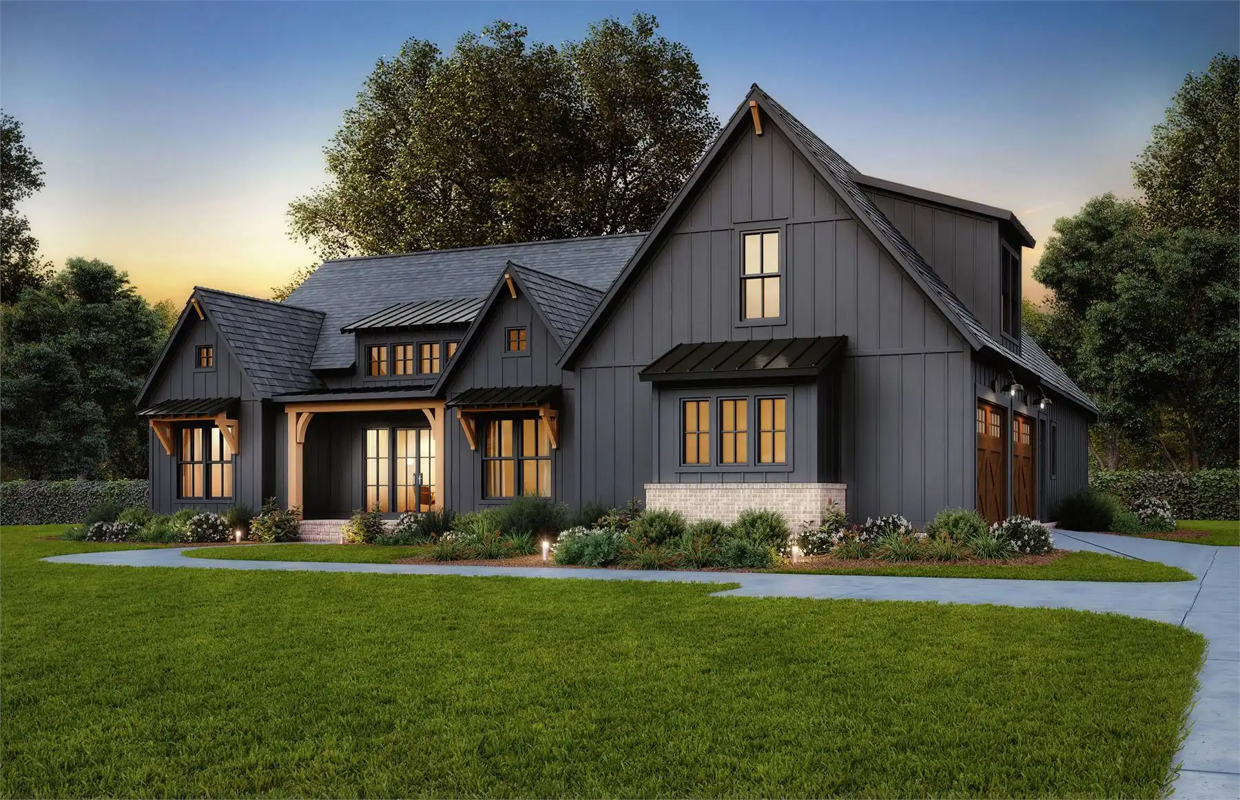 Need an amazing farmhouse for a family? Give House Plan 8593 your consideration! This 2,578-square-foot country-style ranch offers open living, four split bedrooms, and outstanding outdoor potential with an outdoor kitchen and fireplace. The vaulted great room makes up the heart of the home; it's open to the island kitchen, which sits beside the dining area, and connects to the back porch through patio doors that slide from the center to really open up the feel. The vaulted master suite and its luxurious five-piece ensuite sit behind the kitchen, along with the laundry room and mudroom entrance coming in from the garage. Two secondary bedrooms share a hall bath behind the great room's fireplace, while the last bedroom is directly off the foyer and would make a great office, if you prefer. Finally, there's a bonus with a full bath over the garage that can provide whatever else you may need. House Plan 8593 would make a great choice for a neighborhood or to build out on acreage!
