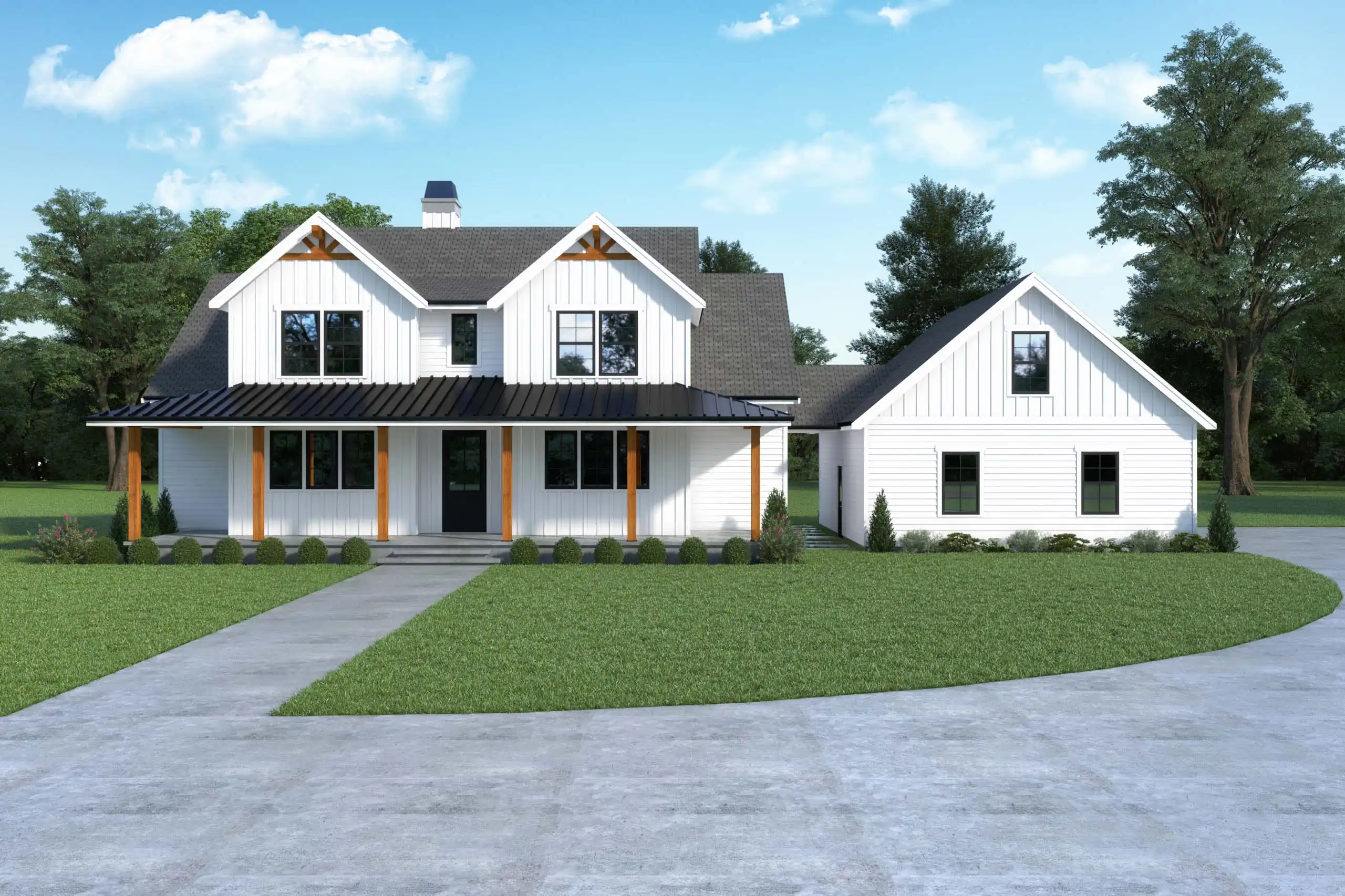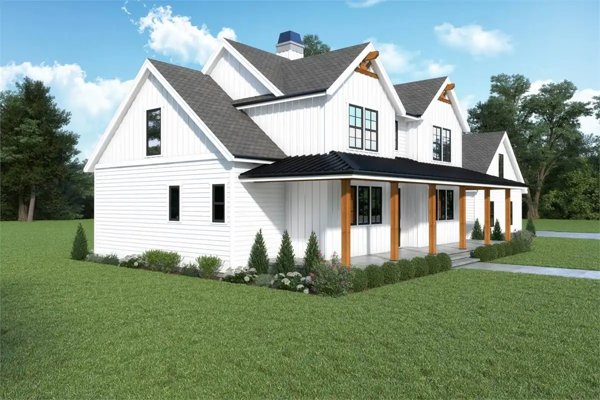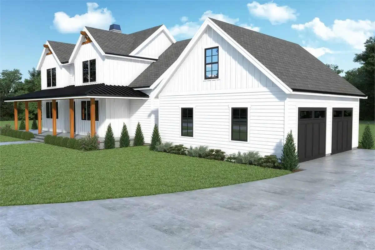 The curb appeal for this new, 2,870 s.f. farmhouse design is is unmistakable. The beauty of the symmetry and balance with the twin gables and slight craftsman details at the top of each gable is impressive. The large porch is inviting and one can imagine sitting on the porch swing after dinner. The gourmet kitchen has a large island where the kids can do their homework after school while a sumptuous meal is being prepared. The kitchen is connected to the large great room with corner fireplace, perfect for relaxing evenings watching the fire. The dining room to the left is a good space for the family to join at dinner-time to review the day. A laundry room and mud room leading the the garage is a great space to drop off books, coats, boots and help keep the house clean. The master suite is roomy with dual sink vanity, walk in shower and separate water closet. A den at the right side of the home is great for an office. The second level of the home has three bedrooms and a large bonus room with vaulted ceilings. The hallway is open to below allowing for the first floor to have vaulted ceilings. This home is perfect for a growing family. Beautiful, modern and comfortable.