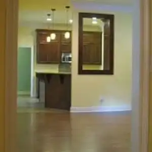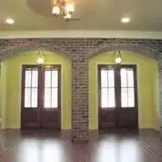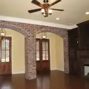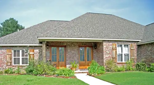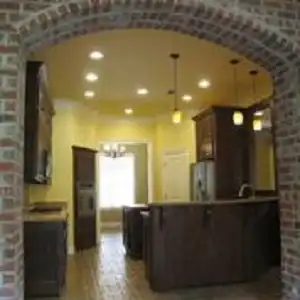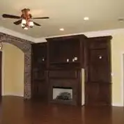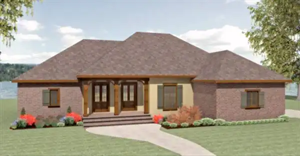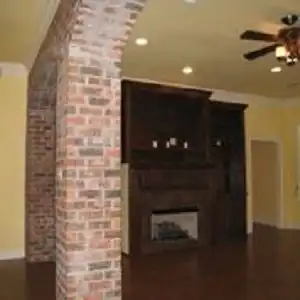 A ventless gas fireplace, french doors and columns highlight the Foyer and Great Room of this design. Built-in cabinetry give you storage for all your entertainment items.