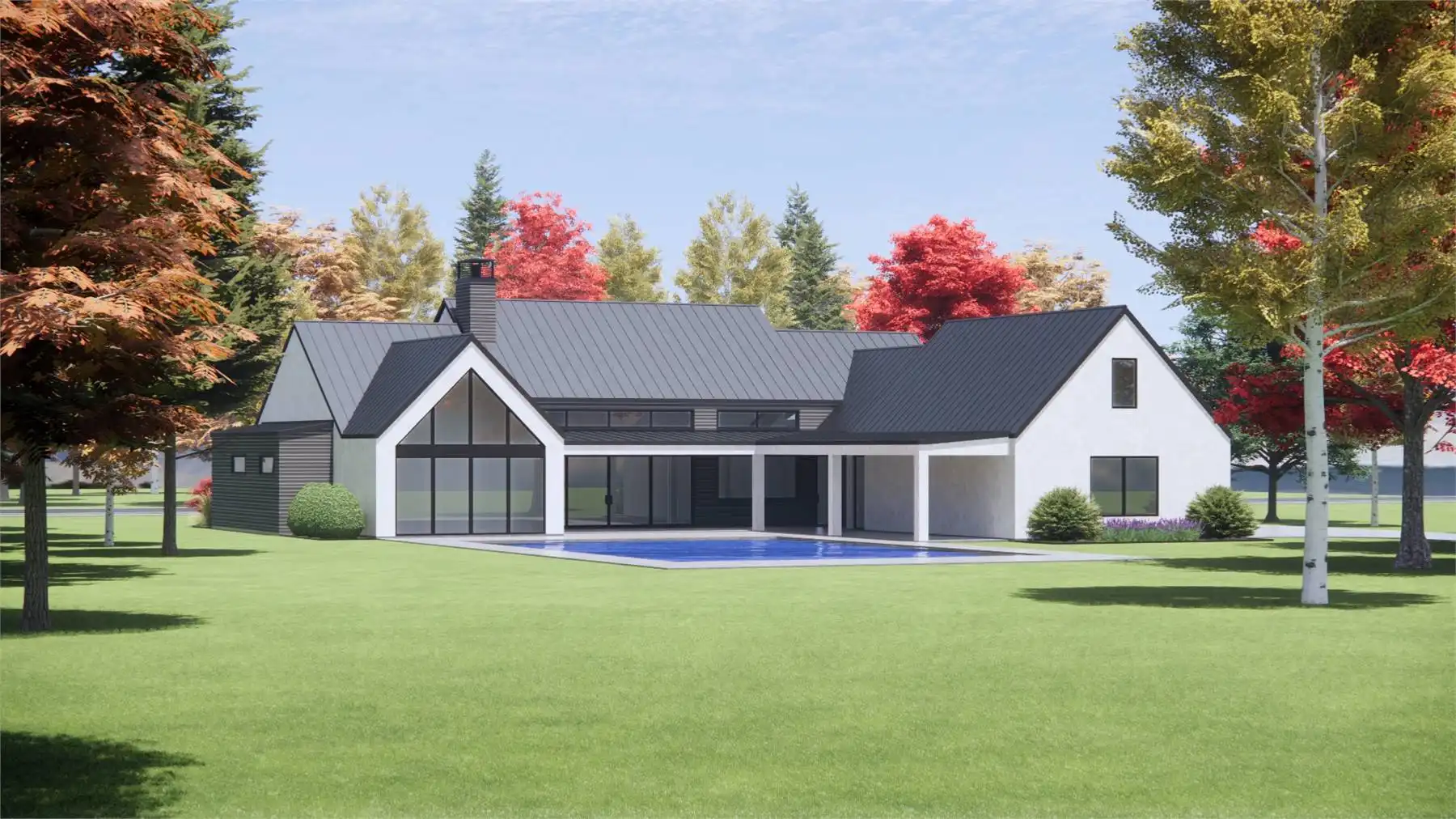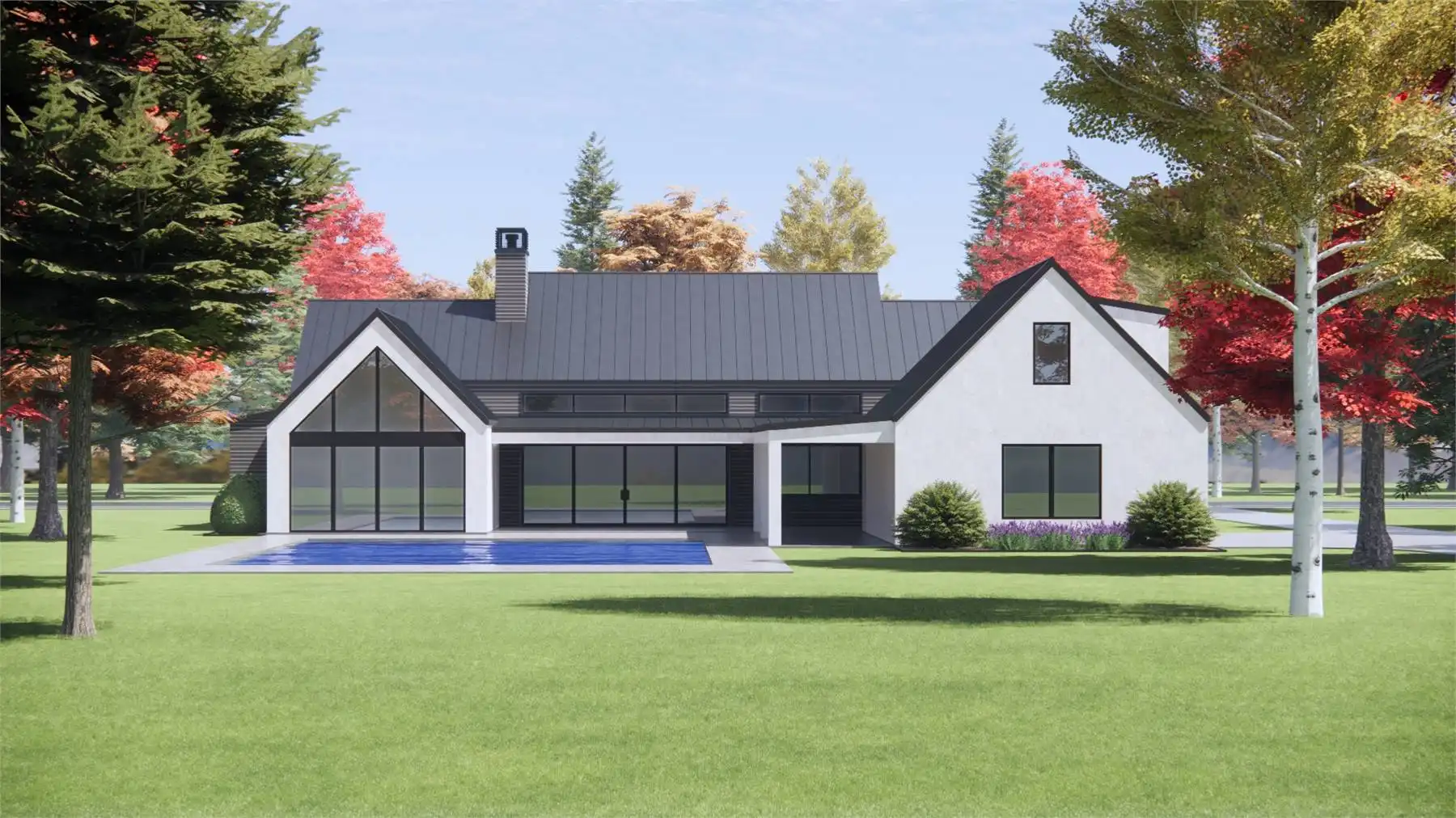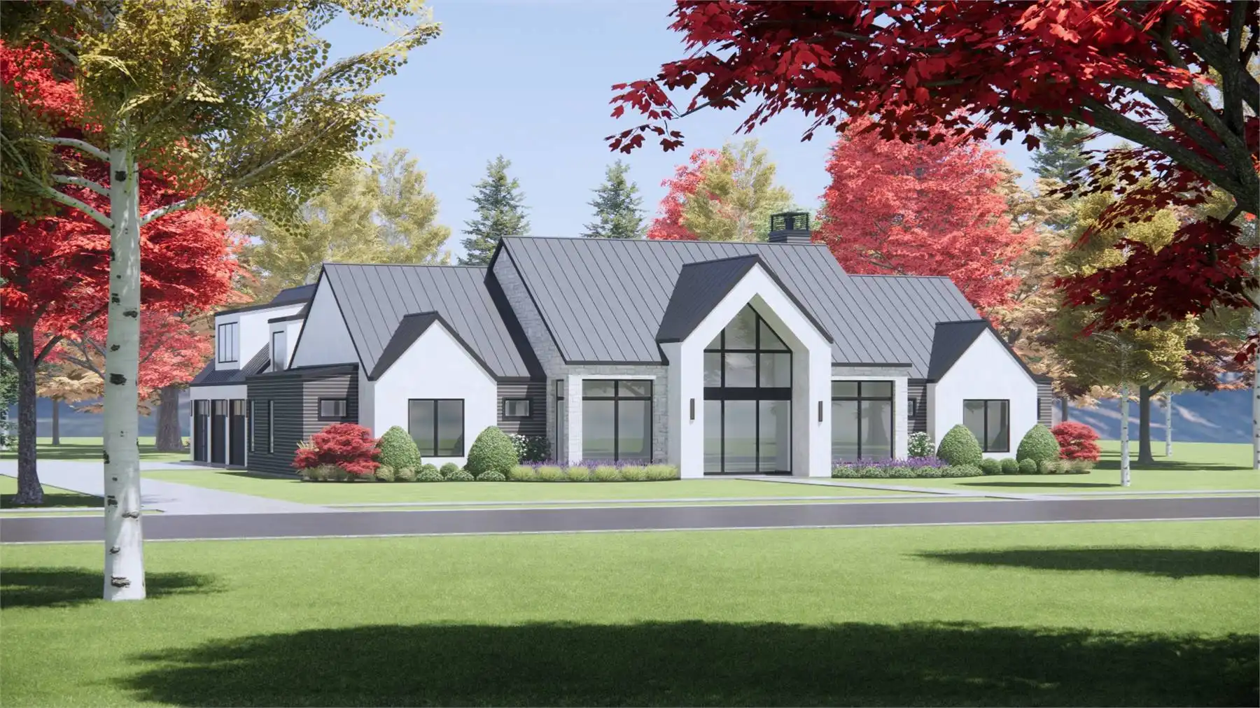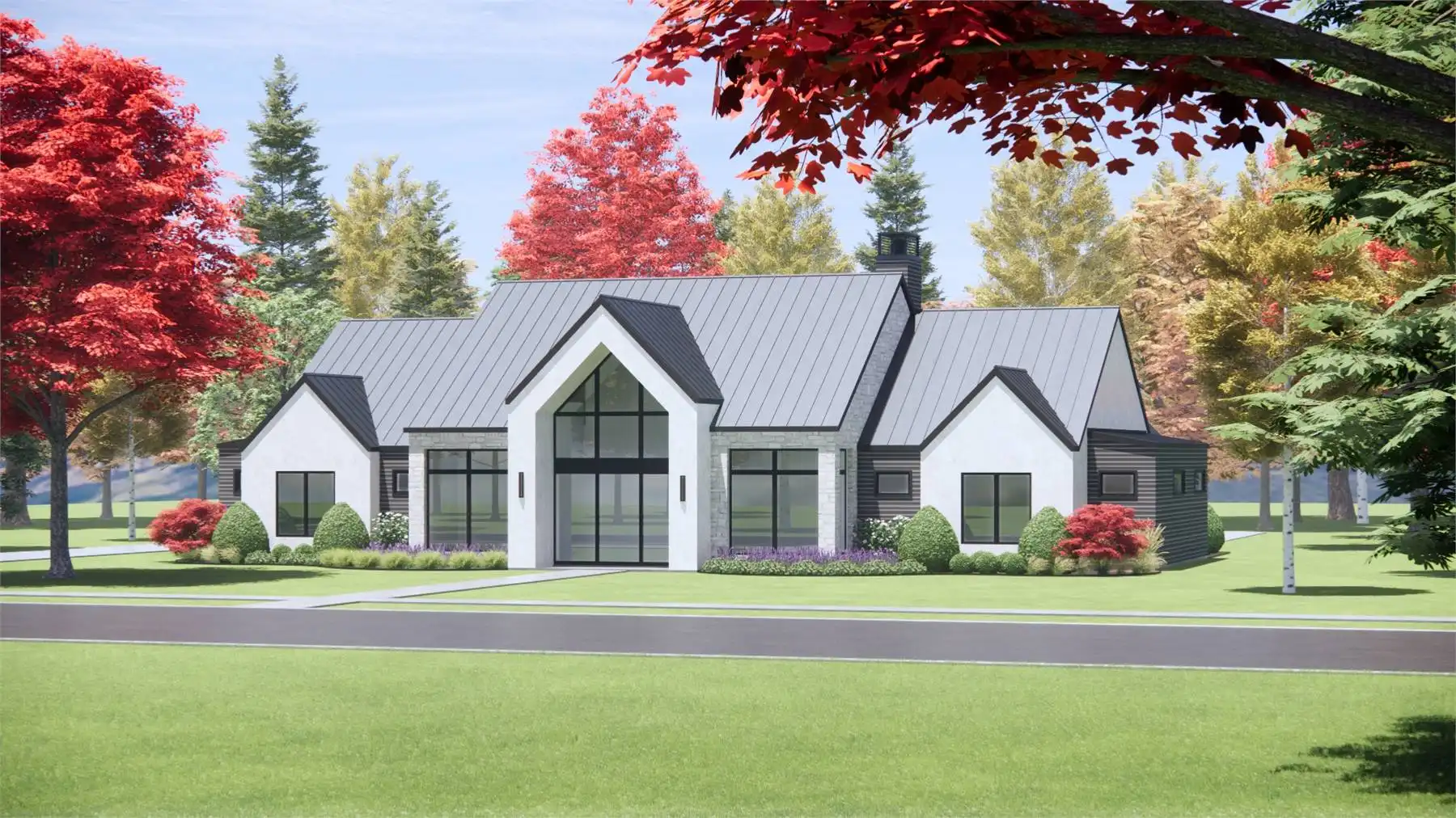 House Plan 8702 is an amazing luxury ranch with chic Scandinavian style ideal for families with transitional tastes! Behind that streamlined exterior with plenty of windows, you'll find 3,637 square feet with four bedrooms and four-and-a-half bathrooms. The layout includes a vaulted foyer that leads into a vaulted great room, with an office and the formal dining by the entrance and the bedrooms split around the common areas. The primary suite boasts a vaulted bedroom and a super spacious five-piece bath and walk-in closet. It's also privately located in its own hallway with the laundry room. A second vaulted bedroom suite is off another hallway on that side of the house while two more suites are in the hallway behind the island kitchen. That's right--every bedroom has its own private bathroom! House Plan 8702 features a side-entry three-car garage in back with a bonus above, so there's plenty of parking and additional space to spread out!