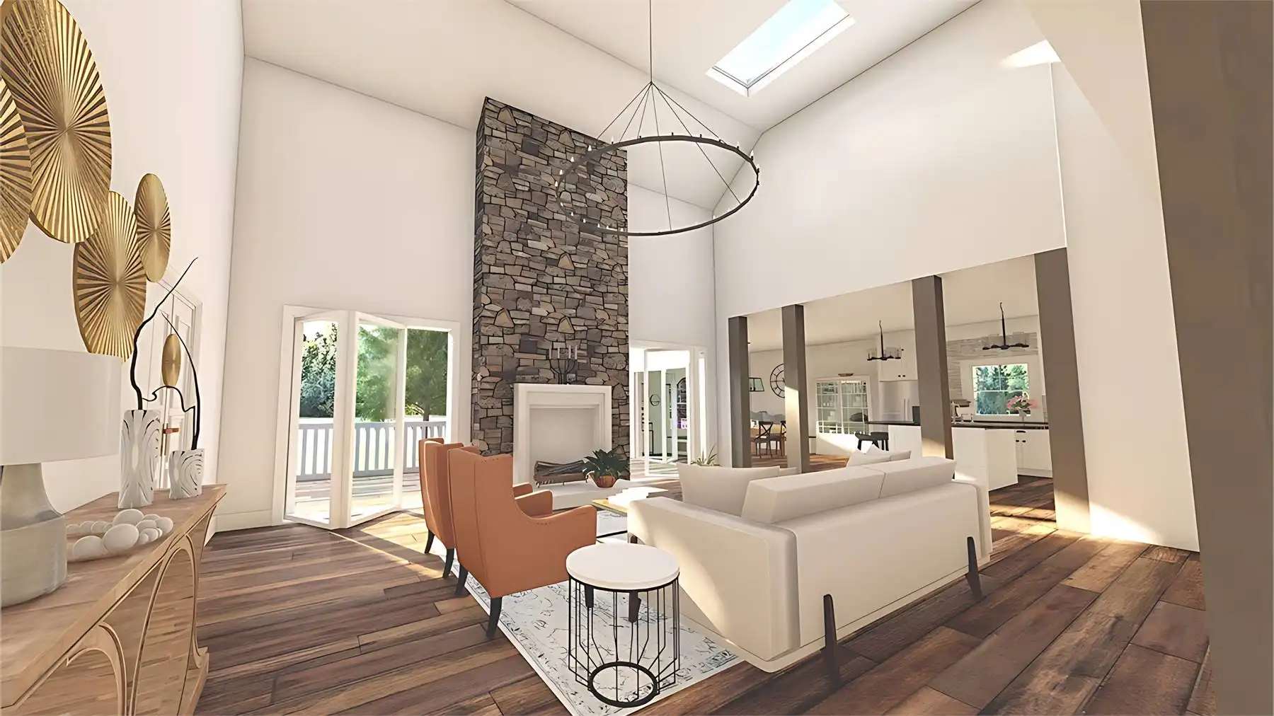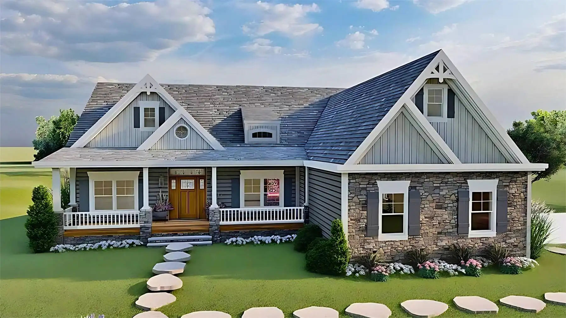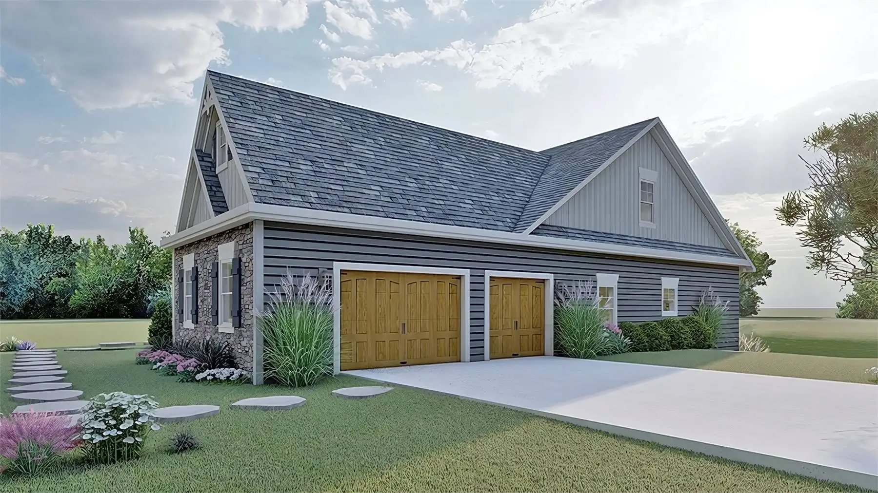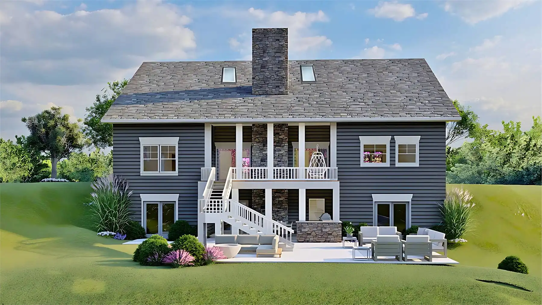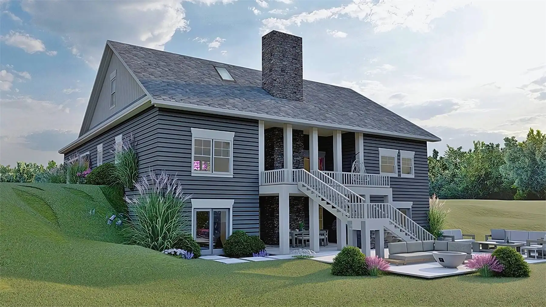 This energy efficient Craftsman home is a real treat! Designed for a family, it offers a large the mudroom off of the three-car garage. Conveniently located off the kitchen, the mudroom features a powder room, laundry space, pantry space, and a drop zone. How handy! The kitchen features a counter height island and a casual family dining space with plenty of natural light. The adjacent great room features a volume ceiling and a floor to ceiling fireplace between two gorgeous bi-fold doors. On the first floor, you’ll also find a formal dining space located directly off of the foyer, and a bedroom with a full bath that could be used as a home office. The main-level primary bedroom has a tray ceiling, a luxe bath, and his & hers closets. Upstairs, a balcony open to the vaulted great room below connects two more full bedrooms, each with a full bath. This plan is suitable for a sloped lot and accommodates a large custom walk-out basement.