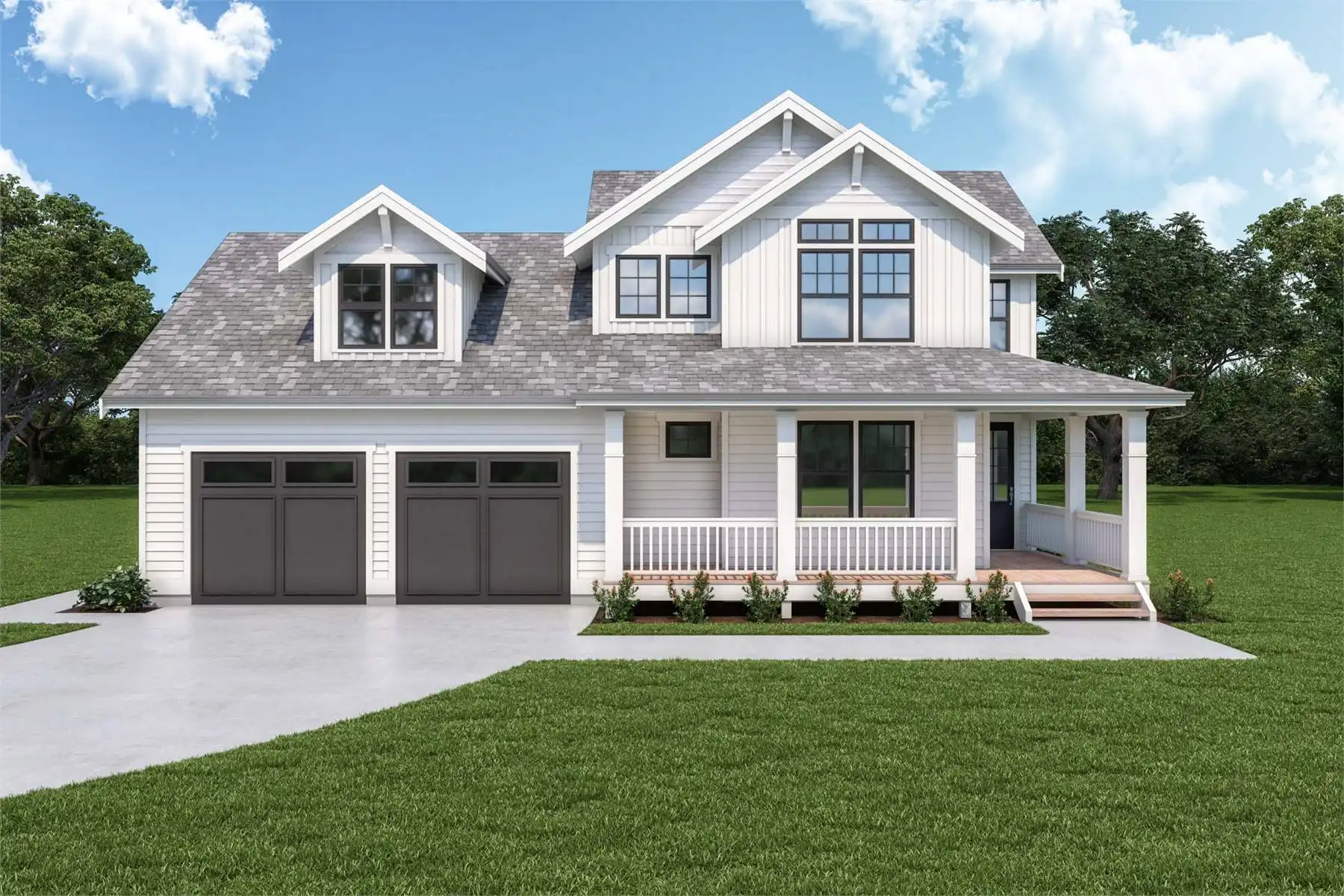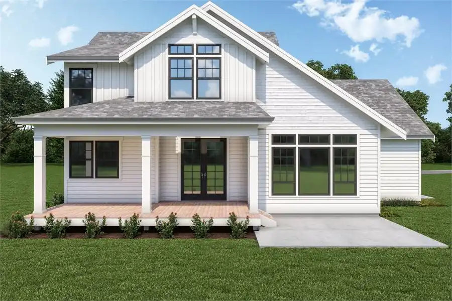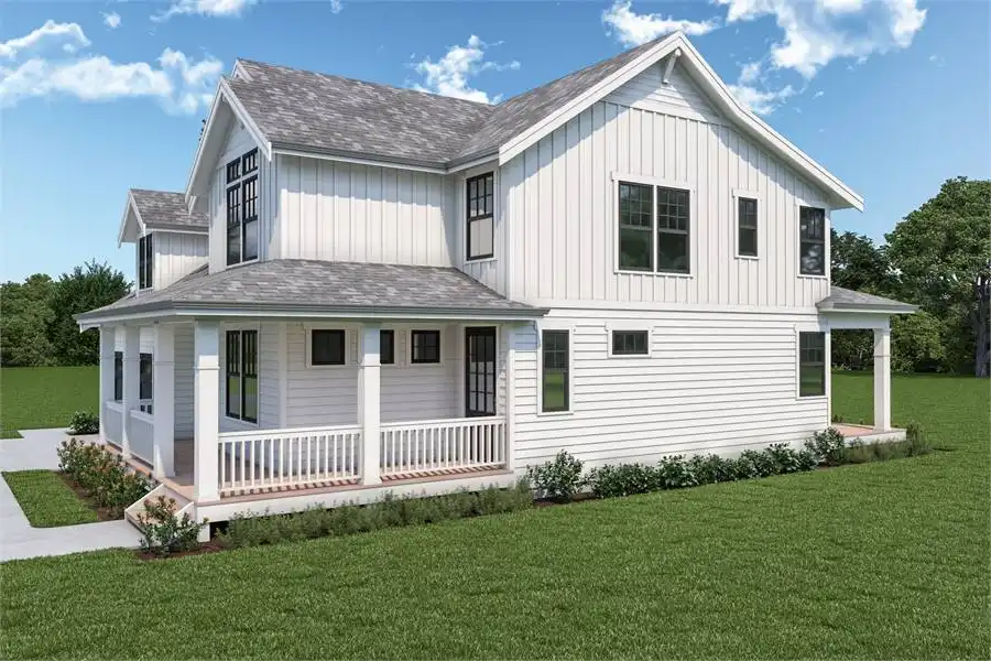 Incorporating the best of Craftsman and modern farmhouse designs, this lovely plan is so bright and cheery! And with a 2-floor, 2,393 square feet of space, the 3 bed, 2.5 bath layout is perfect for a new or growing family. This plan begins with so much curb appeal. From the welcoming wraparound porch to the stylish 2-car garage, the design draws the eye in to discover all that is beyond the front door. While the main floor has all of your general gathering areas such as the kitchen and vaulted  family room, the second floor is where you'll find all of the sleeping quarters. This means that you can enjoy entertaining crowds big and small and then slip away to private relaxation at the end of the night. So convenient!