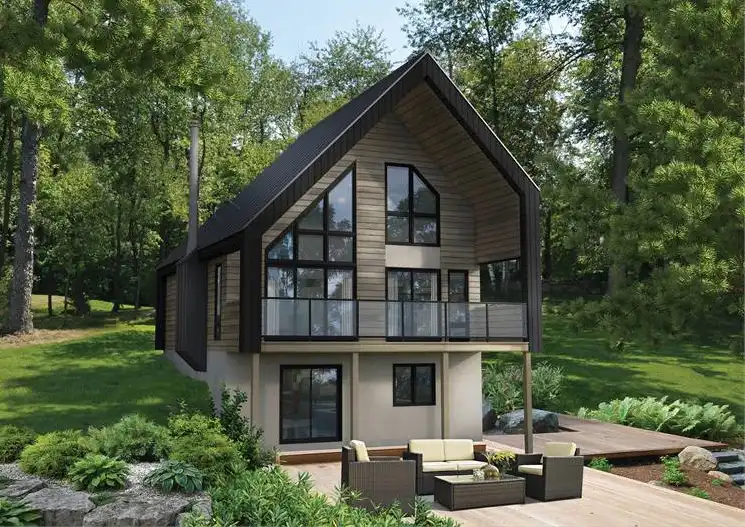 Featuring a minimalist-inspired design with 1,457 square feet of living space, this modern home is made to embrace nature, especially if your lot has a view to capture. Thanks to its unique design, the 3 bed 2 bath plan can easily fit on a sloped or recessed lot. And with large windows spanning the entire back wall, there are views wherever you might be. Whether it’s down in the walkout basement or up cooking dinner in the kitchen, you could even be in the private master suite. No matter what, there will be lovely picture-perfect views all year long!