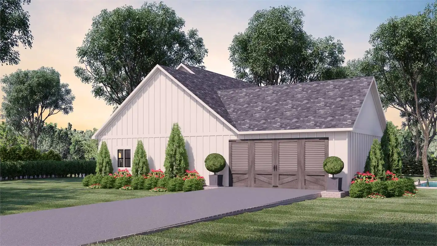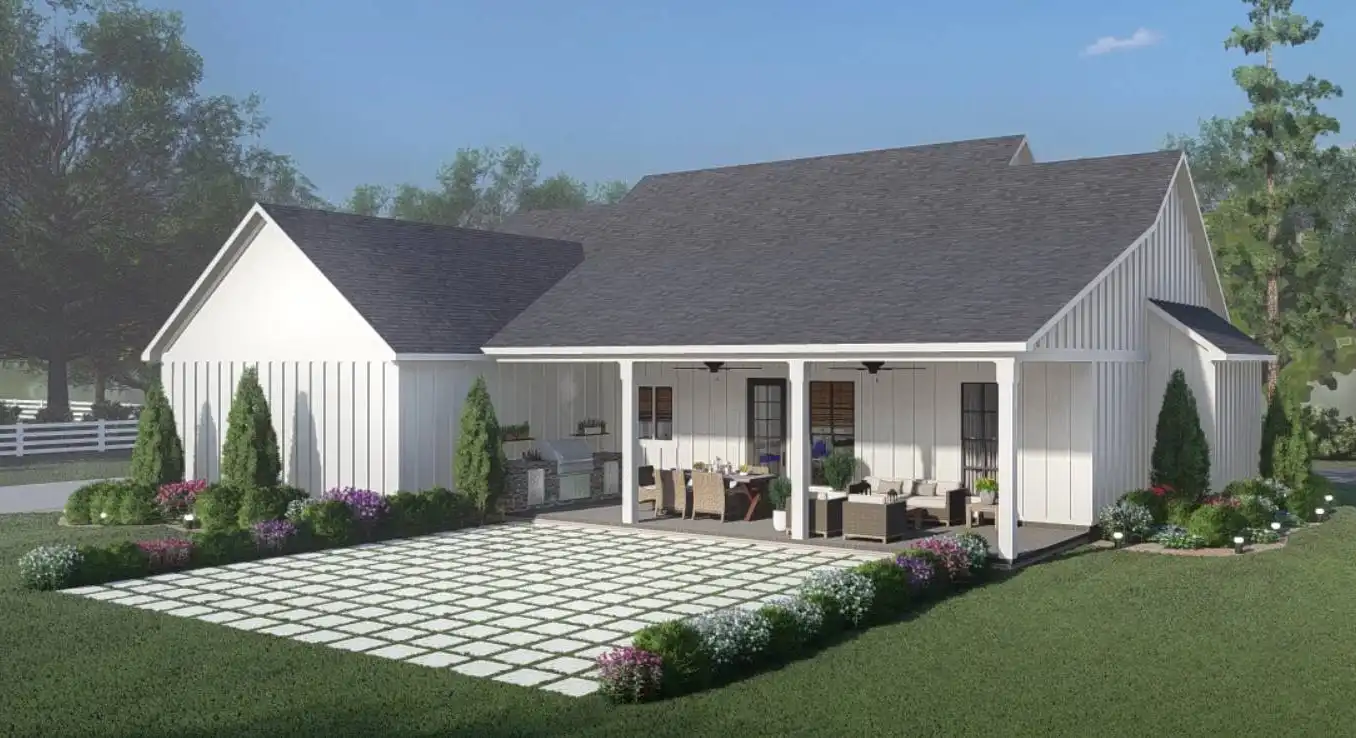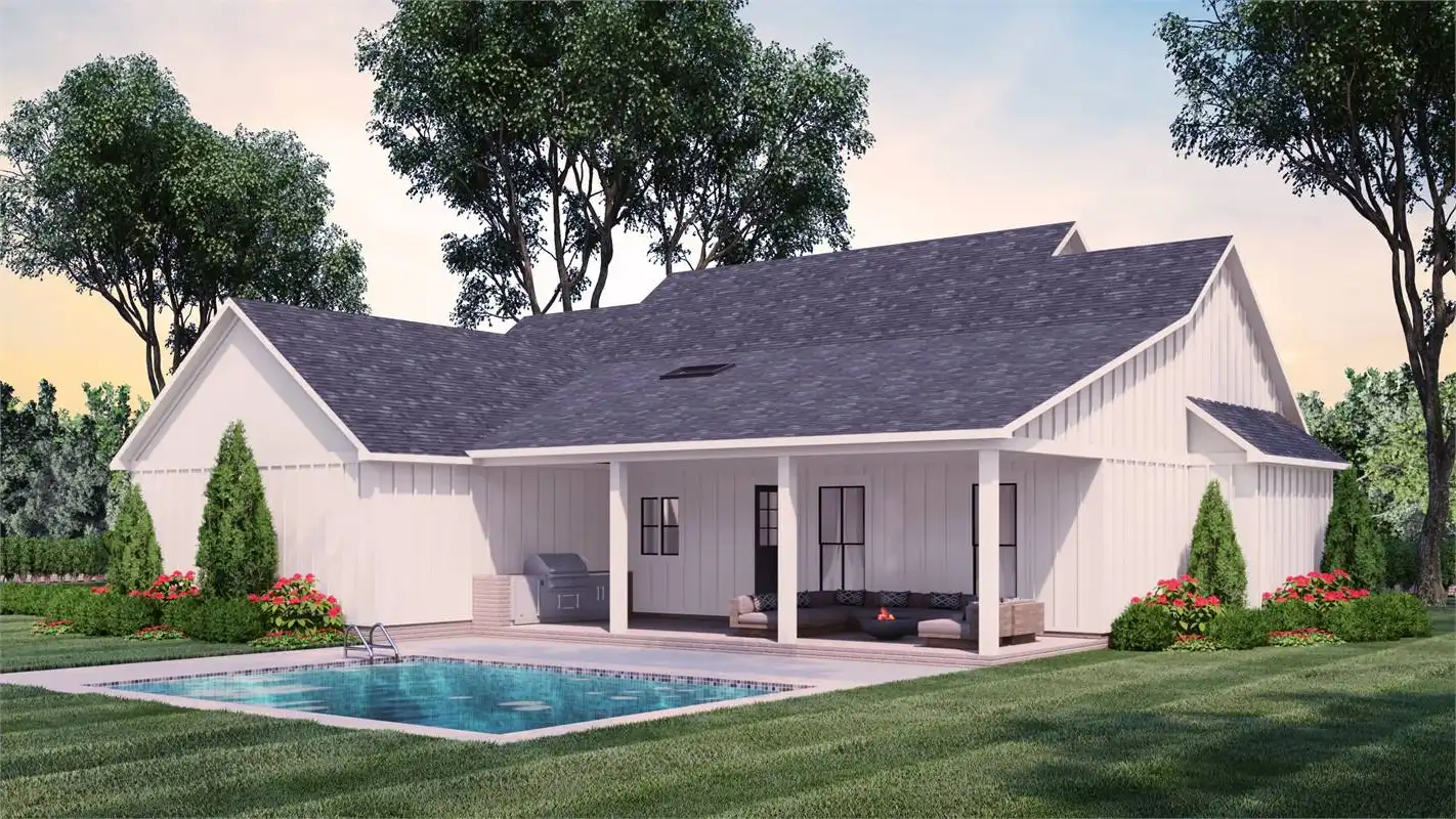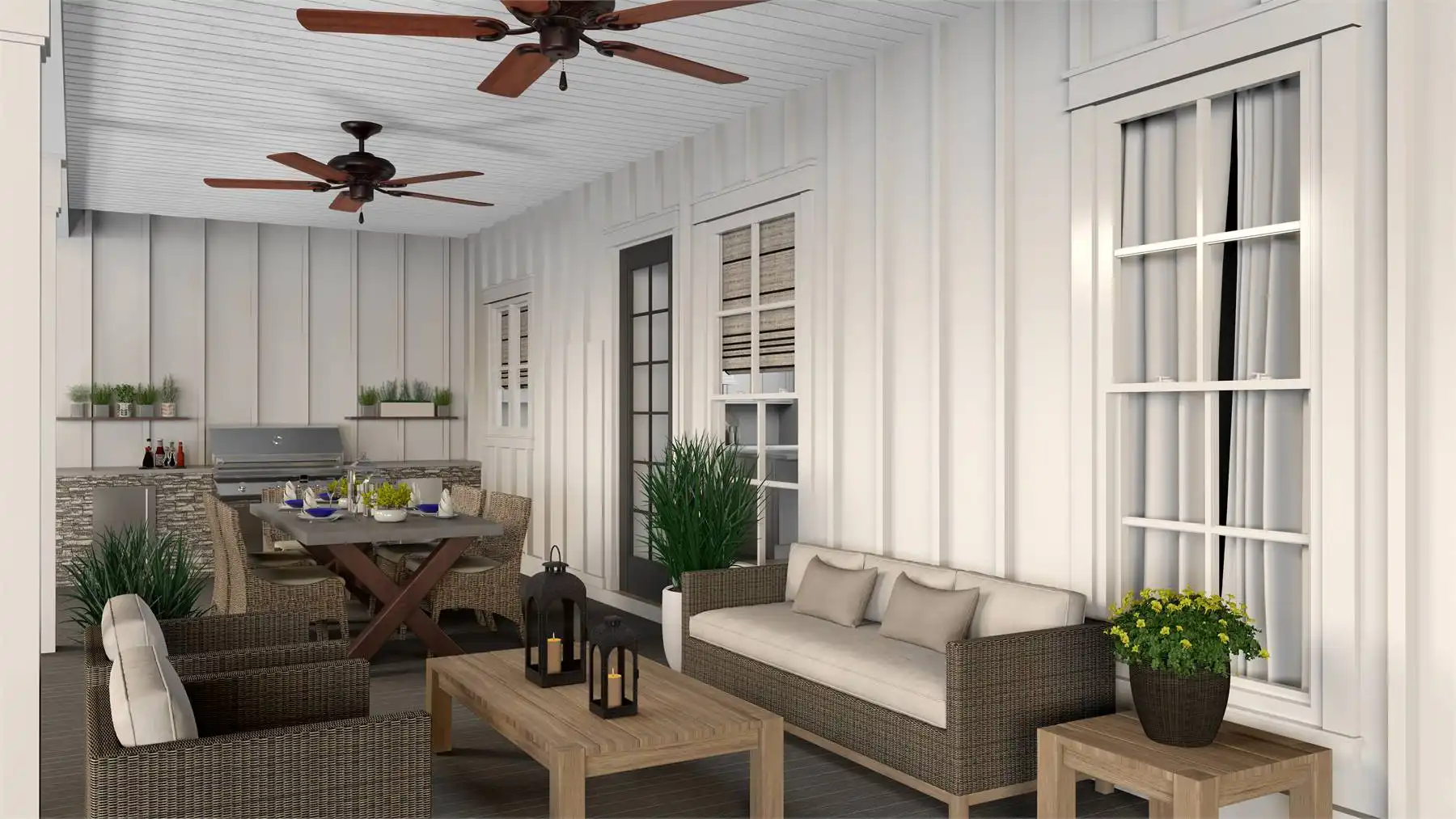 With 1,924 square feet on one story, DFD-8859 makes a practical home for families. It features three bedrooms and two-and-a-half baths in a well-balanced, split-bedroom arrangement. On one side, the kids have two 12 x 12 rooms with a Jack-and-Jill bathroom to share, while the master suite will definitely appeal to the homeowner(s) with a 15 x 15 bedroom and a fully loaded ensuite bath. The great room makes up the heart of the home, with complete openness between the living space, island dining, and dining area. And if you want to expand outside, check out the outdoor kitchen in back! DFD-8859 features a side-entry garage behind the main footprint, which makes it perfect for an interior or corner lot and adding some privacy to the backyard. All of this comes behind a symmetrical country facade for awesome curb appeal, too!