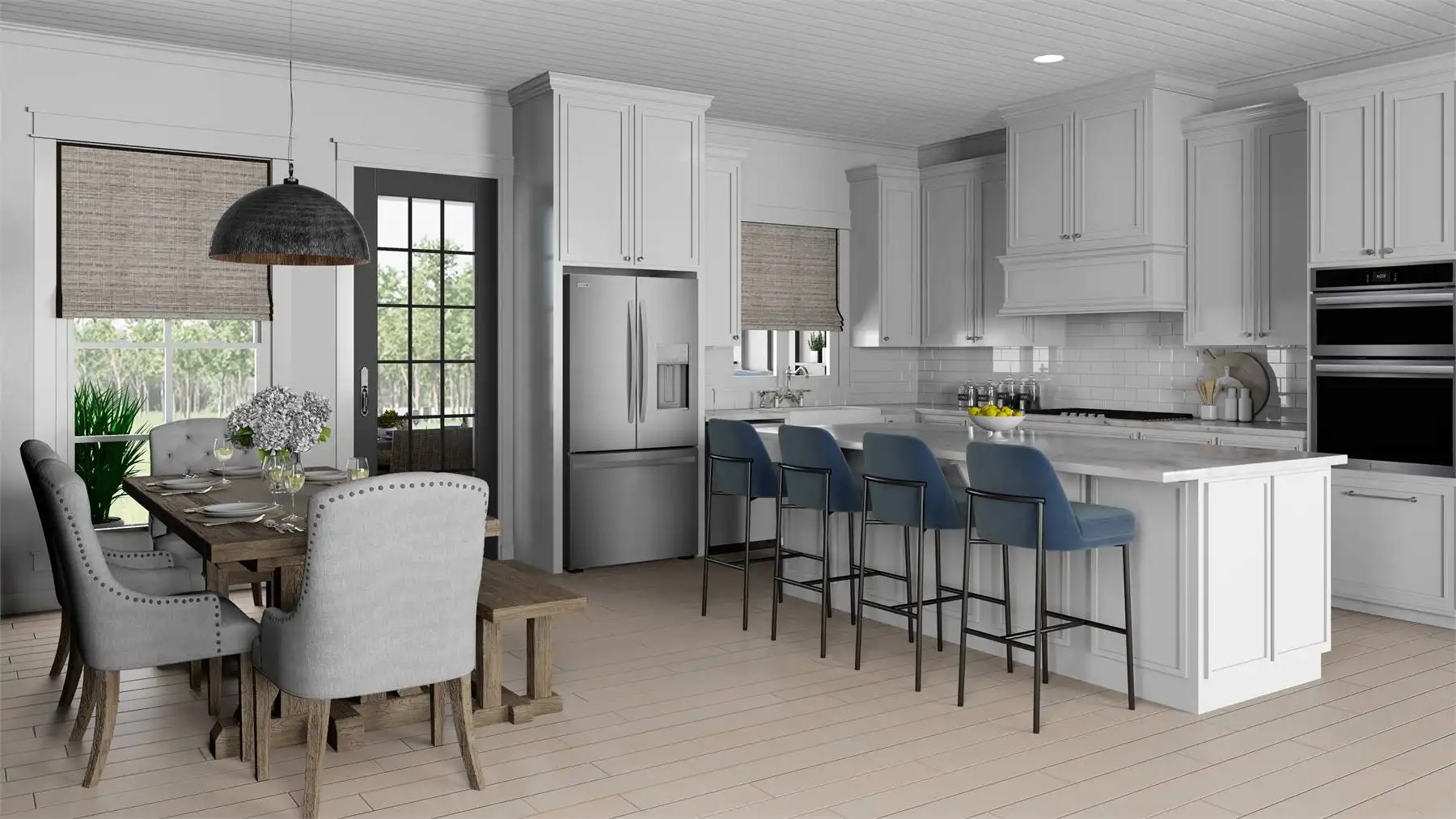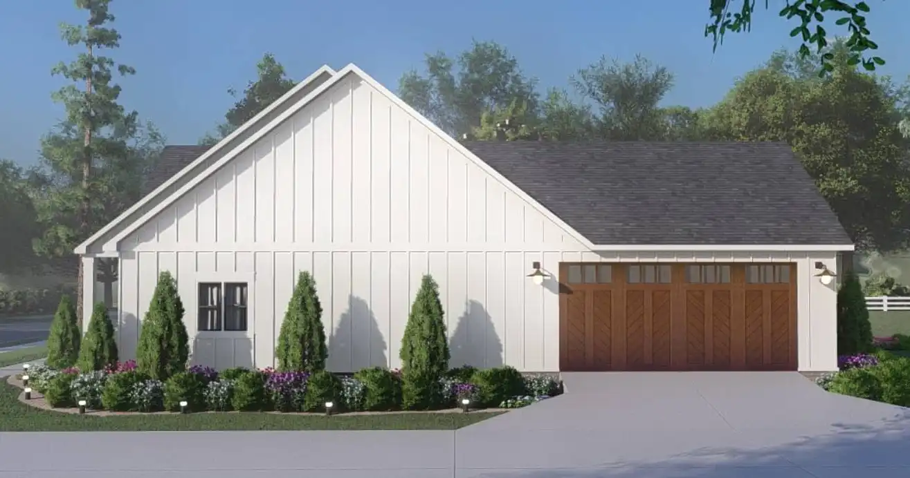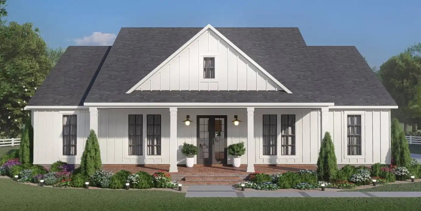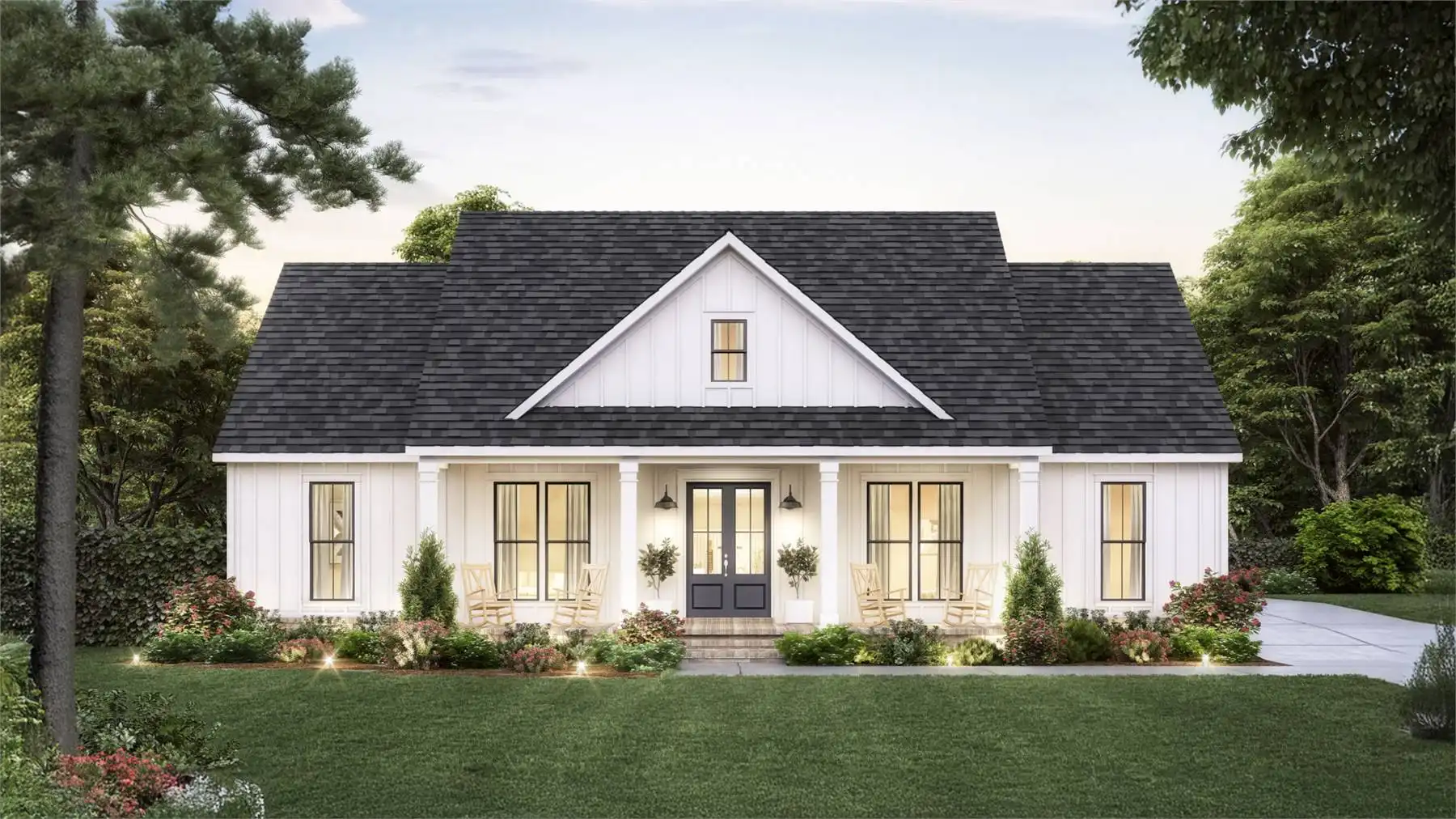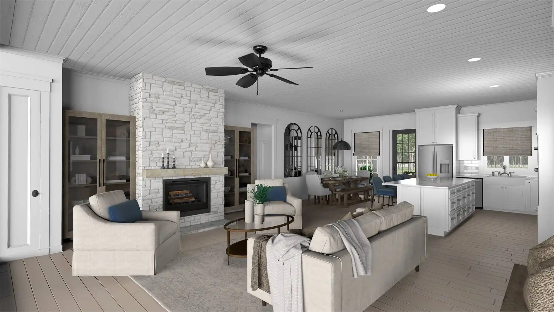 With 1,924 square feet on one story, DFD-8859 makes a practical home for families. It features three bedrooms and two-and-a-half baths in a well-balanced, split-bedroom arrangement. On one side, the kids have two 12 x 12 rooms with a Jack-and-Jill bathroom to share, while the master suite will definitely appeal to the homeowner(s) with a 15 x 15 bedroom and a fully loaded ensuite bath. The great room makes up the heart of the home, with complete openness between the living space, island dining, and dining area. And if you want to expand outside, check out the outdoor kitchen in back! DFD-8859 features a side-entry garage behind the main footprint, which makes it perfect for an interior or corner lot and adding some privacy to the backyard. All of this comes behind a symmetrical country facade for awesome curb appeal, too!