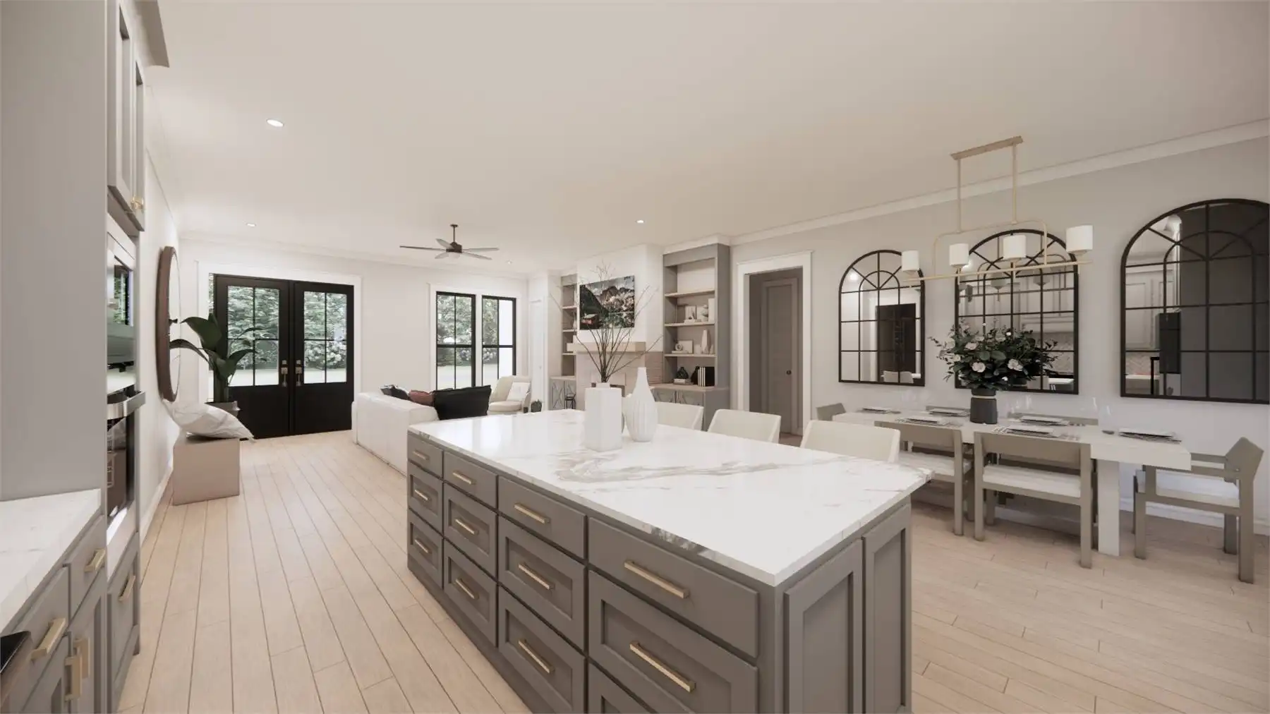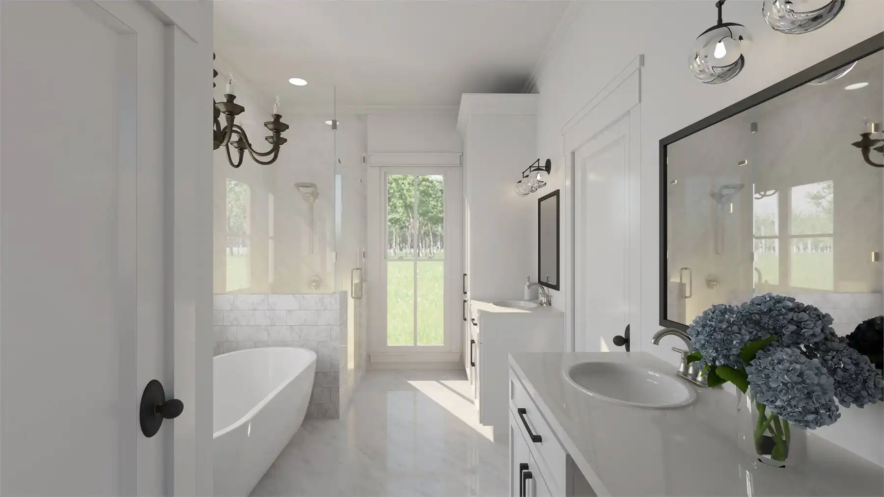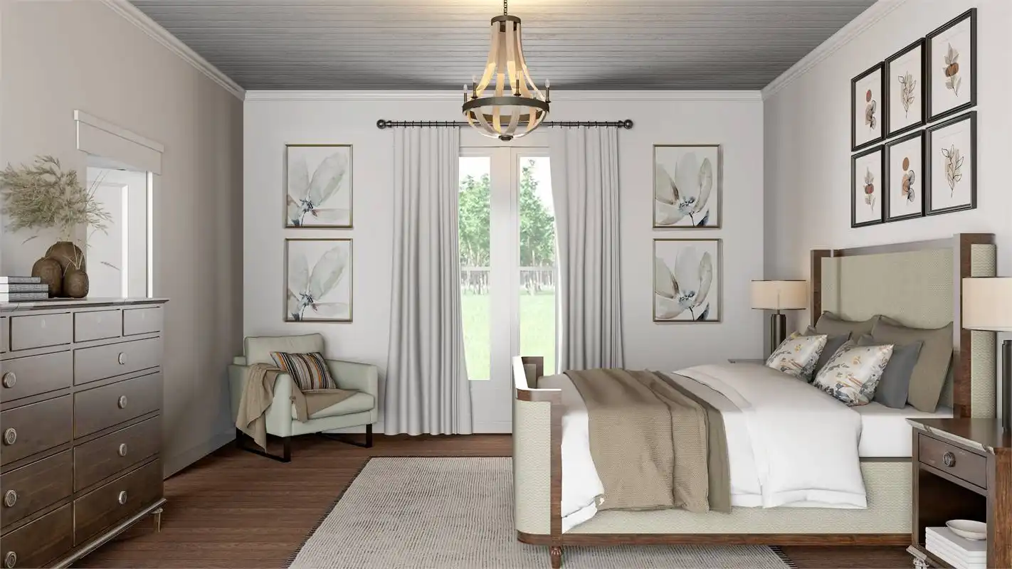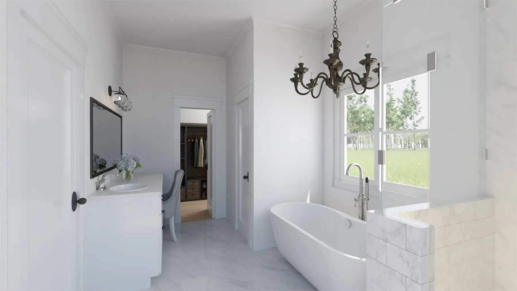 With 1,924 square feet on one story, DFD-8859 makes a practical home for families. It features three bedrooms and two-and-a-half baths in a well-balanced, split-bedroom arrangement. On one side, the kids have two 12 x 12 rooms with a Jack-and-Jill bathroom to share, while the master suite will definitely appeal to the homeowner(s) with a 15 x 15 bedroom and a fully loaded ensuite bath. The great room makes up the heart of the home, with complete openness between the living space, island dining, and dining area. And if you want to expand outside, check out the outdoor kitchen in back! DFD-8859 features a side-entry garage behind the main footprint, which makes it perfect for an interior or corner lot and adding some privacy to the backyard. All of this comes behind a symmetrical country facade for awesome curb appeal, too!