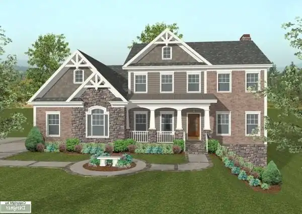 This charming 2,493 square foot home features a split 3-car garage with a workshop, a spacious front porch and a brick, stone and siding exterior with shake accents and Craftsman-inspired details. The entry unfolds to a columned dining room which is open to the kitchen, a home office and powder room. The large gourmet kitchen has an angled breakfast nook and a snack bar to provide additional seating and food prep space. Cabinets and shelves in the breakfast area offer a sizeable pantry. The center island holds a cook-top. A welcoming fireplace warms the cozy two-story family room.