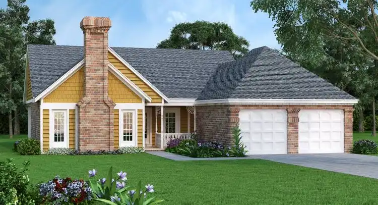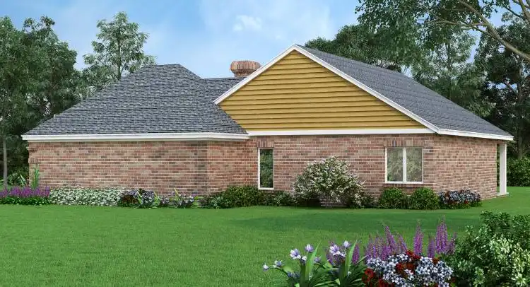 The living room has a wonderful and expansive vaulted ceiling and a real brick wood burning fireplace. Two bed rooms are isolated from the master and share the hall bath. The master suite has an adjoining bath and private access to the covered side porch. The large gourmet kitchen is fully appointed and it offers a see-thru and pass-thru bar into the living room. An oversized front loading garage has an open storage area and attic access via a pull down stair. To top it all off, this is a super energy saving plan featuring 2x6 exterior walls. This well designed compact home has a small footprint but it is packed with living space. For example, all of the bed rooms have very large walk-in closets and all of the bed rooms are generous in size. Compare with other home plans of this same size range.