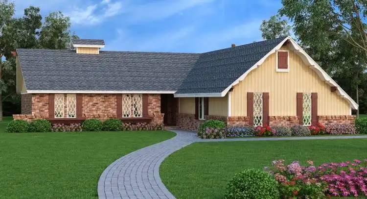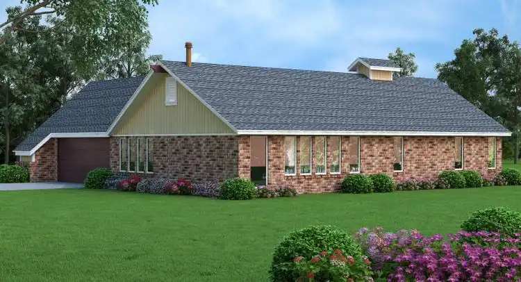Unlike many home plans, it is a very basic and simple design that is inexpensive but it packs a lot of curb appeal with its chalet style exterior. The living, dining and kitchen is very open creating the look of an enormous space but with subtle division of the rooms. The living room ceiling slopes from 8 at the back wall to a height of 14 at the fireplace. The fireplace is a real brick wood burning fireplace flanked by built-in book shelves. The master suite is moderately sized and has a full private bath with a large walk-in closet. The other 3 bedrooms are modest size and each has a generous size closet and access to the hall bath. The double garage has adjoining storage rooms and there is even a covered bin for those unsightly garbage cans. For those who need more bed rooms and lower cost, this budget friendly 4 bedroom home is simple, affordable and very livable.