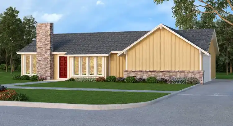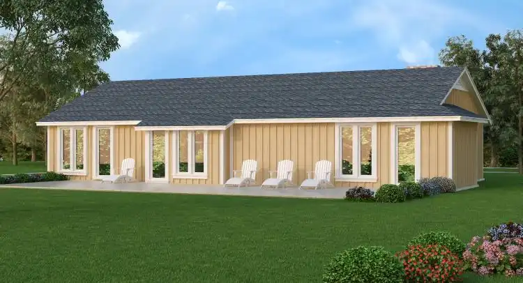 Designed for absolute simplicity and minimal cost of building, the layout of this contemporary design provides privacy for all of the bed rooms with access to the patio. The living areas all have glass exposure to the front of the house which makes it ideal for homes with a great view toward the front. The master has vaulted beamed ceilings and his and her walk in closets. Both of the secondary bedrooms have walk-in closets too. The living room has vaulted beamed ceilings and a great wood burning fireplace with a stone finish. The garage is sized to accommodate two vehicles and there is access from the garage into the utility room or into the bed room area. The galley kitchen is open to the well lighted dining area and there is an eating bar to maximize the number of guest that can be accommodated.