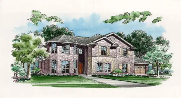 A two-story porch entry invites you into this luxury mansion home. The house opens into the foyer, which is flanked by an elegant dining room and bayed study. The living area is beyond the entry, consisting of the family room, breakfast area, and kitchen. The family room offers access to the patio as well as a corner fireplace. The kitchen offers a free standing breakfast bar, which is the only thing separating it from the rest of the living space. The bayed breakfast room features views into the backyard through a wall of windows. The master suite offers trey ceilings, oversize wardrobe, and luxurious master bath with dual vanities and separate shower and garden tub. The upper floor features three family bedrooms. Each bedroom includes a walk-in closet and access to one of the two full bathrooms. Through the game room is a media room which offers built ins.
