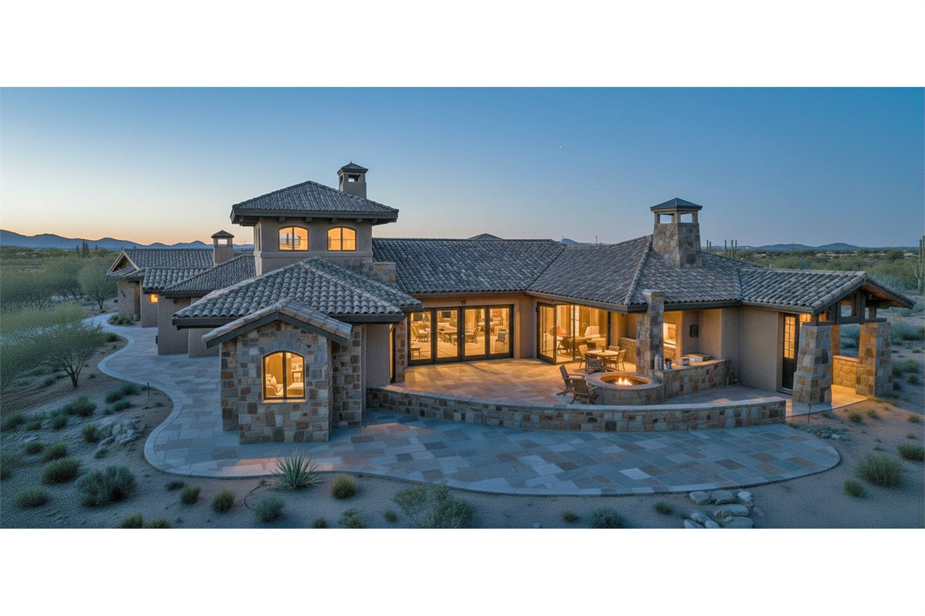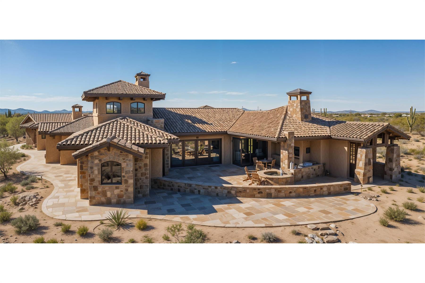 An attractive façade welcomes guests to this three-bedroom Tuscan design, where each bedroom is actually a master suite! The spacious great room shows off a fireplace and a curved bar. A nearby office is topped by a unique tower room. The island kitchen leads to a fabulous sun terrace. More outdoor areas are found to the "west" of the great room.