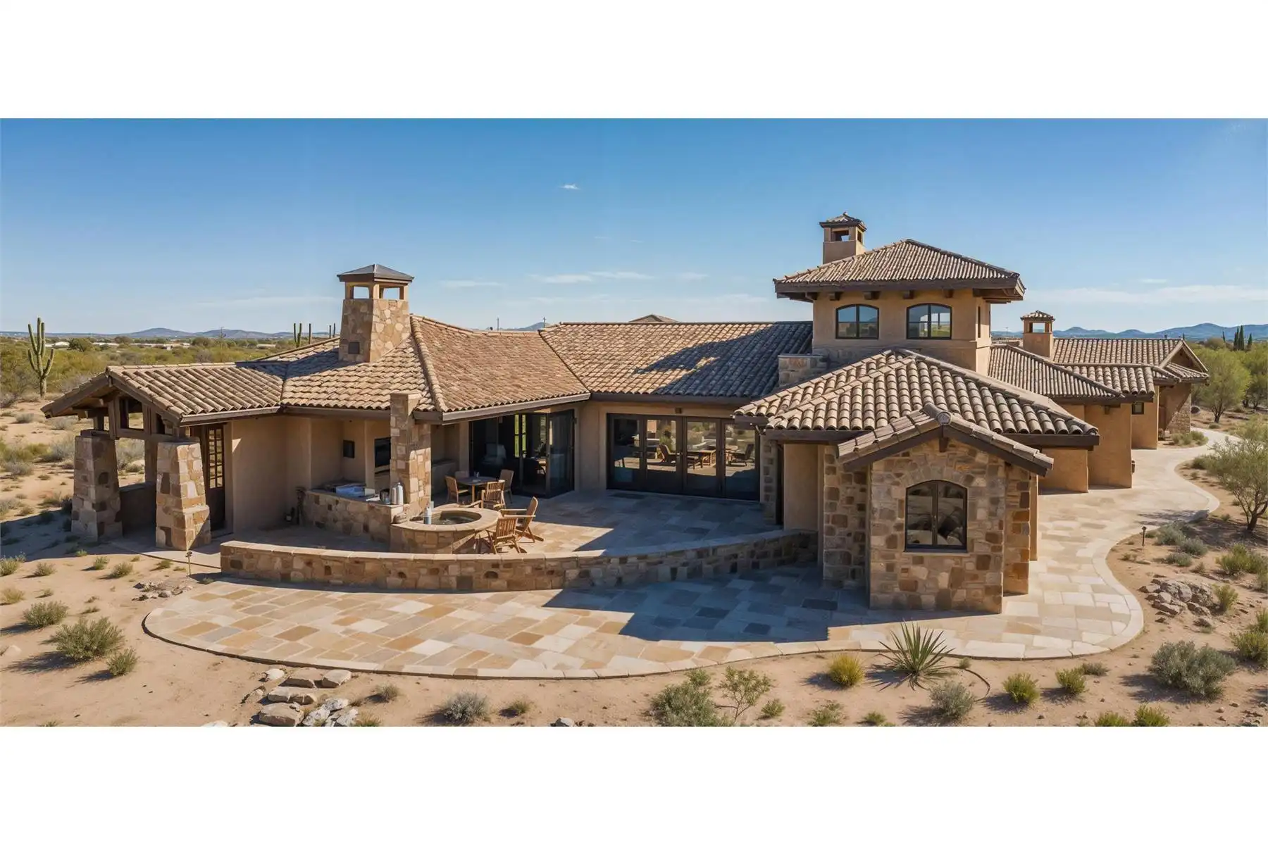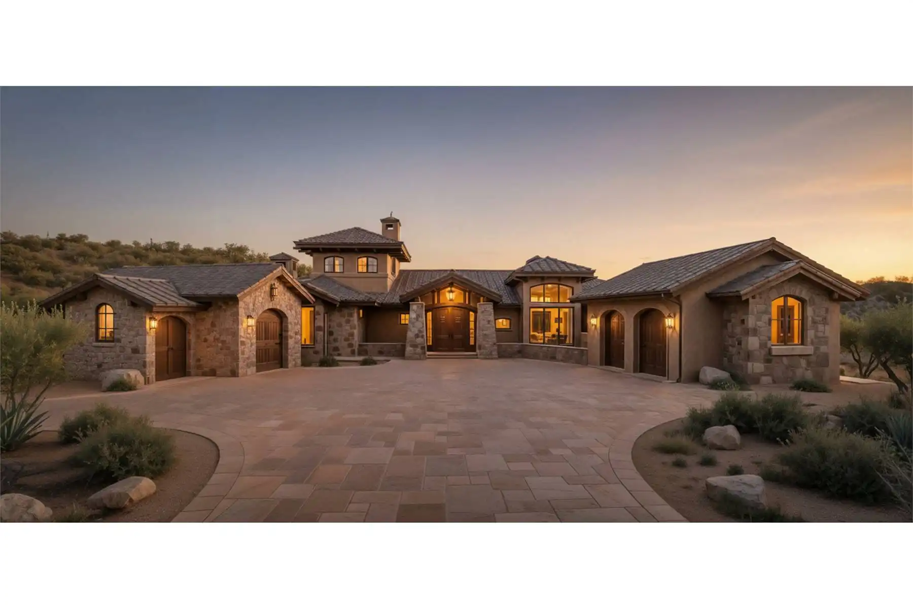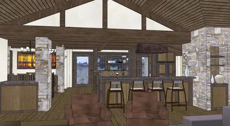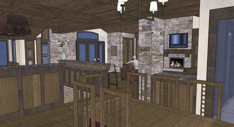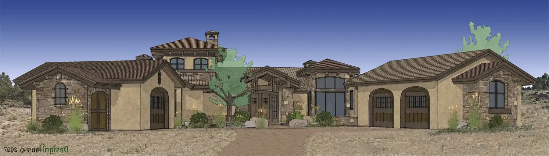 An attractive façade welcomes guests to this three-bedroom Tuscan design, where each bedroom is actually a master suite! The spacious great room shows off a fireplace and a curved bar. A nearby office is topped by a unique tower room. The island kitchen leads to a fabulous sun terrace. More outdoor areas are found to the "west" of the great room.