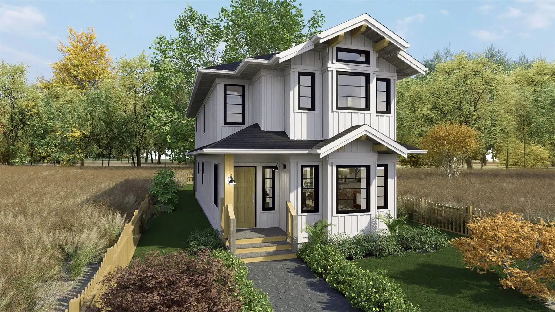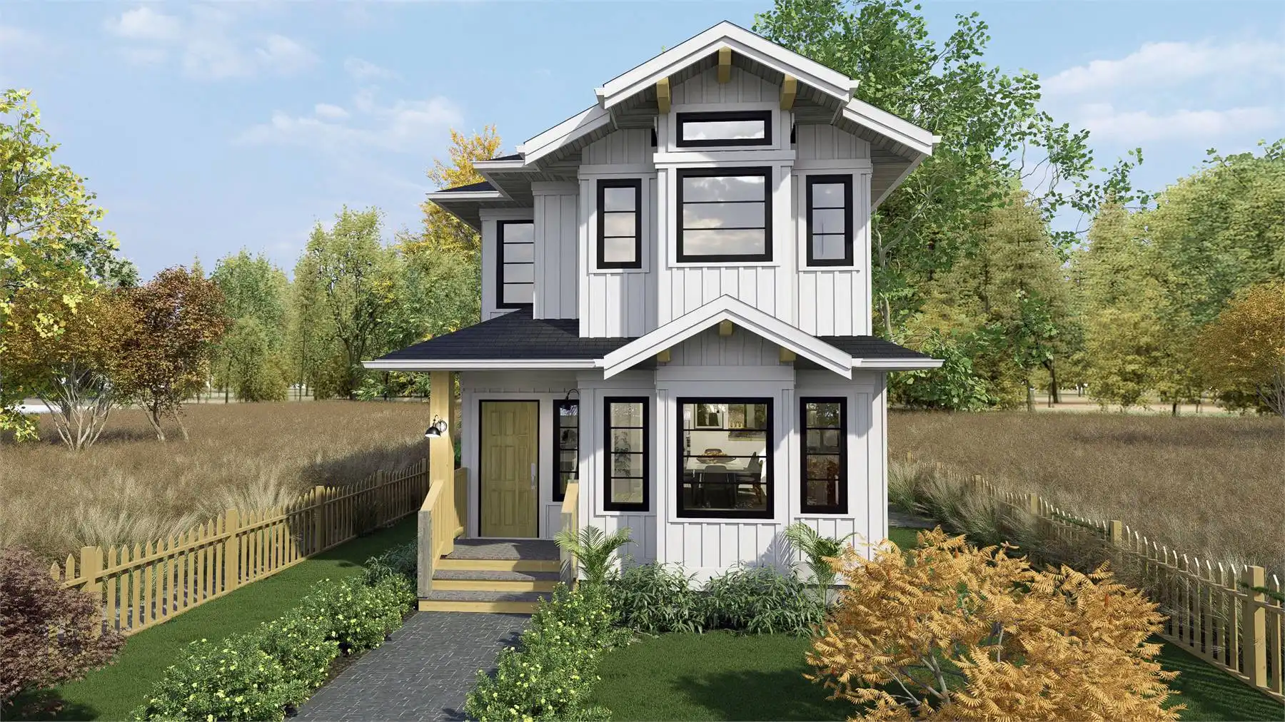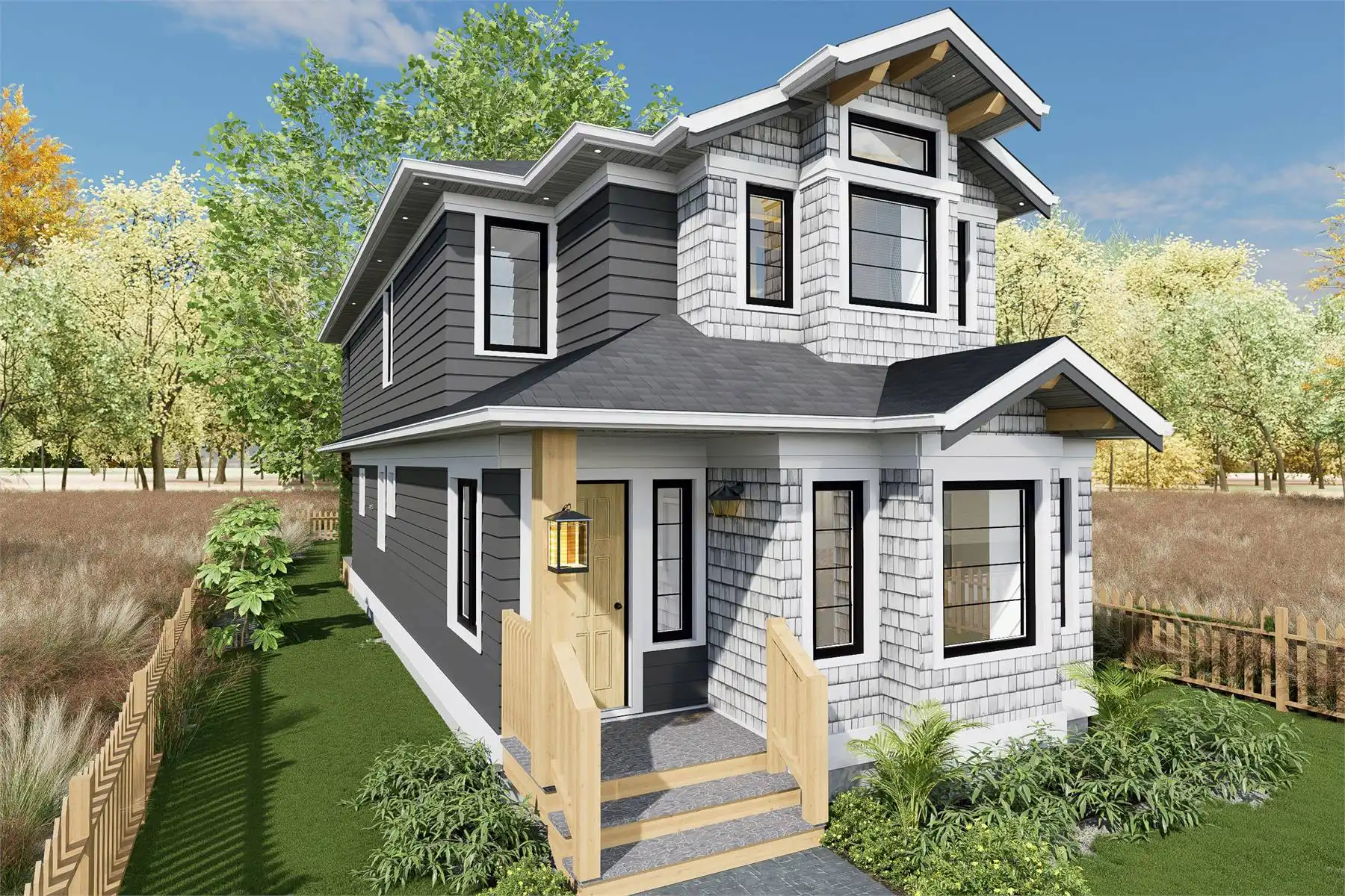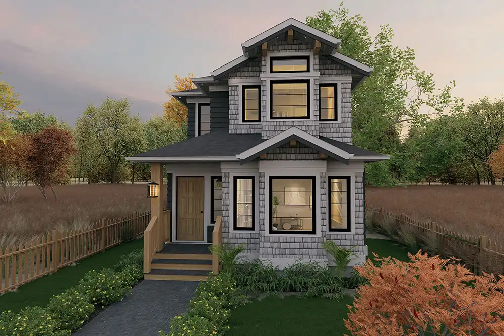 House Plan 9091 is an amazing narrow cottage with 1,755 square feet across two stories, so it's perfect for building in a beach or other vacation location. It offers a full range of common areas on the main level, including a lounge, dining space, peninsula kitchen, and family room in addition to the laundry and powder rooms. The primary suite and two other bedrooms and a full bath are placed upstairs. The primary suite has its own deck! With all this and at only 19' across, this home is ready to build nearly anywhere!