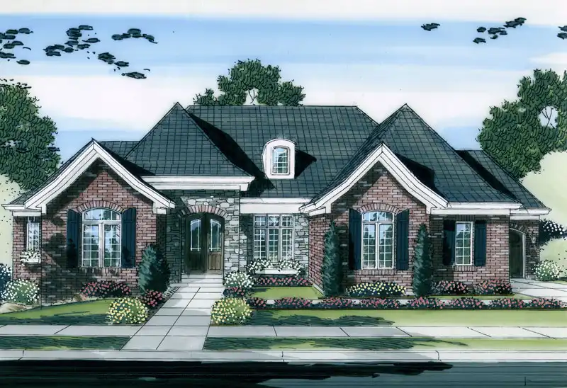 This one-story traditional house plan features plenty of modern amenities. Upon entering the foyer you will find two bedrooms and a master suite occupying the right wing. A large living space takes center stage.