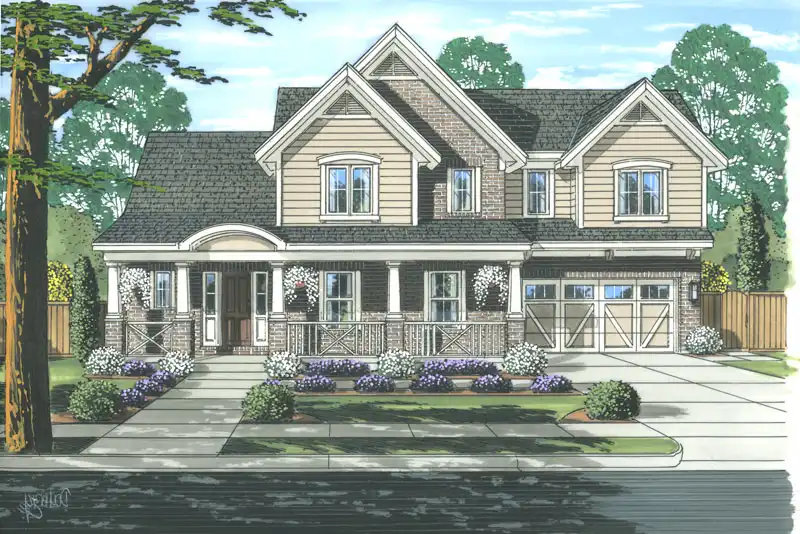 With a brick and siding exterior, arched trim, multiple gables, and a covered porch this traditional home has plenty of curb appeal.
