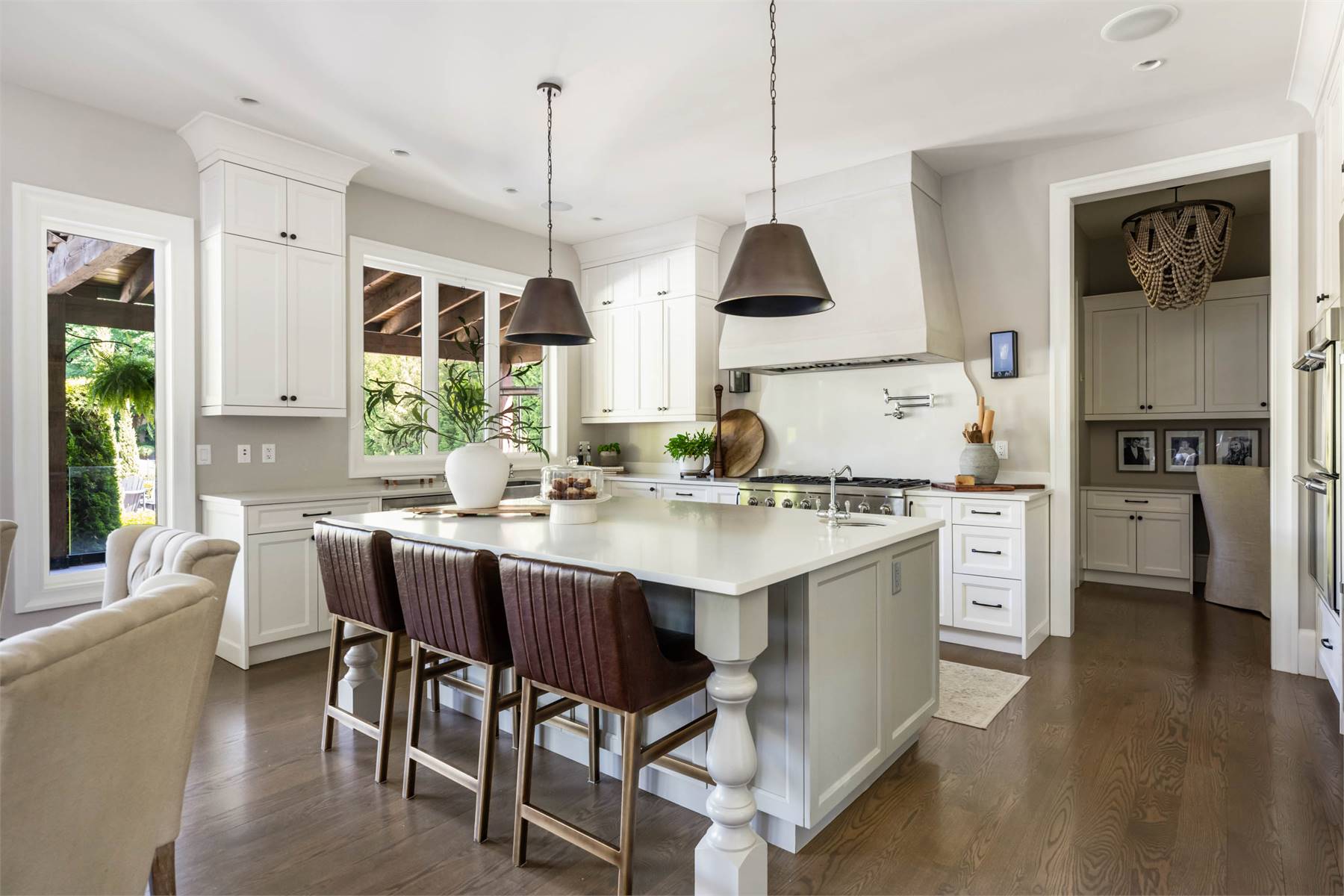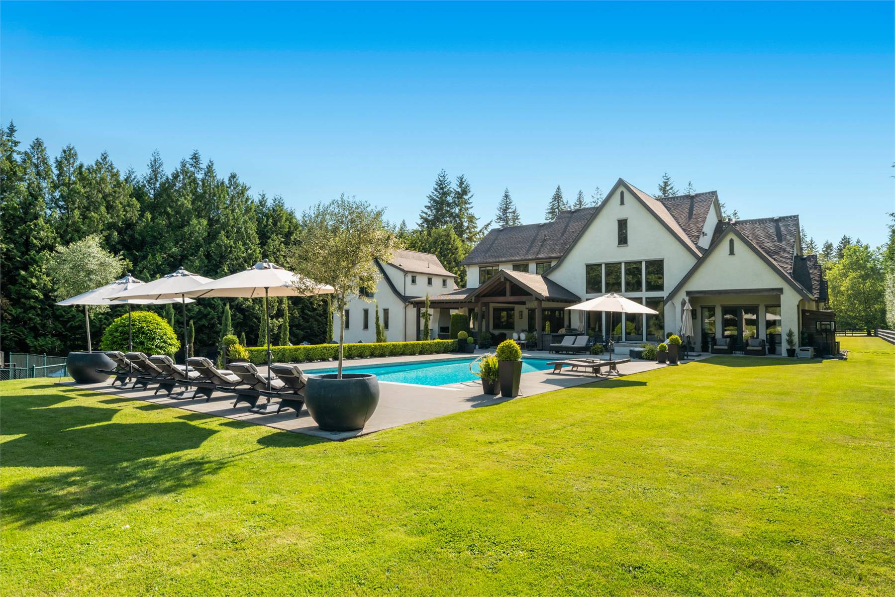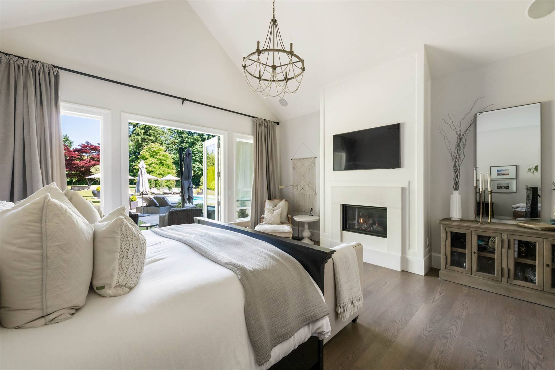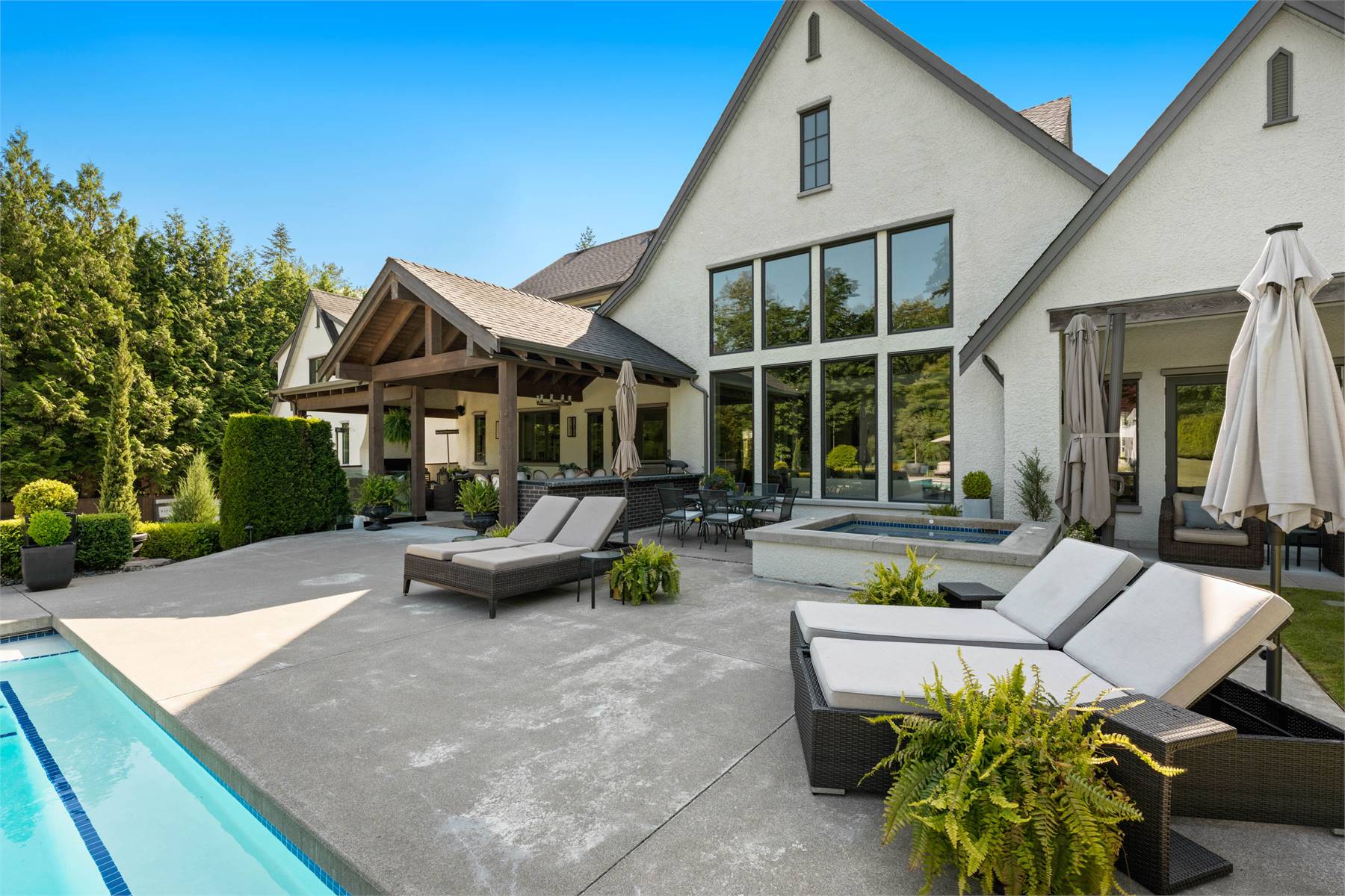 Welcome to this stunning European-inspired residence where elegance and luxury seamlessly intertwine, creating an environment of refined indoor coziness and serene outdoor relaxation and recreation. Upon entering, the home immediately embraces you with natural light, continued through to the luminous two-story great room. The fluid design leads to a sophisticated kitchen, equipped with a spacious prep island and extensive storage, perfect for culinary aficionados. The main level also features a serene primary bedroom, complete with a private porch and spa-like ensuite for ultimate relaxation. Ascend to the upper floor to find five additional bedrooms and a versatile bonus room, offering both comfort and adaptability, complemented by a distinct breezeway-connected double garage with potential for additional flex space above.