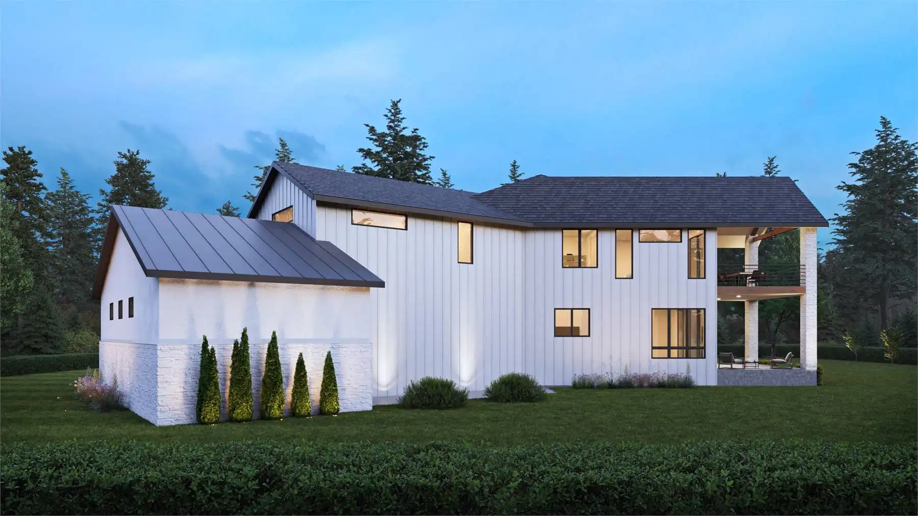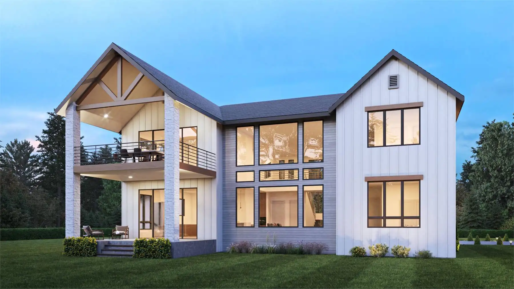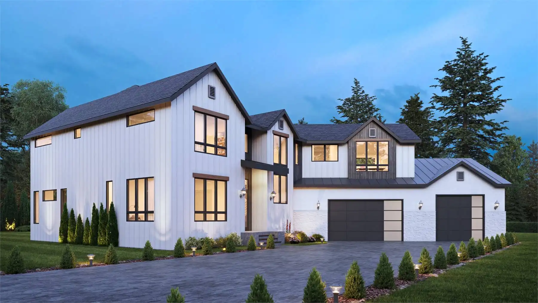 House Plan 9135 is a unique transitional design with an angled garage with parking for three, ready to fit into neighborhood! The two-story layout offers 4,612 square feet with four bedrooms, four full bathrooms, and two powder rooms. Check out the volume ceilings in the great room and foyer that really maximize the feel of that square footage! When you first enter, you'll find an office beside the foyer and open living in back. The garage conveniently connects through the pantry and the mudroom with stacked laundry. There's also a bedroom suite ideal for guests or in-laws. Upstairs, the master suite sits on one side of the bridge while the other two bedroom suites are on the other. Each one has a vaulted ceiling and walk-in closet! The main laundry room and a bonus are also up here. Just imagine how you could live in this thoughtful design!