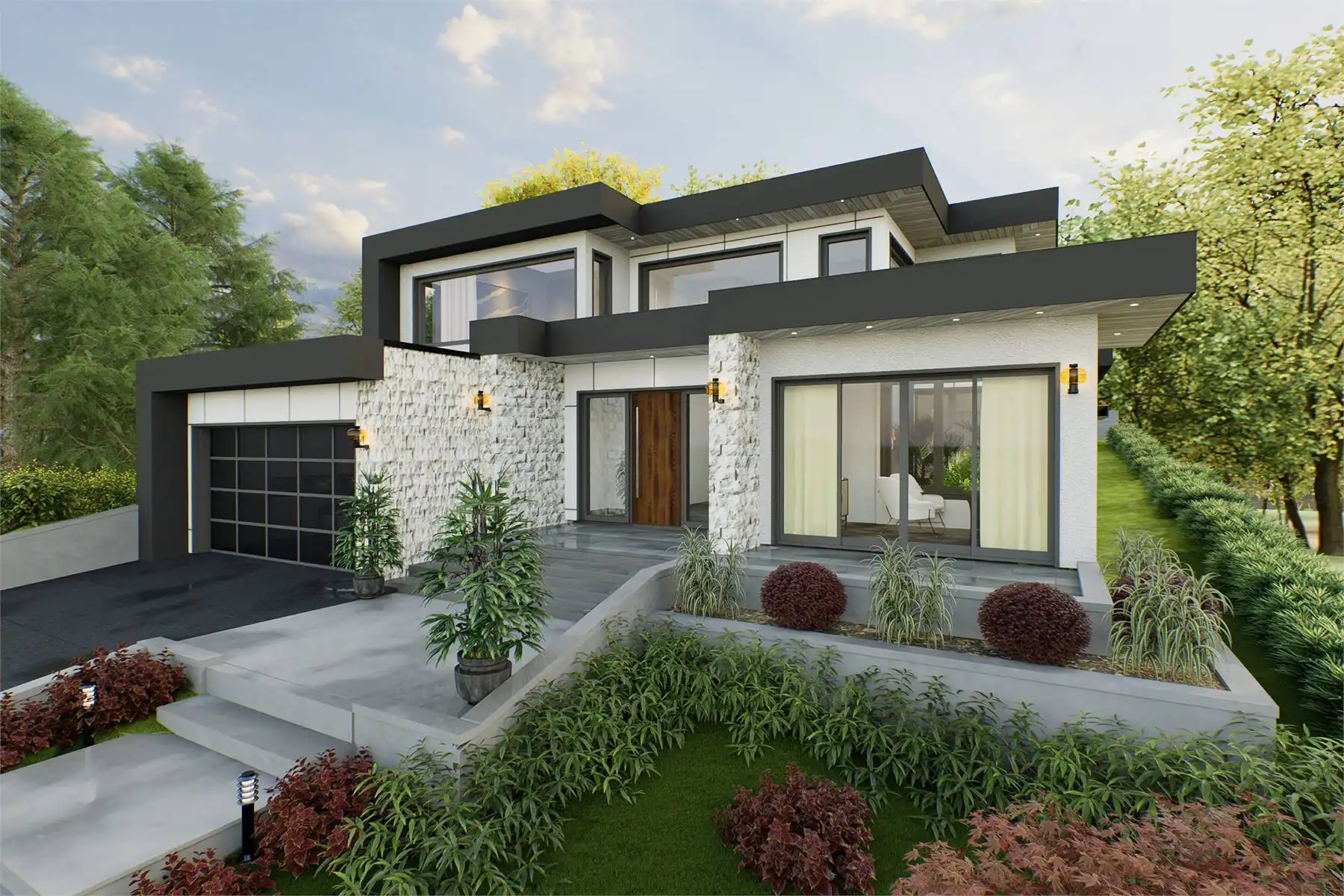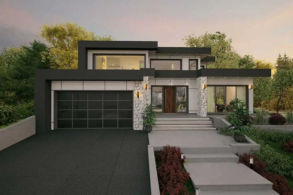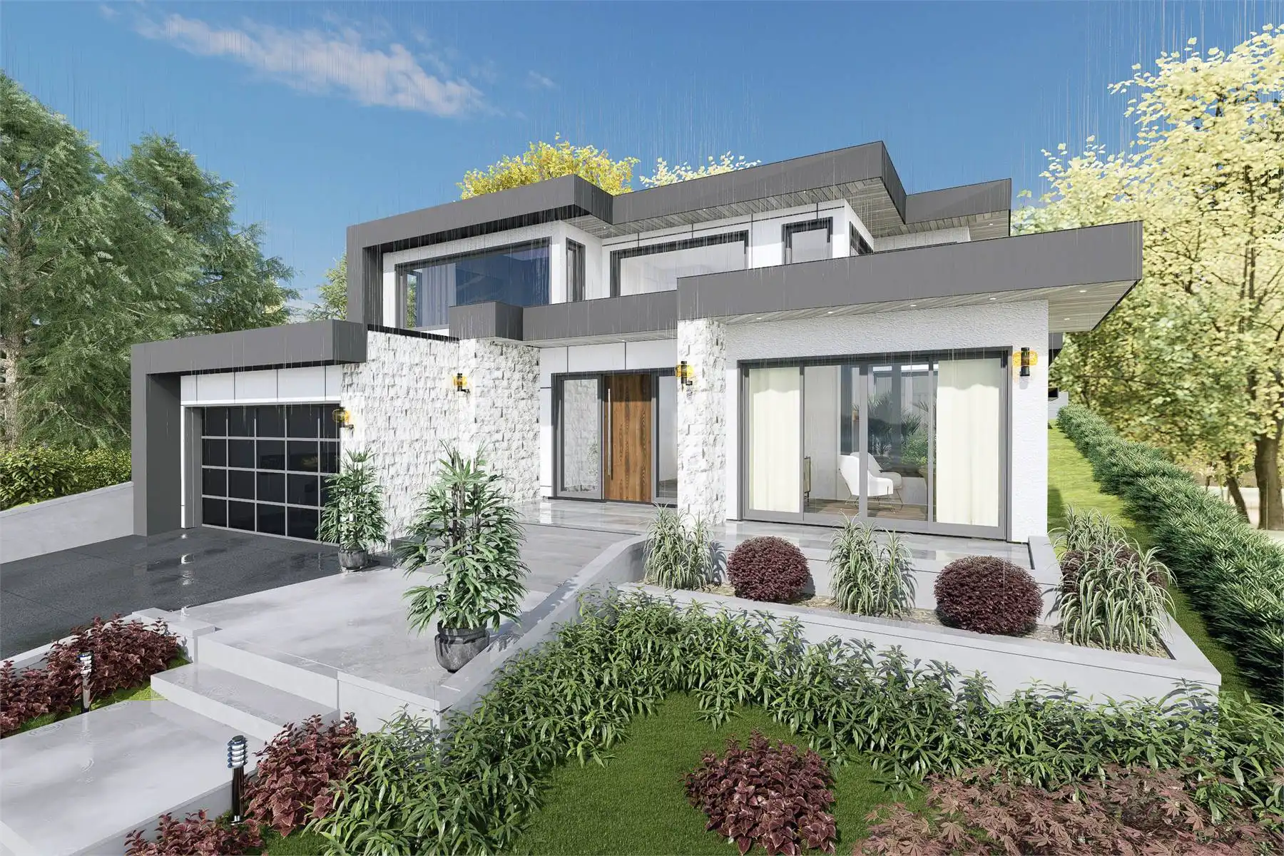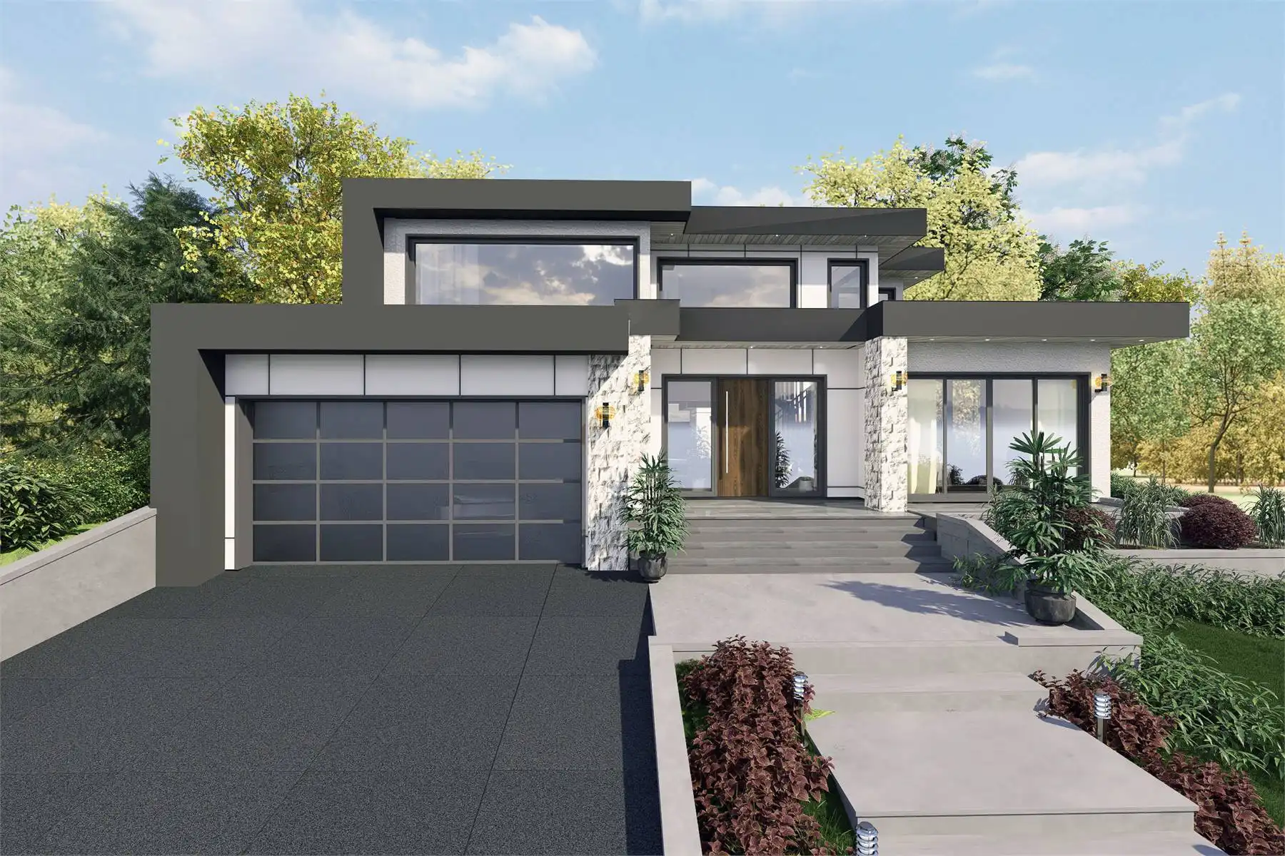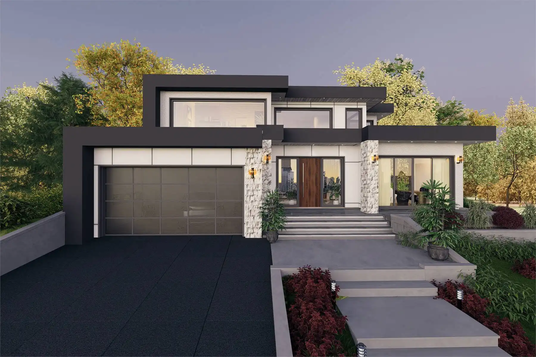 Discover smart, modern design with House Plan 9140, offering a stunning three-bedroom layout. Nestled within serene surroundings, this residence epitomizes contemporary elegance and functional living. Upon entry, a grand foyer welcomes you with sleek architectural details and abundant natural light. To the right, a private study provides an ideal space for work-from-home situations. The open-concept living area seamlessly integrates the kitchen, dining, and family spaces, perfect for entertaining or unwinding with loved ones. The L-shaped kitchen boasts ample counter space, a spacious island, and generous storage. Retreat to the third floor to find three bedrooms, each with its own private ensuite. Outside, a large deck invites you to embrace outdoor living amidst the tranquil surroundings.