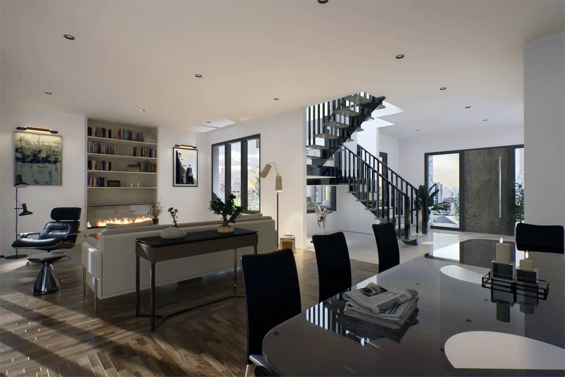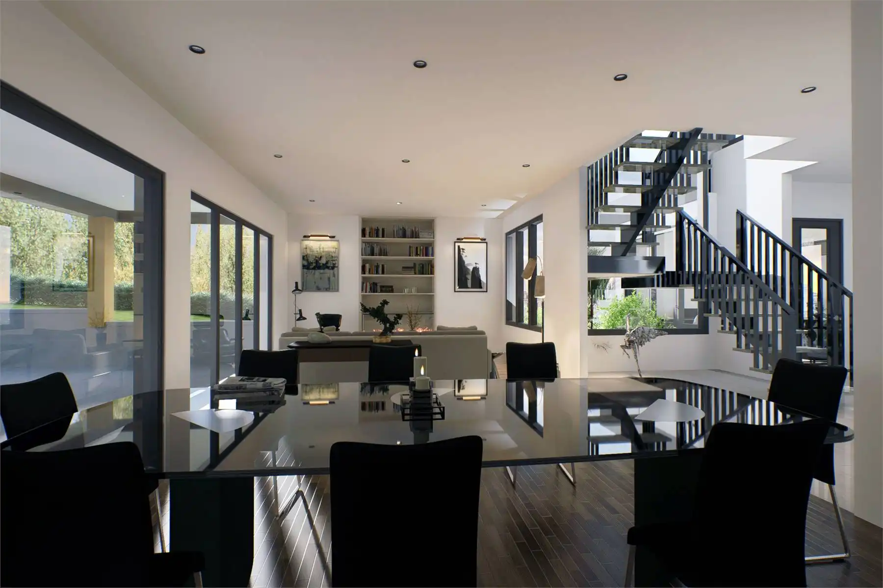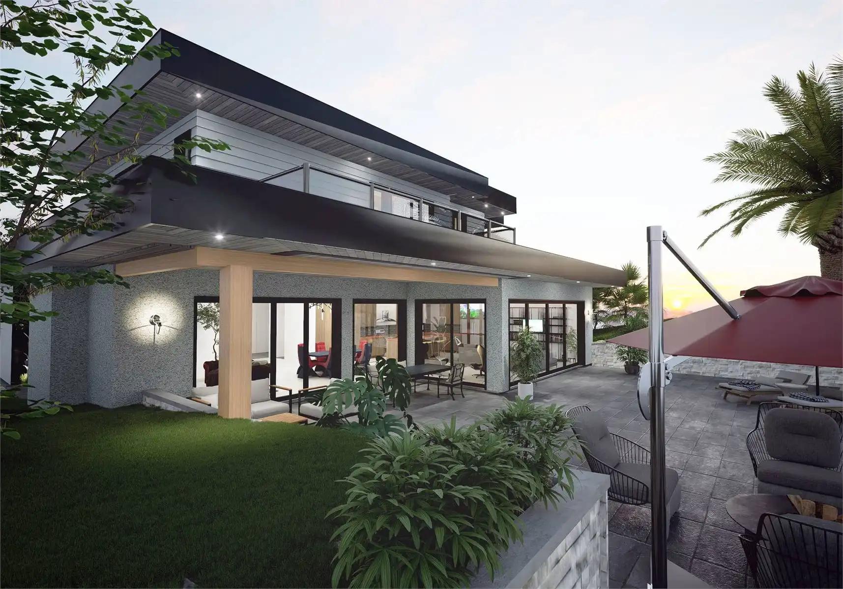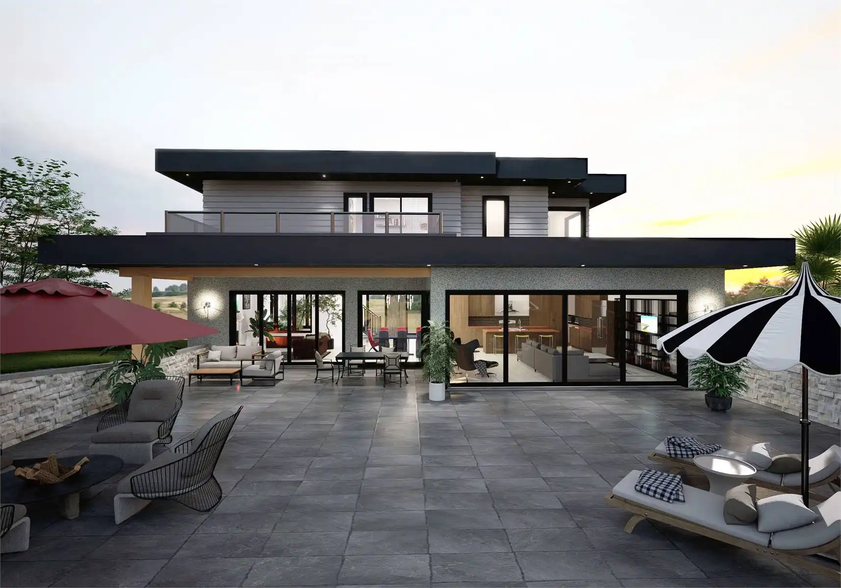 Discover smart, modern design with House Plan 9140, offering a stunning three-bedroom layout. Nestled within serene surroundings, this residence epitomizes contemporary elegance and functional living. Upon entry, a grand foyer welcomes you with sleek architectural details and abundant natural light. To the right, a private study provides an ideal space for work-from-home situations. The open-concept living area seamlessly integrates the kitchen, dining, and family spaces, perfect for entertaining or unwinding with loved ones. The L-shaped kitchen boasts ample counter space, a spacious island, and generous storage. Retreat to the third floor to find three bedrooms, each with its own private ensuite. Outside, a large deck invites you to embrace outdoor living amidst the tranquil surroundings.