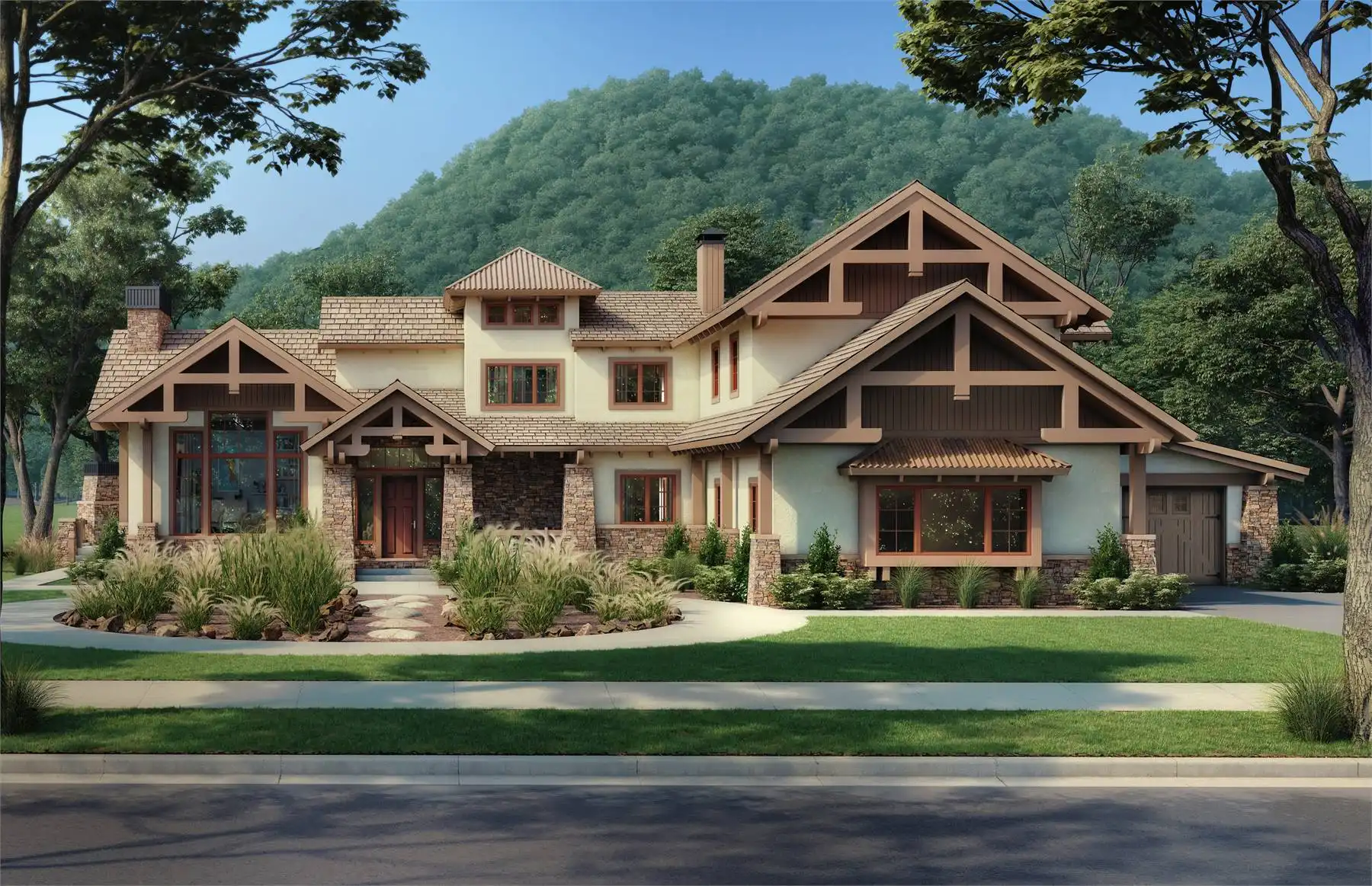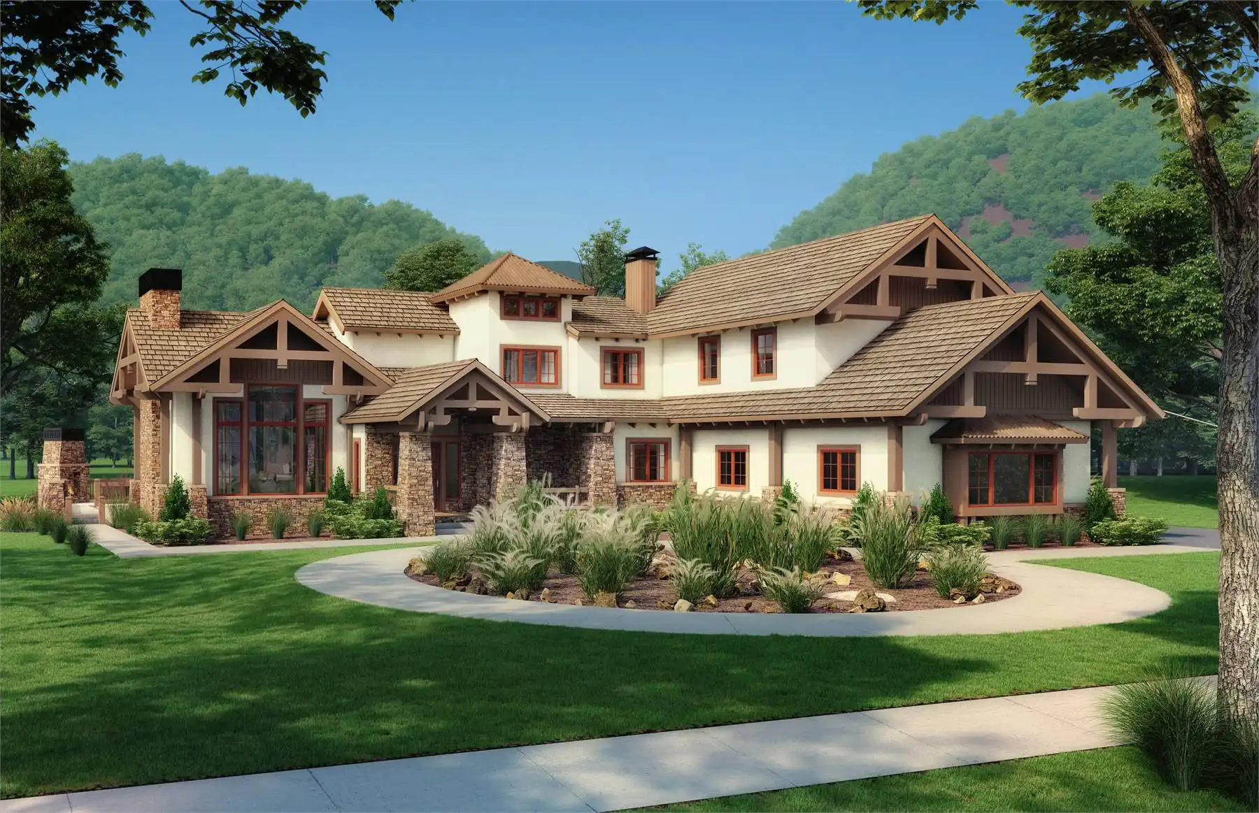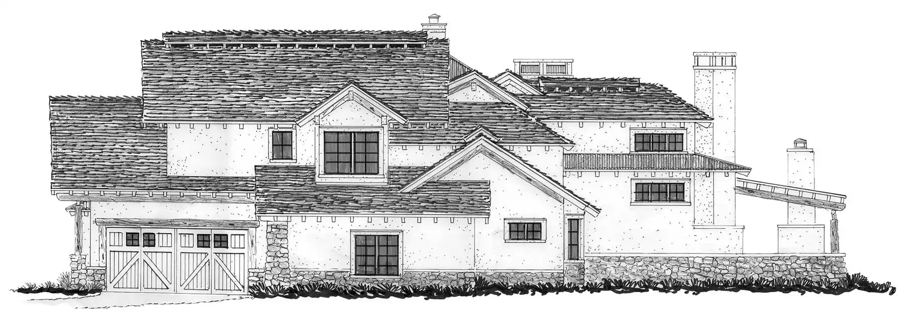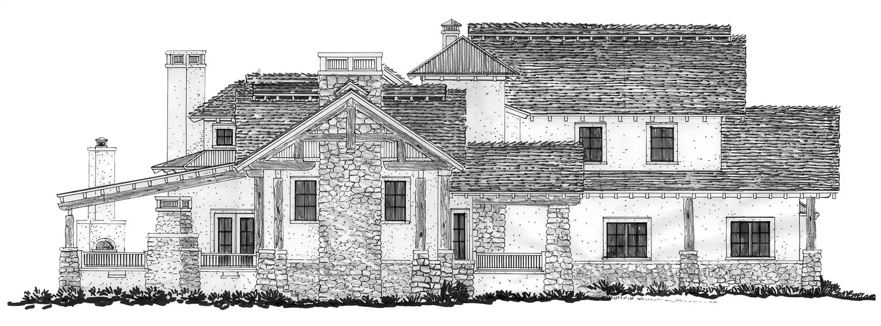 Need a beautiful home for a lakeside location? House Plan 9148 is here for your consideration with 3,578 square feet spread across two levels! The main level features a great room with a fireplace, informal dining, an L/U-shaped kitchen, and a hearth nook with another fireplace. The master suite is also on the main level and boasts its own corner fireplace and a five-piece bath with a sauna. Study space and two more bedroom suites are placed upstairs. House Plan 9148 has two garages that park three cars in total and an outdoor kitchen, so it really covers all the bases!