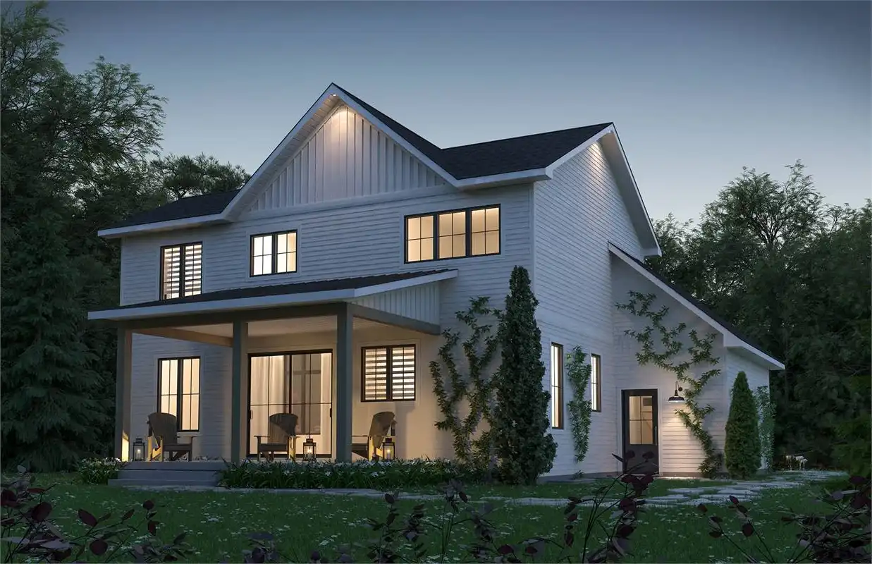 House Plan 9152 is the home of your dreams! This farmhouse-style home offers 3 bedrooms, 1.5 bathrooms, and a 1-car garage. The entrance features a walk-in mudroom and bench area, perfect for keeping your home clean and organized. The well-equipped kitchen features a large island, spacious pantry, and is open to the dining room. The living room is perfect for gatherings with family and friends and features a cozy fireplace with shelves arranged on each side. Upstairs, you'll find a master bedroom with a walk-in closet as well as direct access to the family bathroom. Choose this home for well-designed rooms, natural light, and a large covered porch.