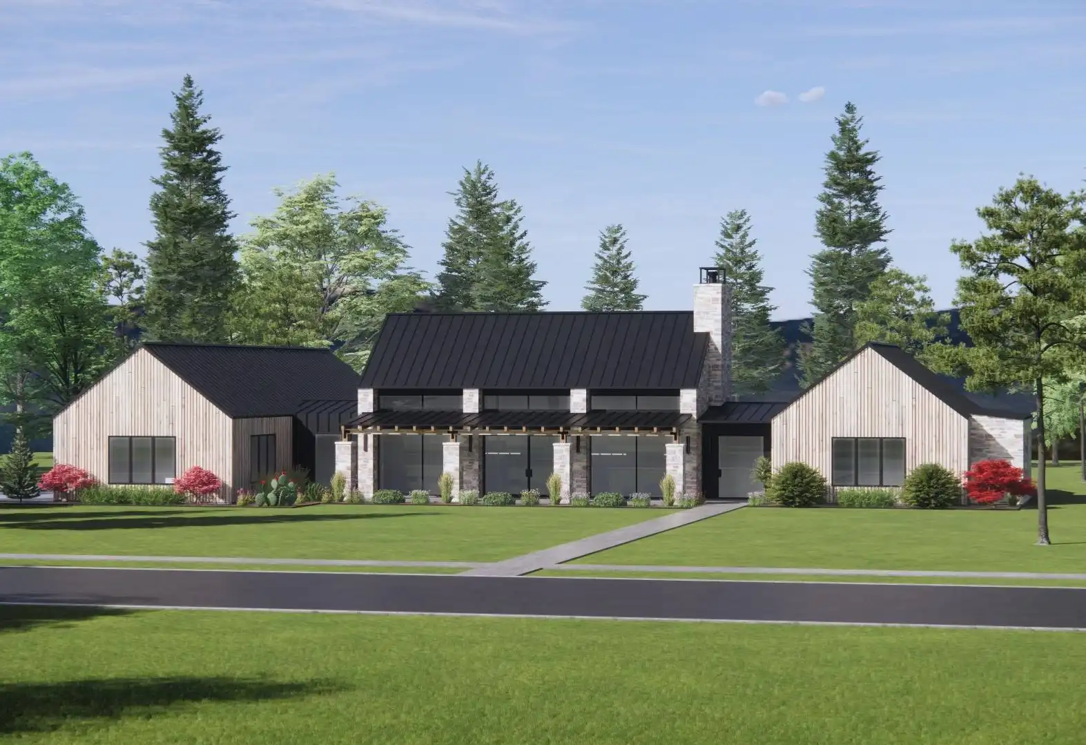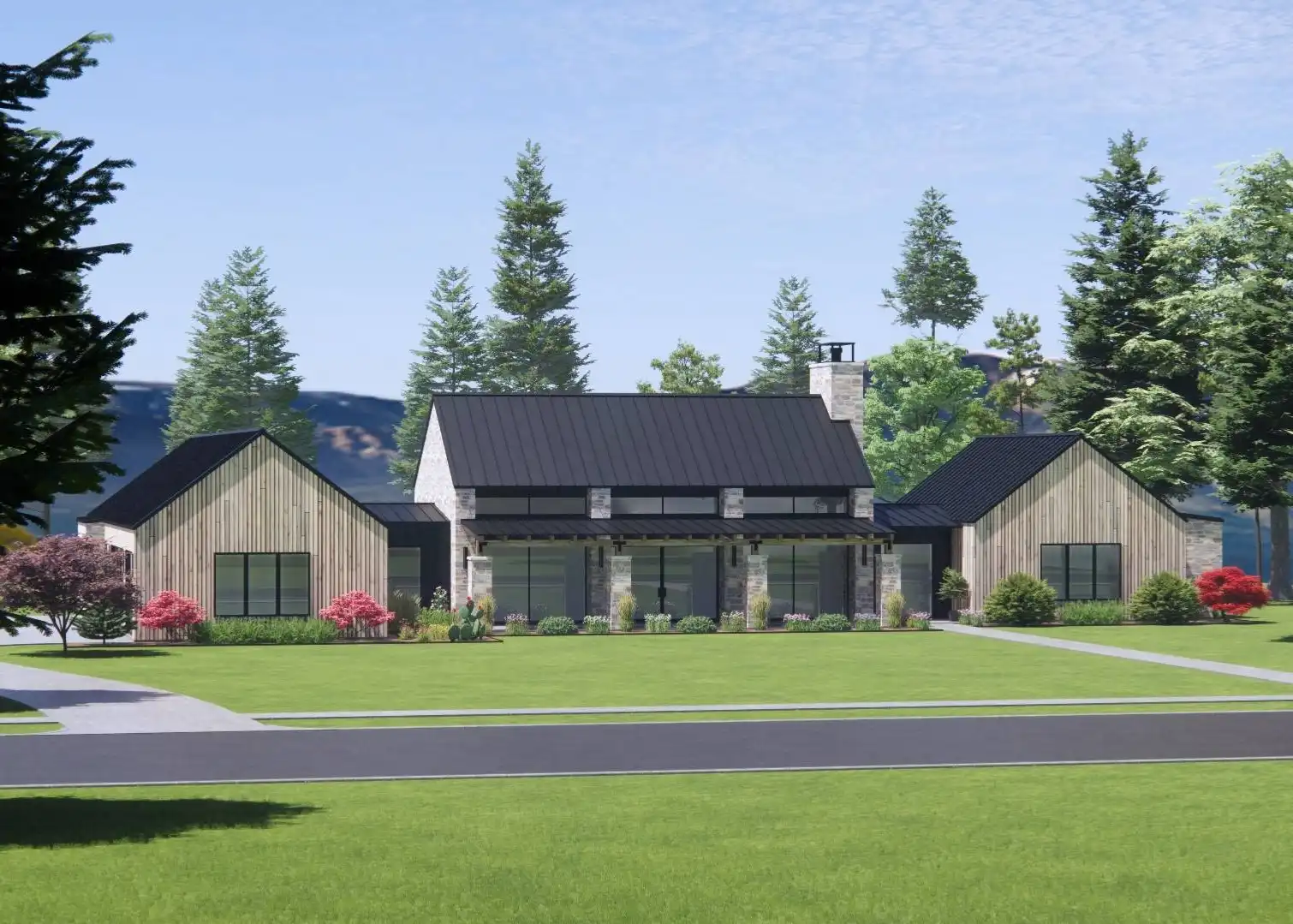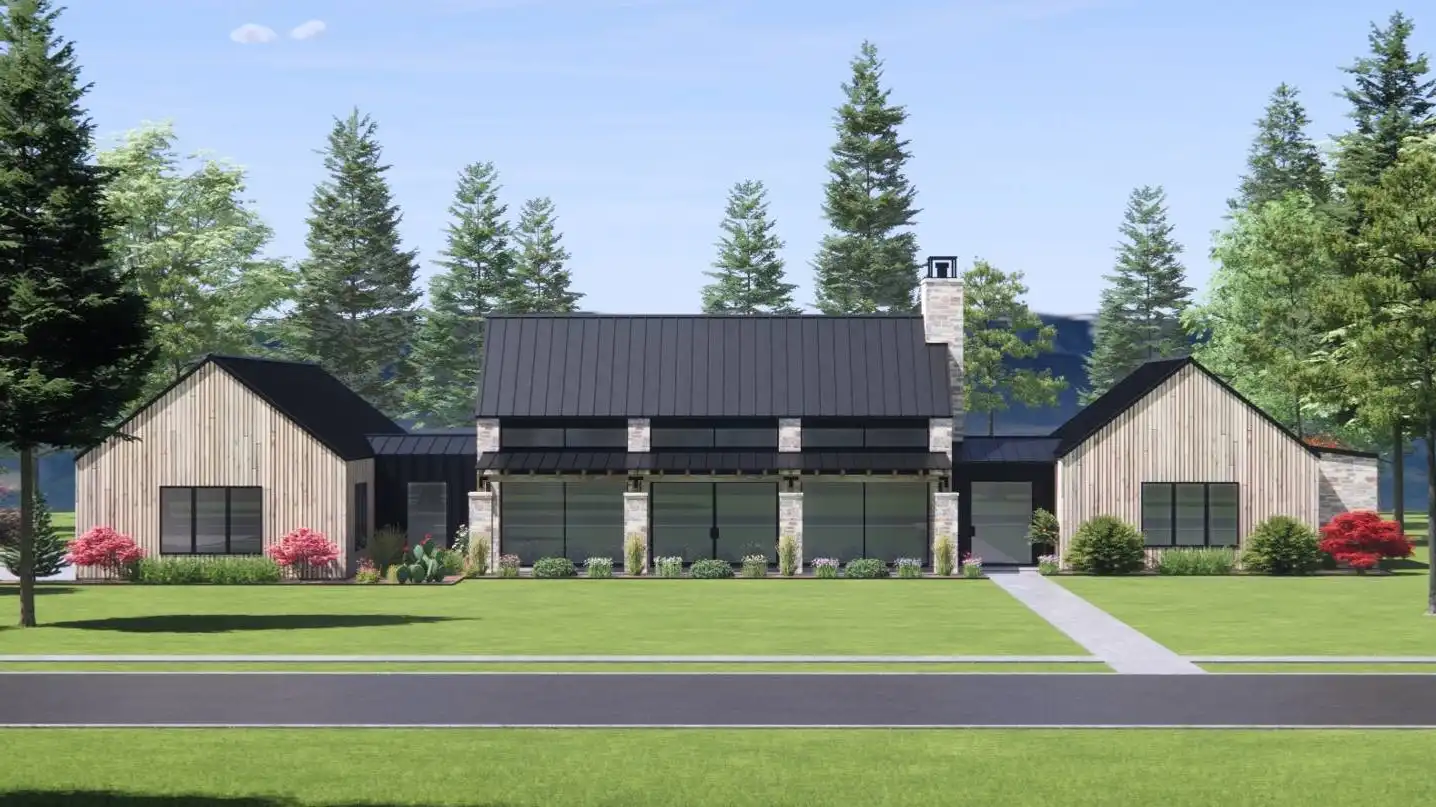 Stop and explore the possibilities in House Plan 9197 if you're looking for a chic ranch made to take in views! This broad layout features 3,025 square feet with four split bedrooms and three-and-a-half bathrooms. The great room makes up the center of the floor plan and wows with its totally open-concept design, vaulted ceiling spanning the whole space, and walls of windows in front and back. Behind the kitchen, you'll find the walk-in pantry, mudroom, laundry, and luxurious five-piece primary suite tucked behind the garage. The other three bedrooms are across the whole house, off the entry that connects the front porch to the back. What a unique home that checks the boxes of so many families these days!