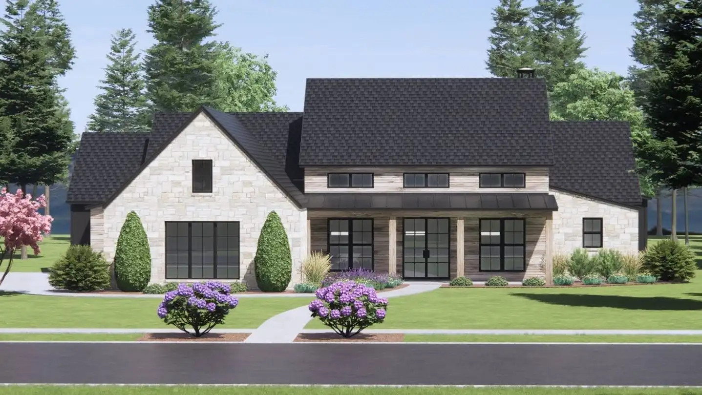 Need a one-story home with rustic character and a great layout for today's families? See what House Plan 9198 has to offer behind its stone and wood facade! It provides 3,028 square feet in a split-bedroom layout. The center of the floor plan includes the common areas, including the study off the foyer and the totally open-concept great room with an island kitchen and a vaulted living and dining. On the side behind the garage, you'll find the luxurious primary suite with a vaulted bedroom, a vaulted five-piece bathroom, and a walk-in closet that connects to the laundry. The other three bedroom suites are across the house. One is in the front hallway while the other two are in the back. There's also a large back porch with access from the great room, primary bedroom, and back hallway to really blur the lines between indoors and out!