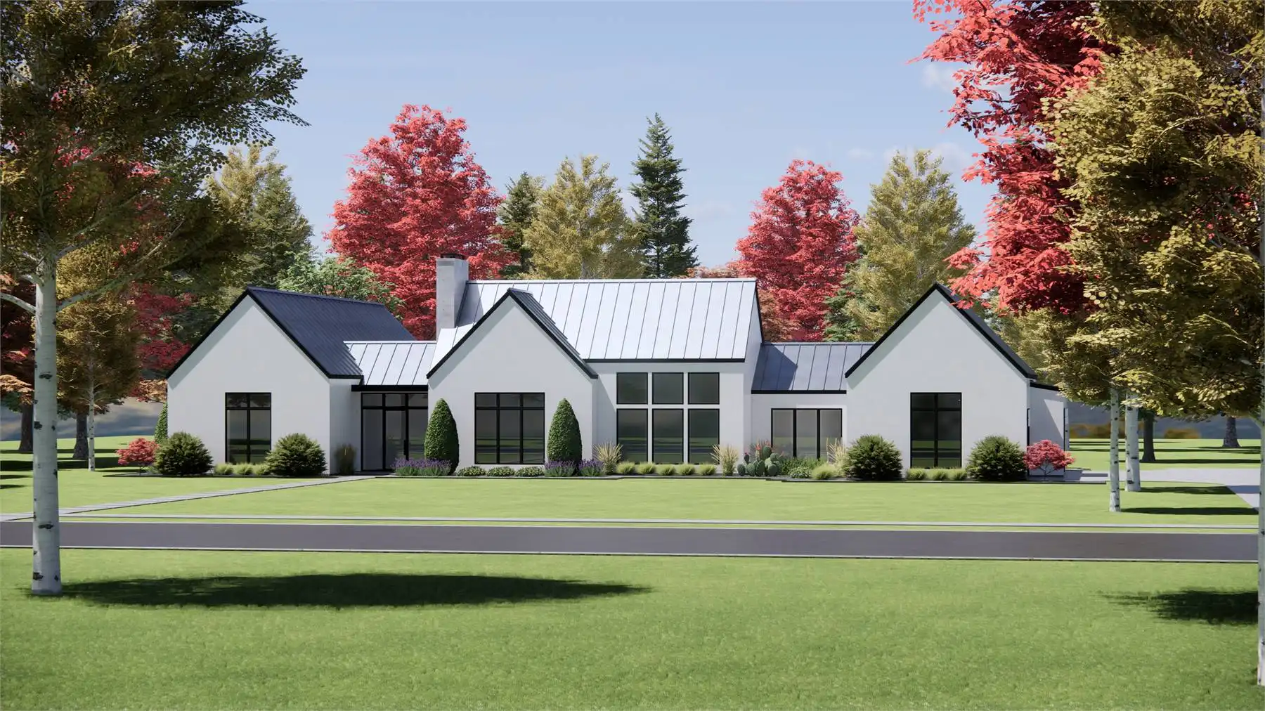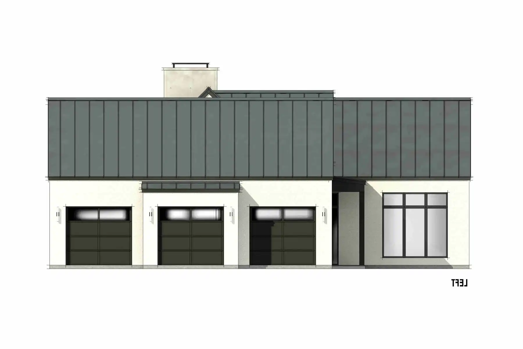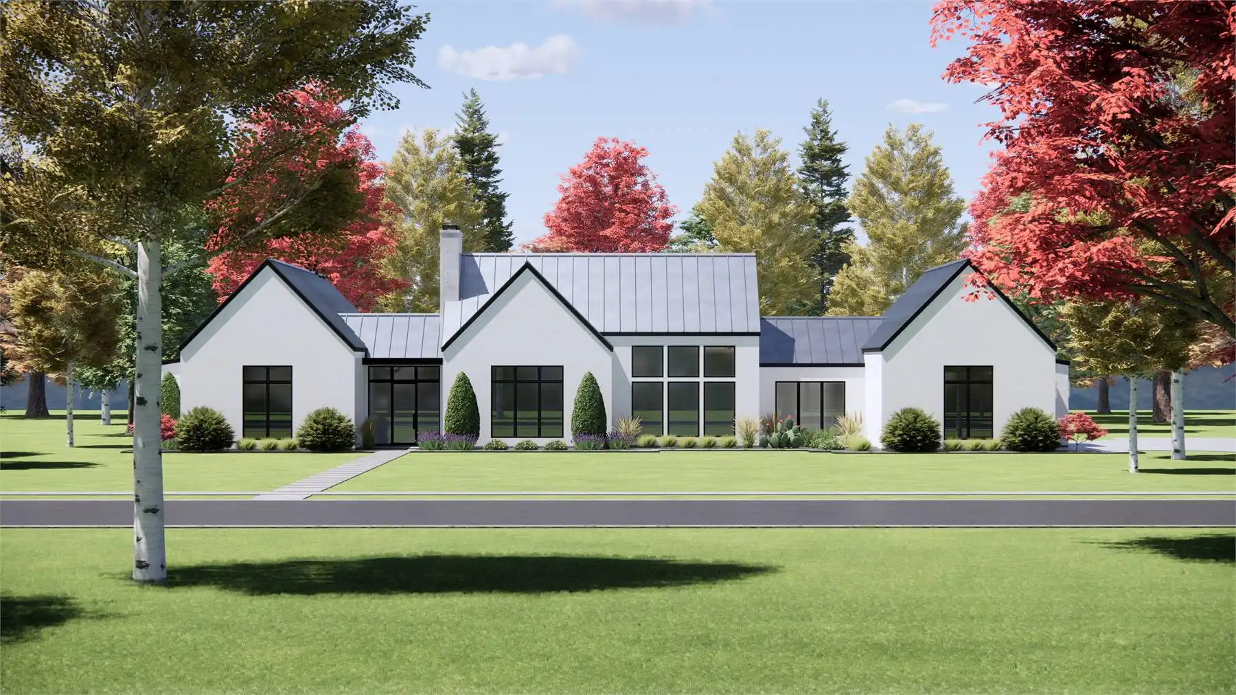 House Plan 9216 is an amazing transitional design of Scandinavian inspiration! It offers 2,617 square feet, three bedrooms, and two bathrooms in a wide layout with plenty of windows for taking in views. All the bedrooms are placed on one side of the entry, with the primary suite in back and the secondary bedrooms and a hall bath in front. The common areas including the family room, U-shaped kitchen, and dining space are on the opposite side of the entry to clearly define living and sleeping quarters. The three-car garage enters into the house via a mudroom beside the kitchen, which is perfect for easily unloading groceries and limiting disturbance in the bedrooms when you come home late!