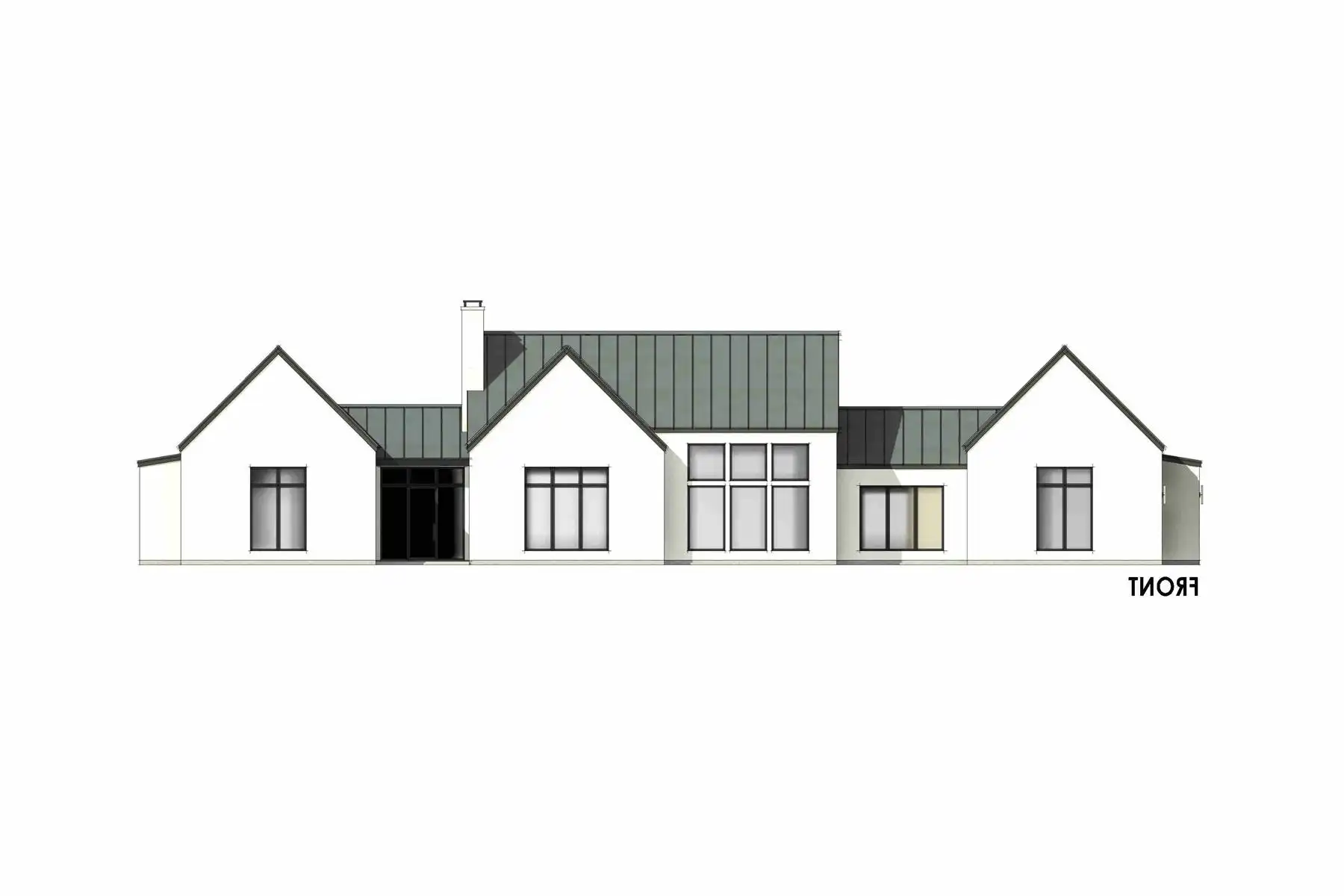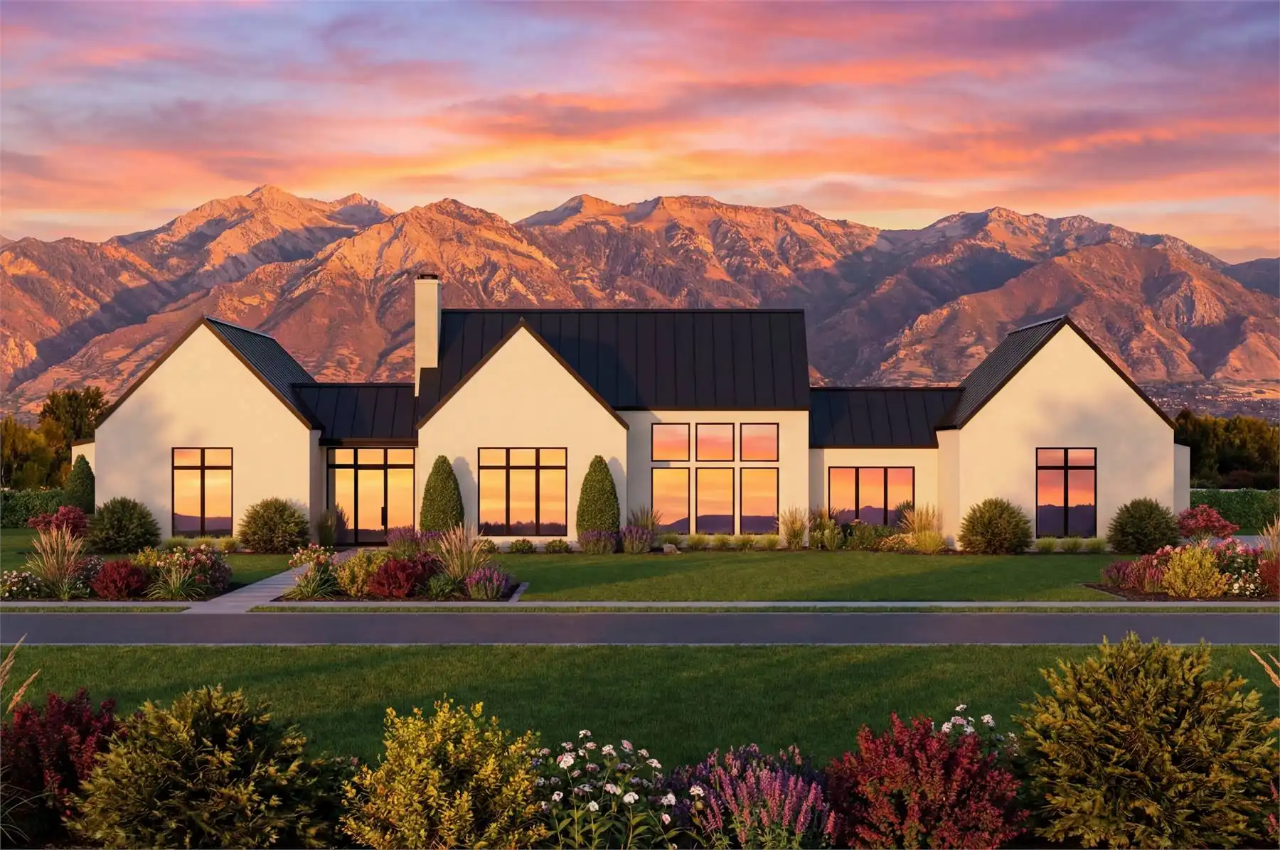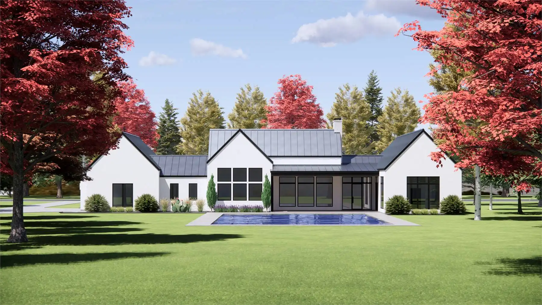 House Plan 9216 is an amazing transitional design of Scandinavian inspiration! It offers 2,617 square feet, three bedrooms, and two bathrooms in a wide layout with plenty of windows for taking in views. All the bedrooms are placed on one side of the entry, with the primary suite in back and the secondary bedrooms and a hall bath in front. The common areas including the family room, U-shaped kitchen, and dining space are on the opposite side of the entry to clearly define living and sleeping quarters. The three-car garage enters into the house via a mudroom beside the kitchen, which is perfect for easily unloading groceries and limiting disturbance in the bedrooms when you come home late!