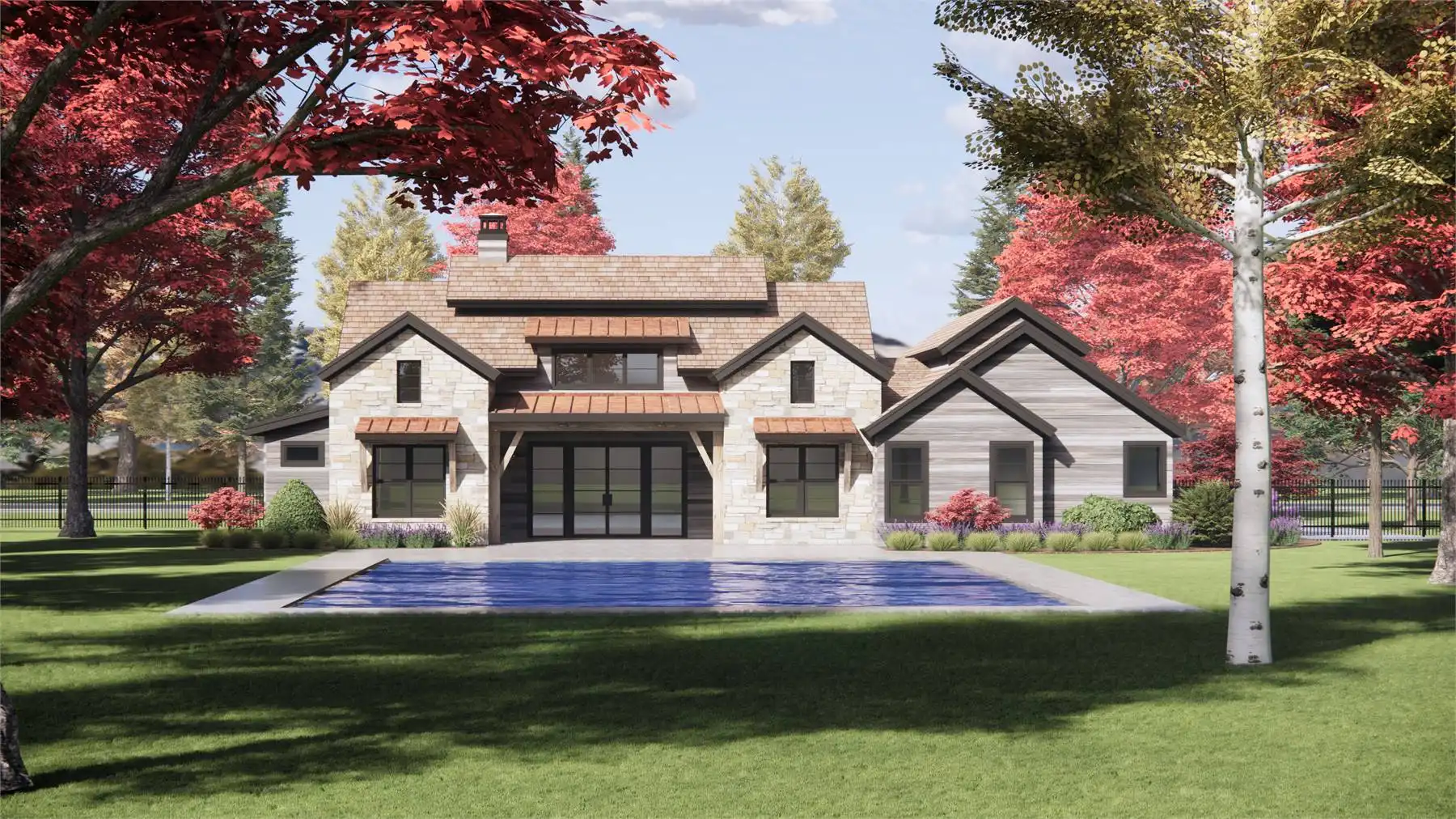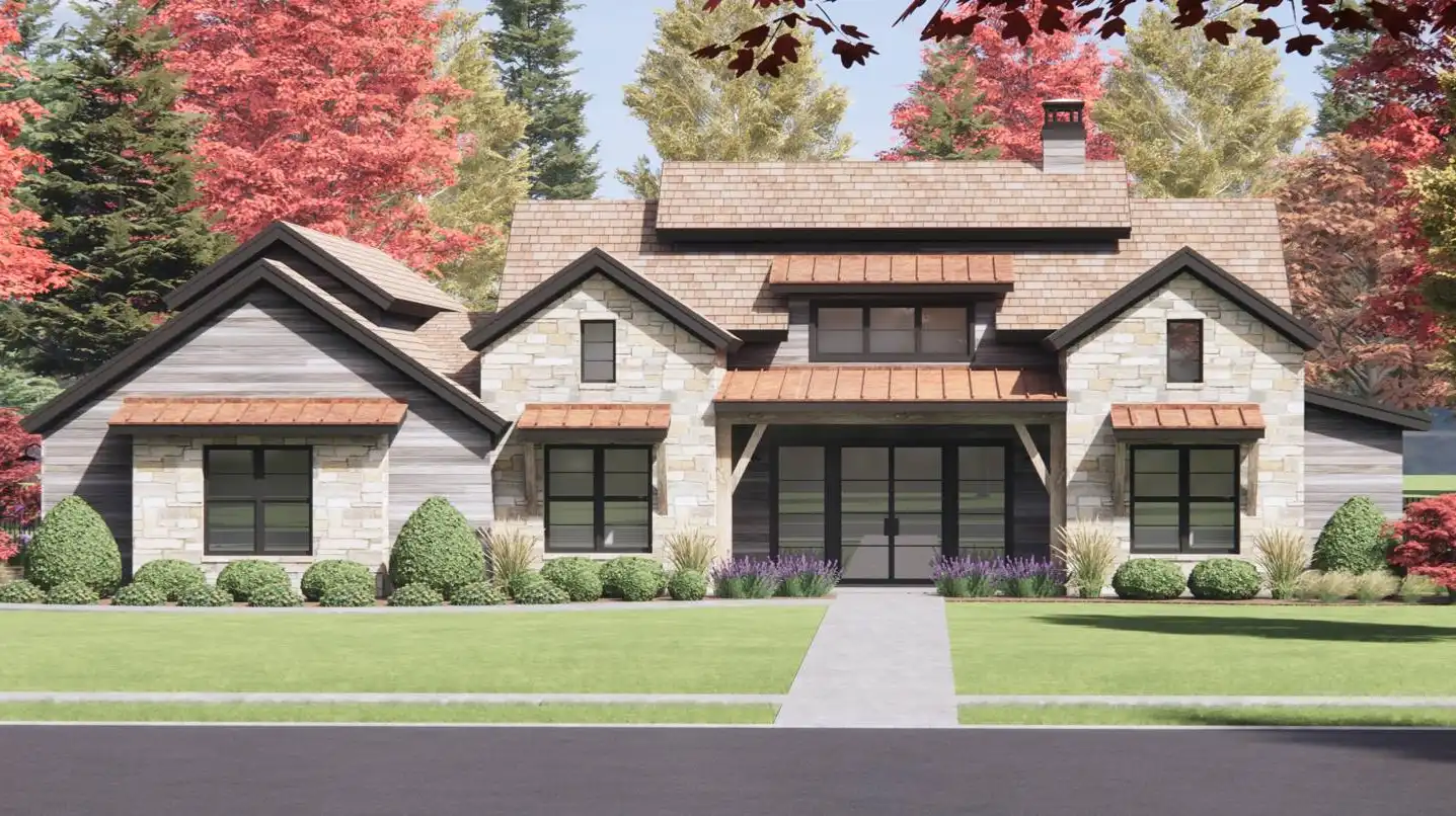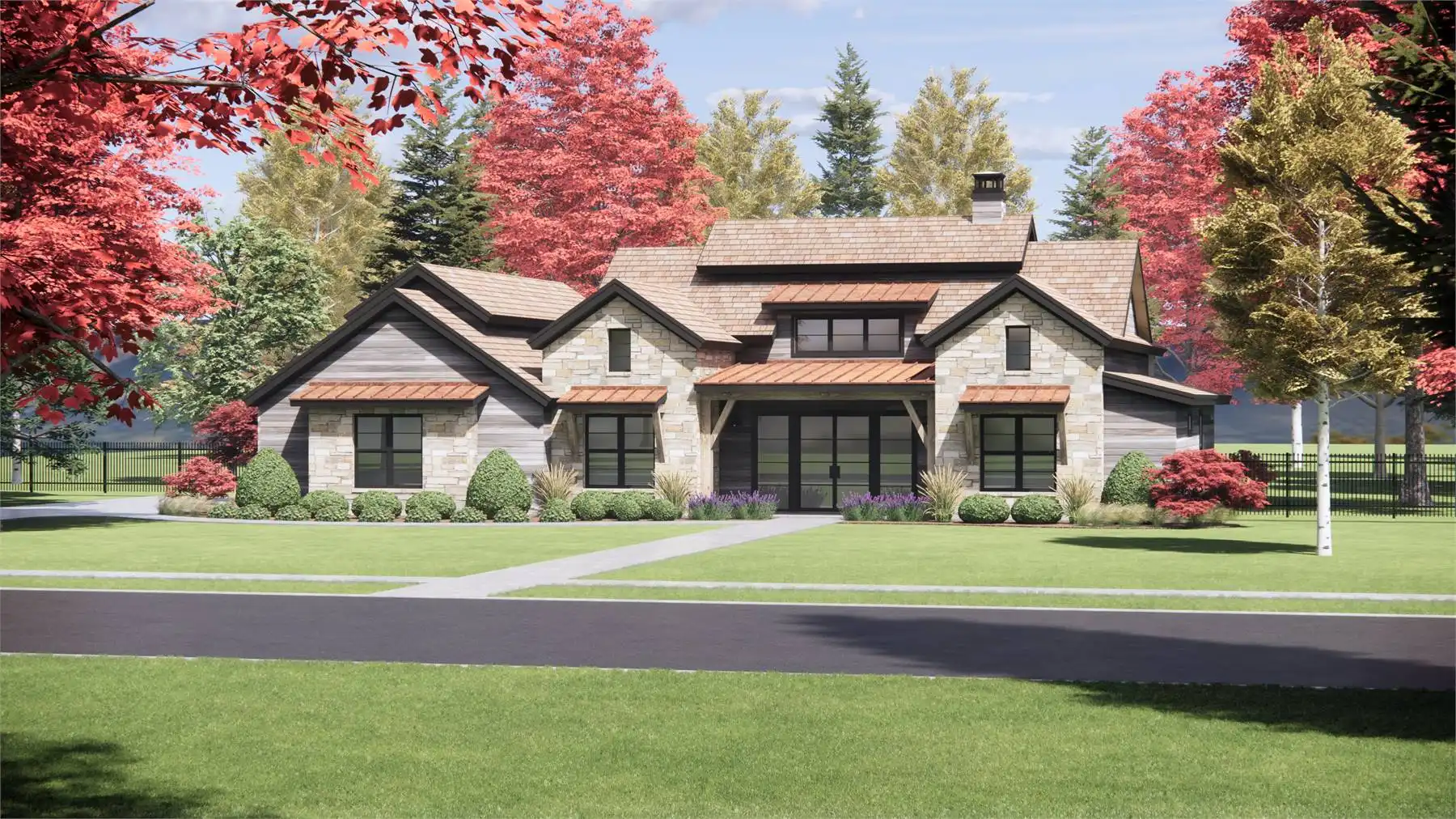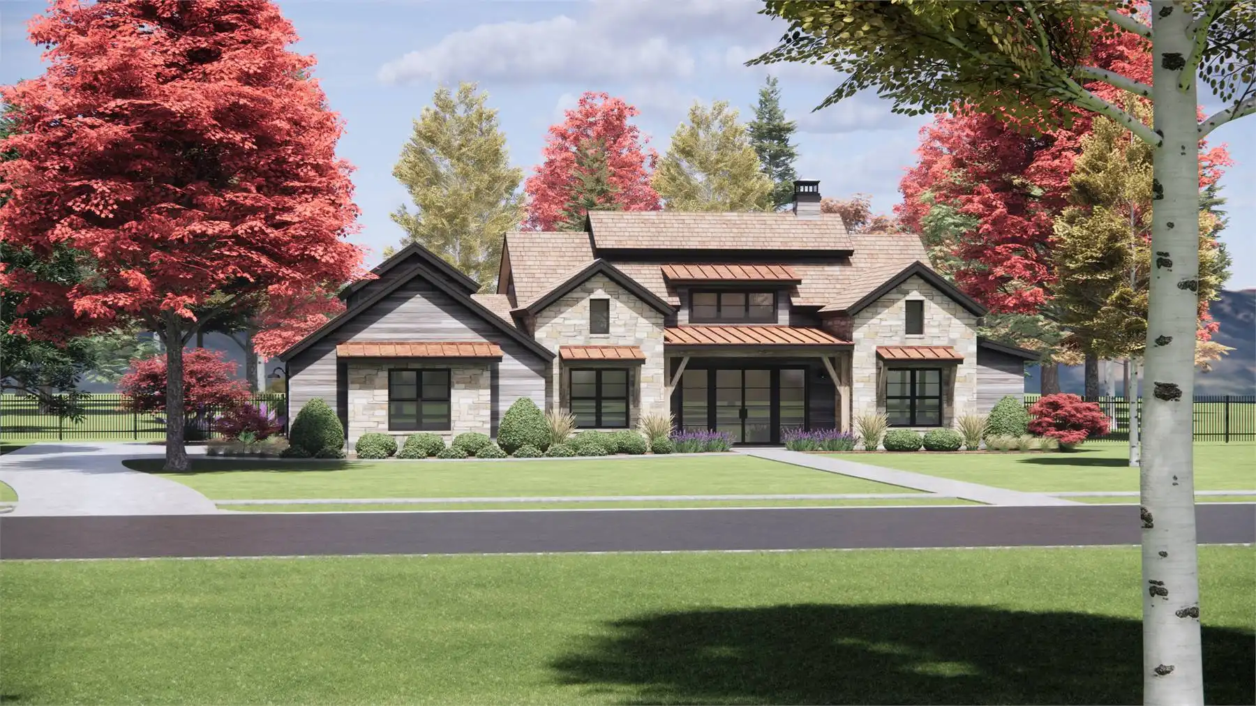See what House Plan 9217 has to offer if you're looking for a stylish Southwestern-style ranch! This beautifully rustic home provides 2,390 square feet with four bedrooms and three-and-a-half bathrooms. The common areas fill out the center of the floor plan, including the vaulted great room, island kitchen, dining nook, and back porch. To the side with the garage, you'll find a luxurious vaulted primary bedroom with a five-piece ensuite. To the other side, there's a smaller bedroom suite and a pair of Jack-and-Jill bedrooms that have their own private vanities. Every member of the family will enjoy this thoughtful layout!
