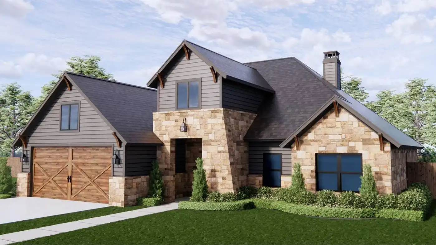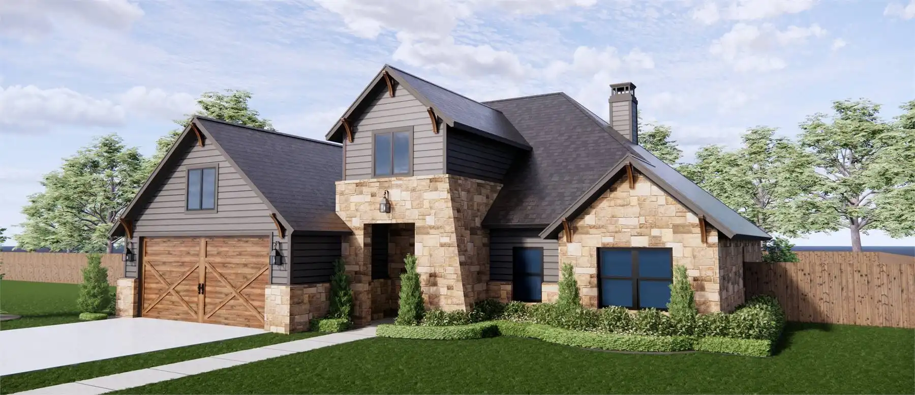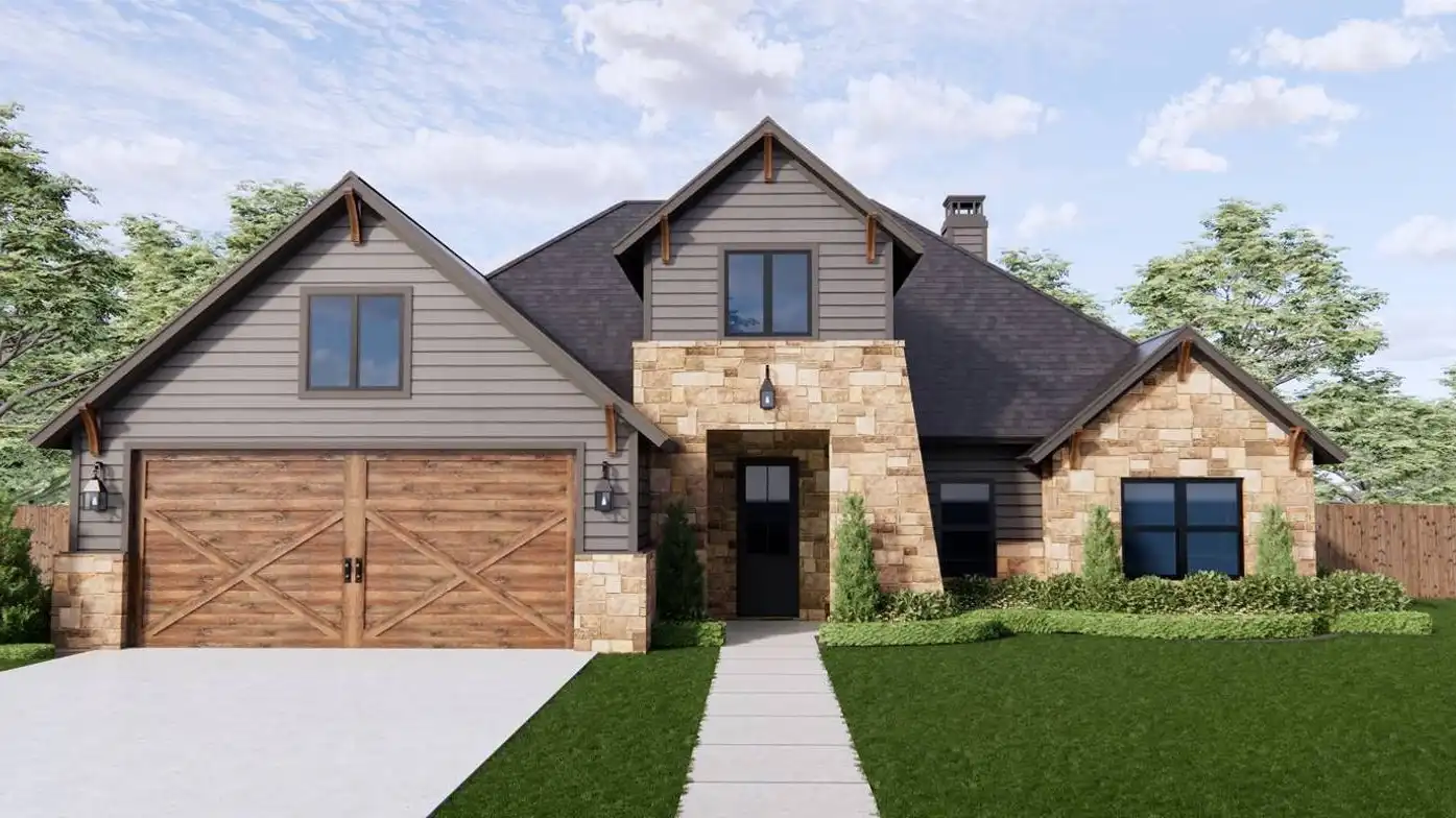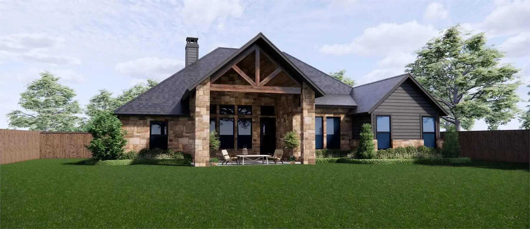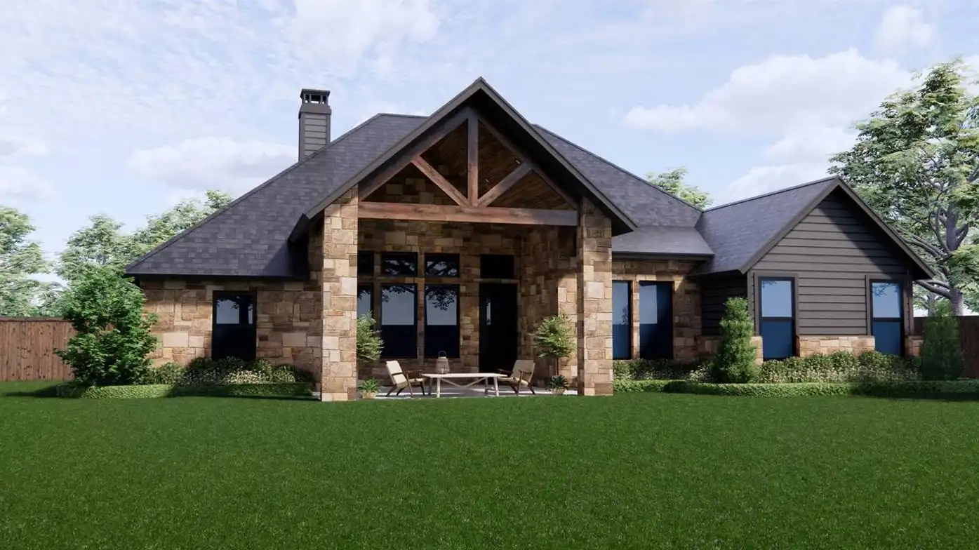 Can't choose between a farmhouse or a Mediterranean design? With House Plan 9242, you don't have to! This unique transitional plan blends farmhouse gables and Mediterranean stone and wood work into a refreshing new look. Inside, it offers 1,952 square feet with four bedrooms and two bathrooms split across the open-concept living. Make sure to notice the beams in the family room and the vaulted ceiling in the primary bedroom! There's also a vaulted covered porch to allow you to spread out in the fresh air. Just like the architectural styles that it draws from call for!