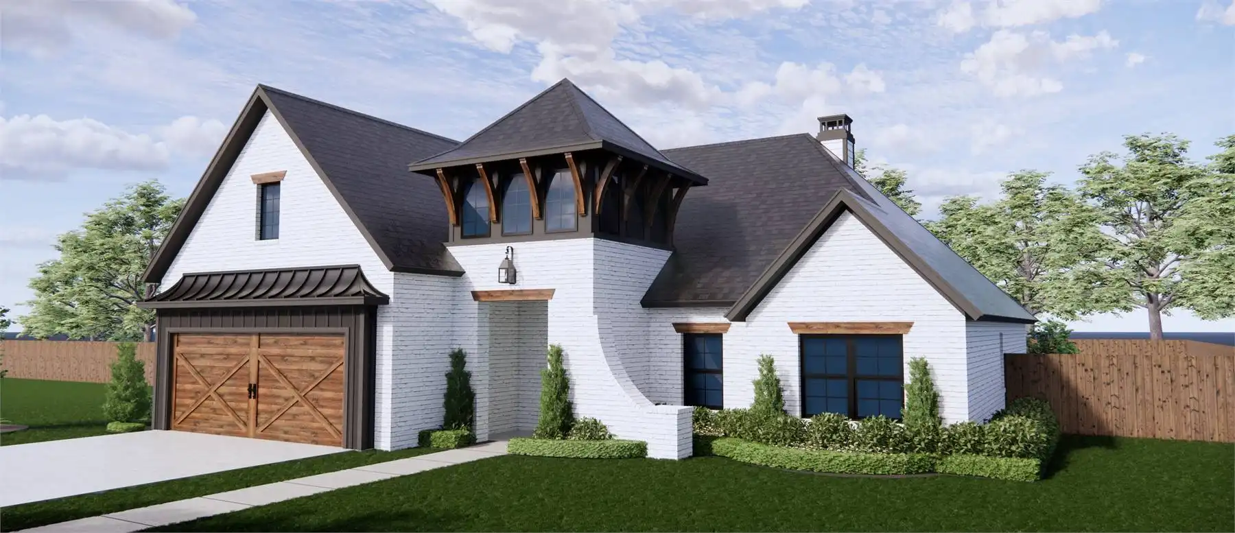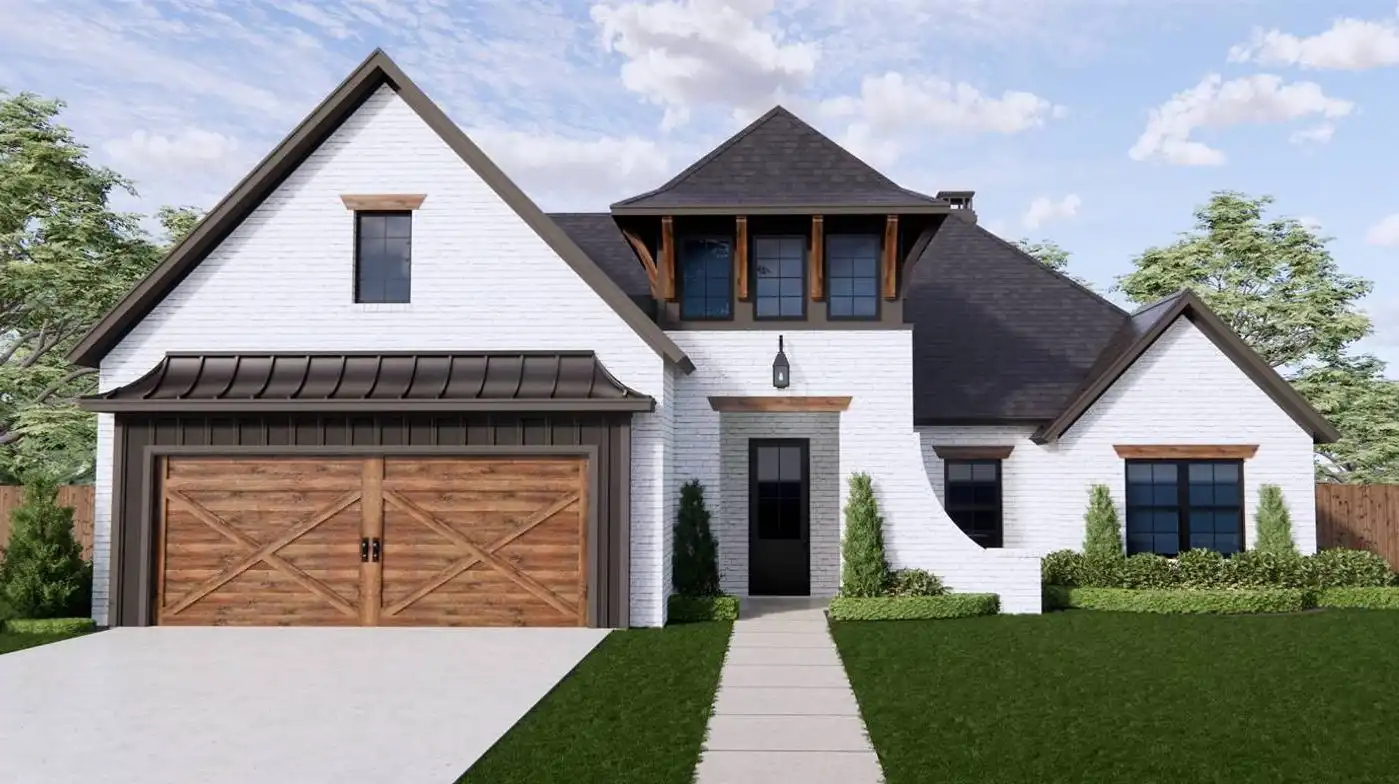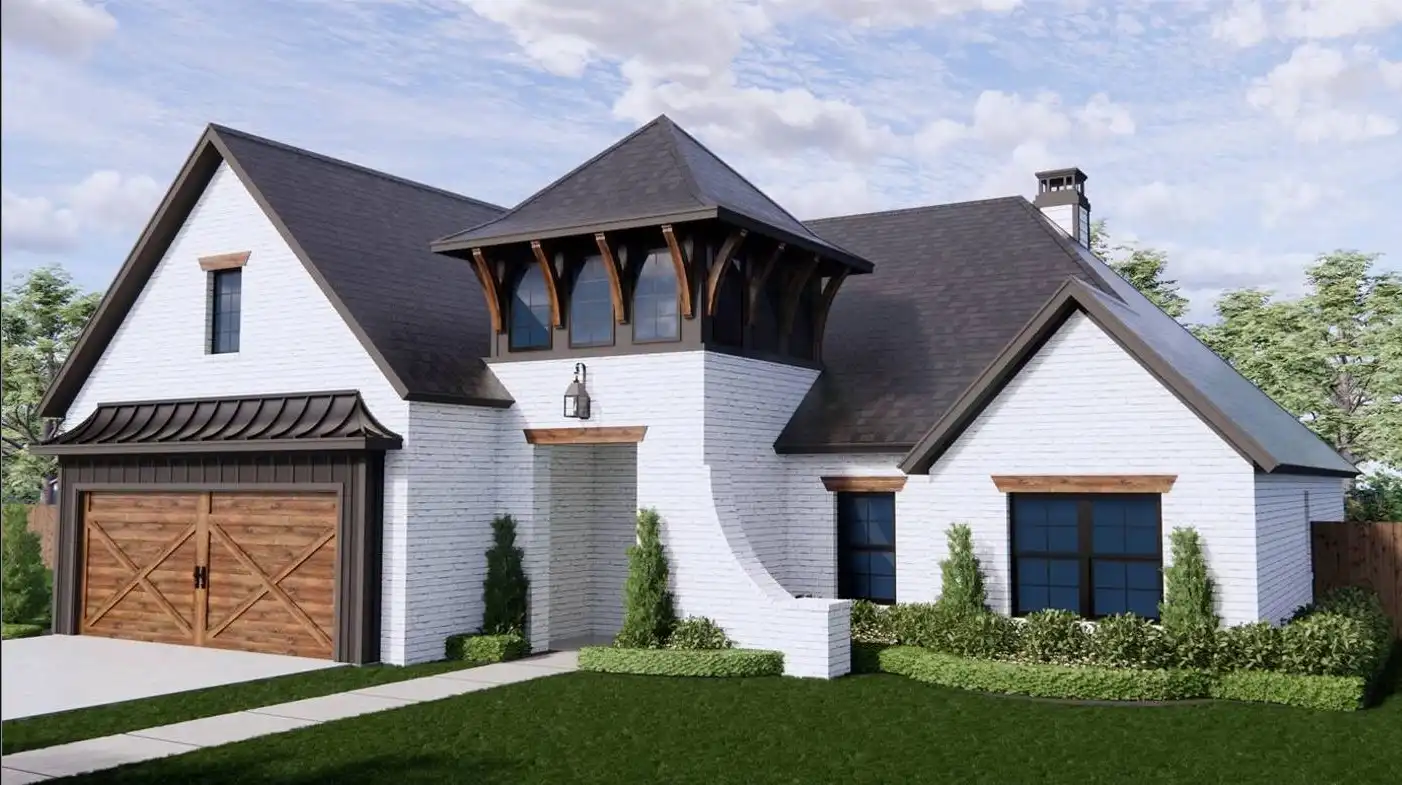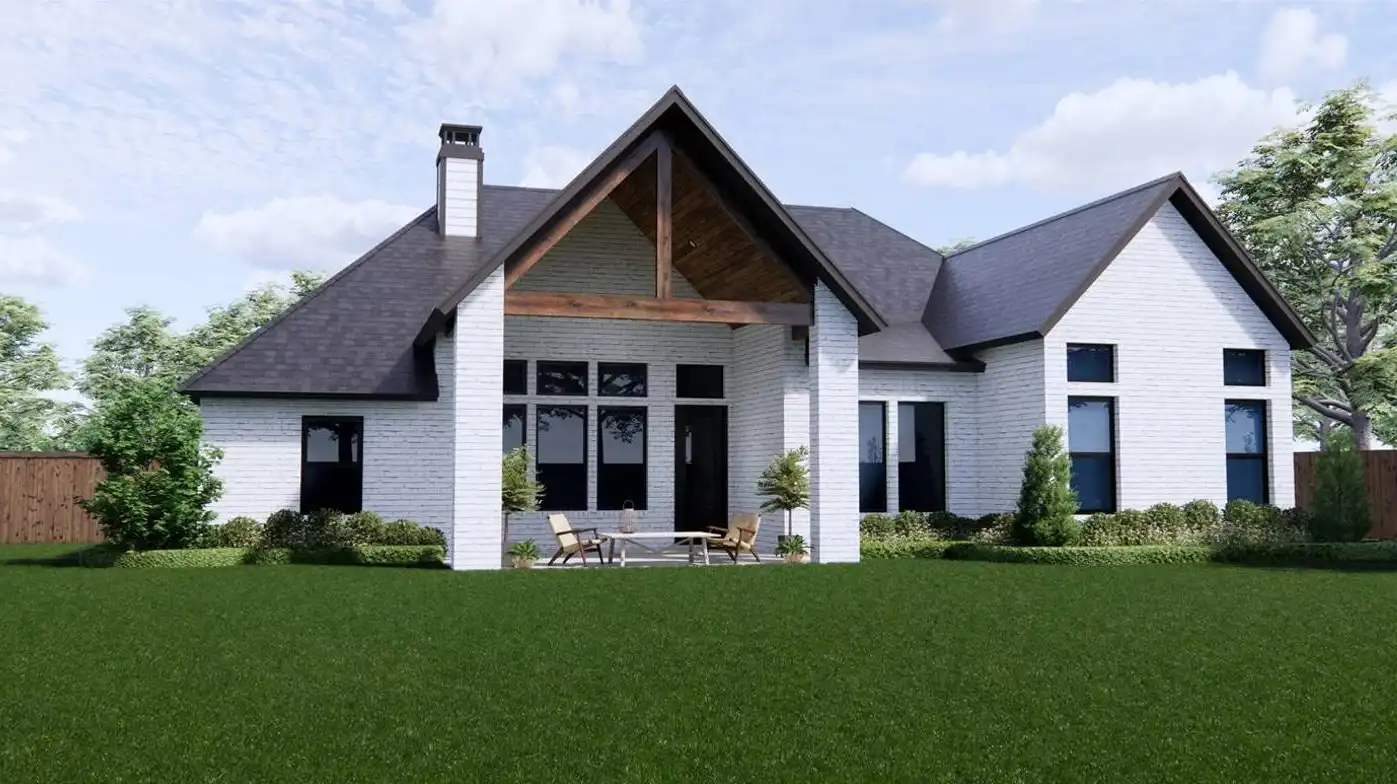 Stop and take a look at House Plan 9251! This transitional Mediterranean home stands out from the crowd with its unique square turret feature, brick exterior, and wood features. Inside, you'll enjoy 1,952 square feet with four split bedrooms and two bathrooms on one story. There's also open-concept living that visually connects the island kitchen, family room, and dining area. Don't overlook the vaulted outdoor space in back, either. It's rare to find so much packed into a home of this size and architectural style!